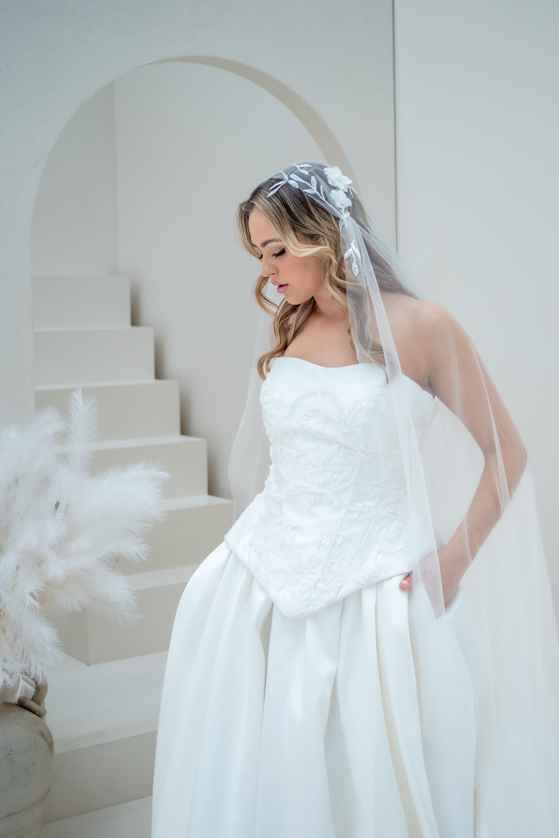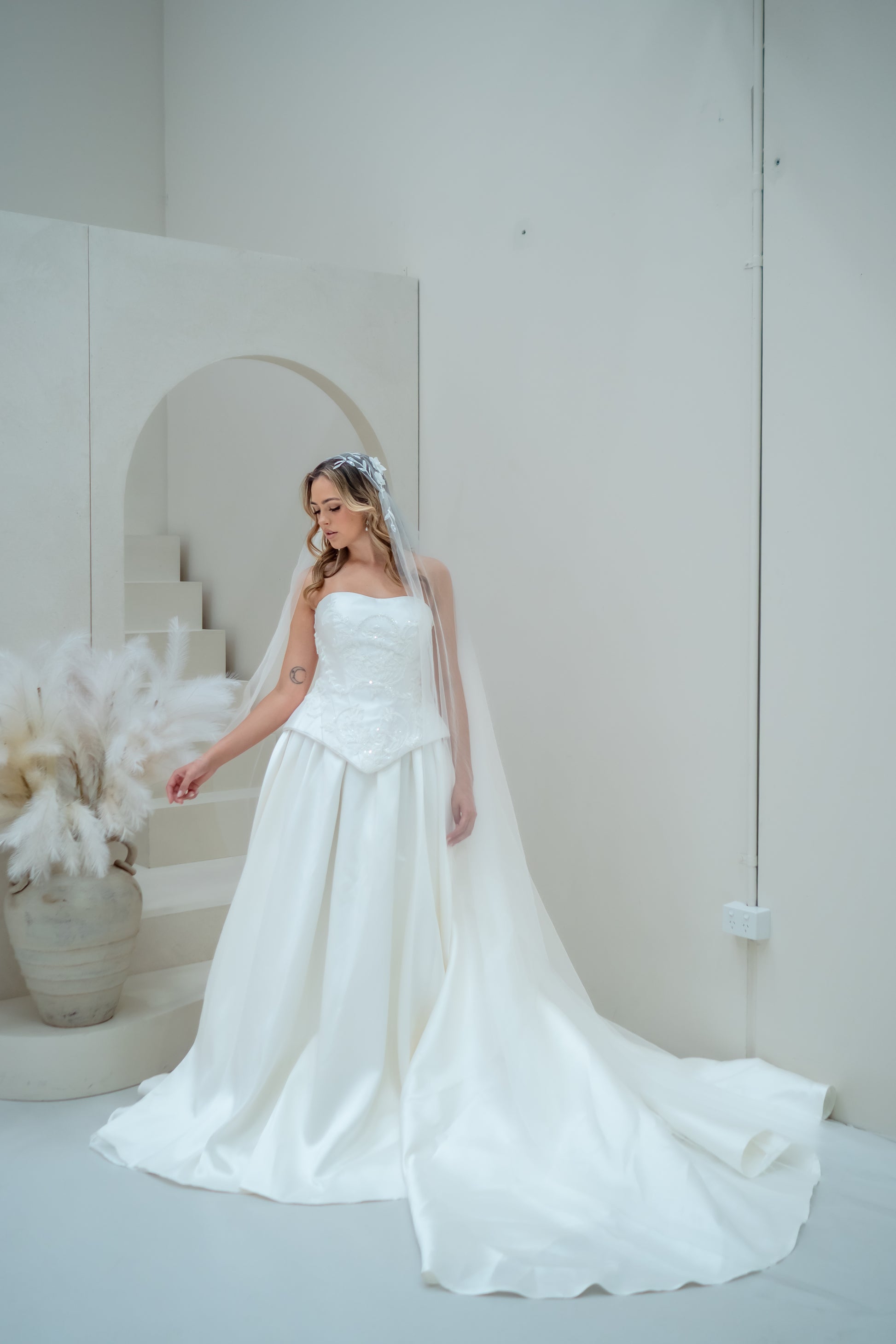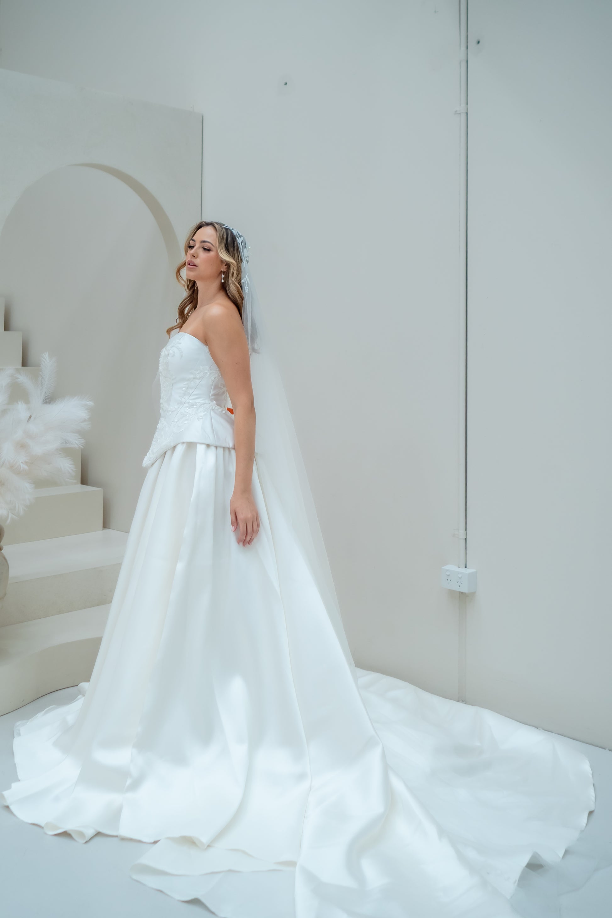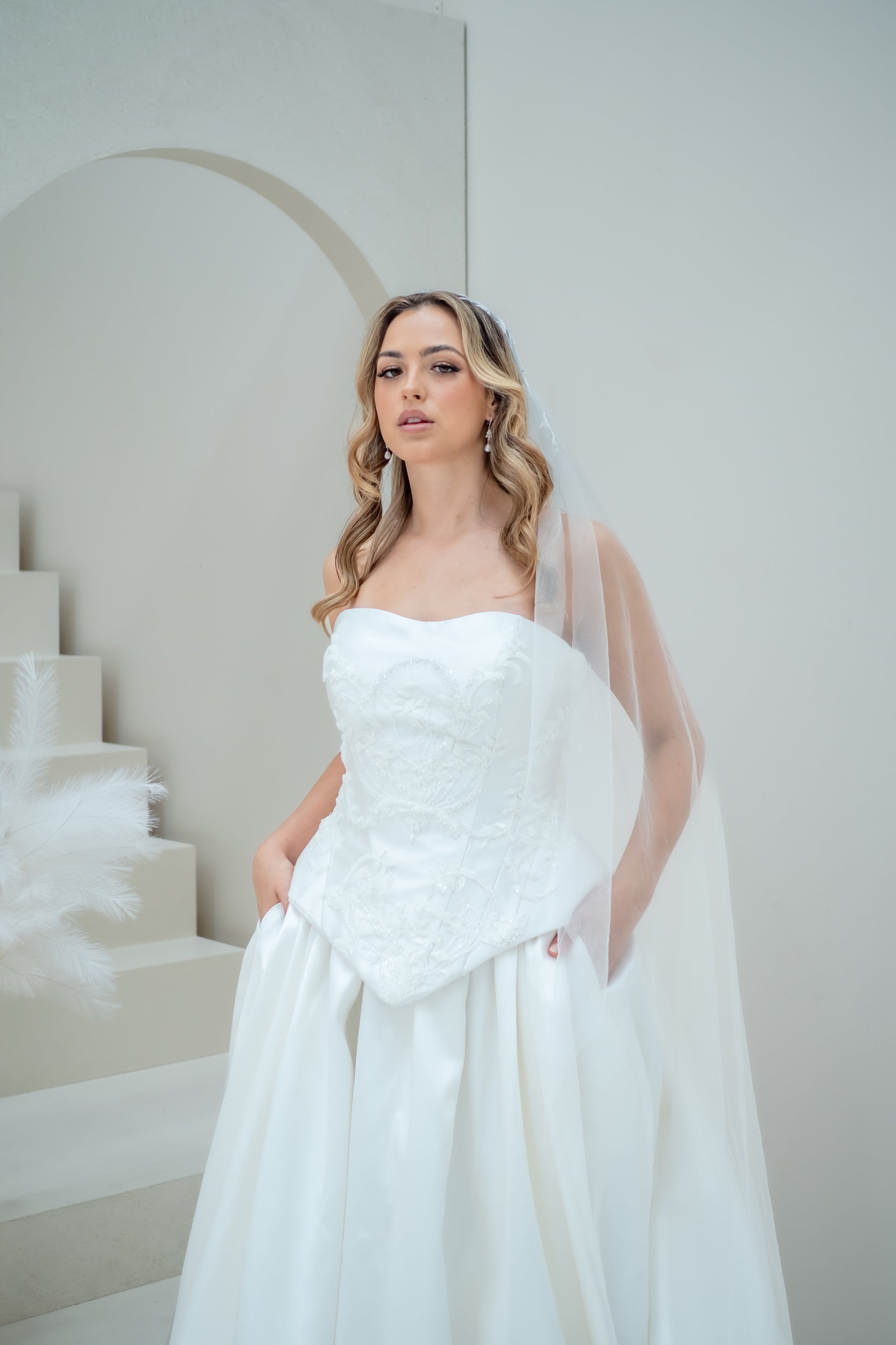 The architectural beauty of the top flows seamlessly into a voluminous ballgown skirt, crafted from luxurious, heavy-weight satin that catches the light with every step. For the modern woman on the go, we’ve integrated discreet side pockets—perfect for keeping your essentials close without compromising the gown’s clean lines. Whether you’re gliding down a minimalist aisle or posing against an abstract backdrop, ALESSIA is the ultimate statement of chic, functional luxury.