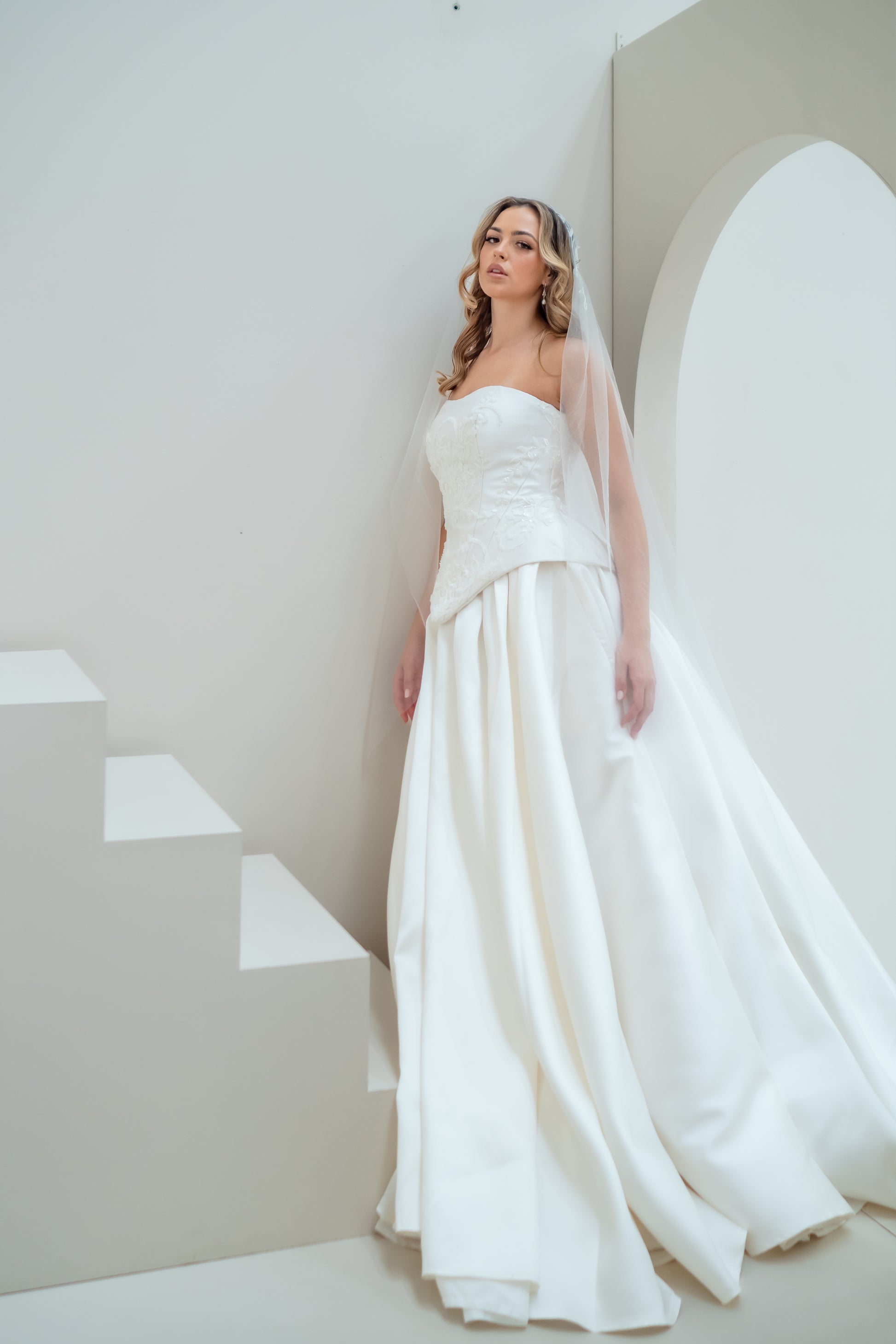 Step into a new era of bridal sophistication with ALESSIA, a breathtaking two-piece wedding dress designed for the bride who values both high-fashion structure and effortless functionality. This ensemble features a meticulously tailored strapless corset bodice with a sculptural, curved hemline that offers a contemporary twist on the classic princess silhouette.