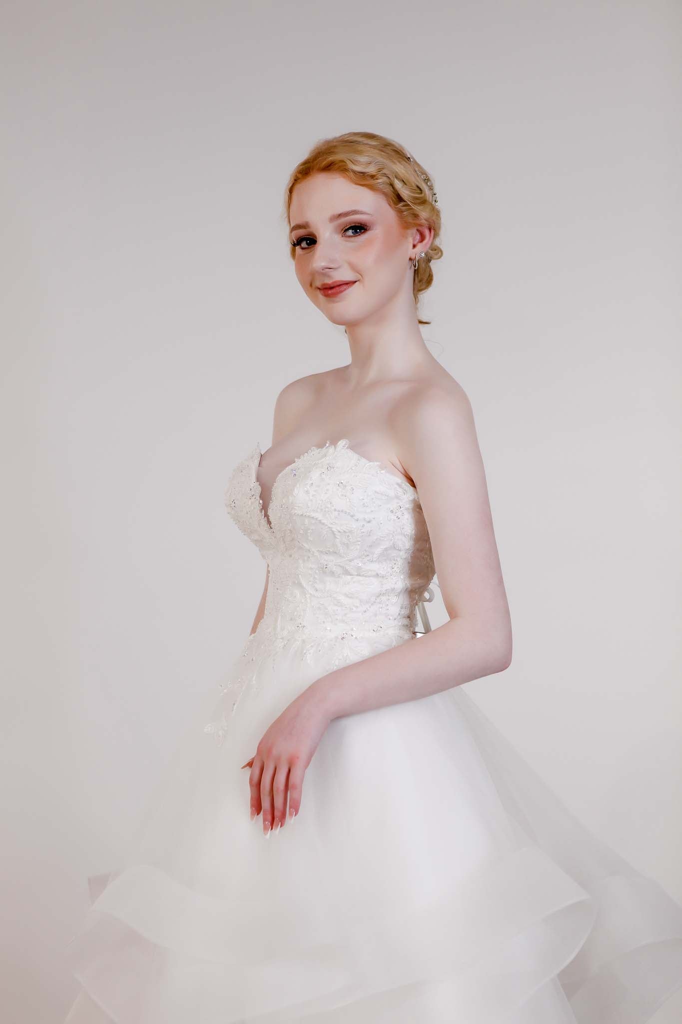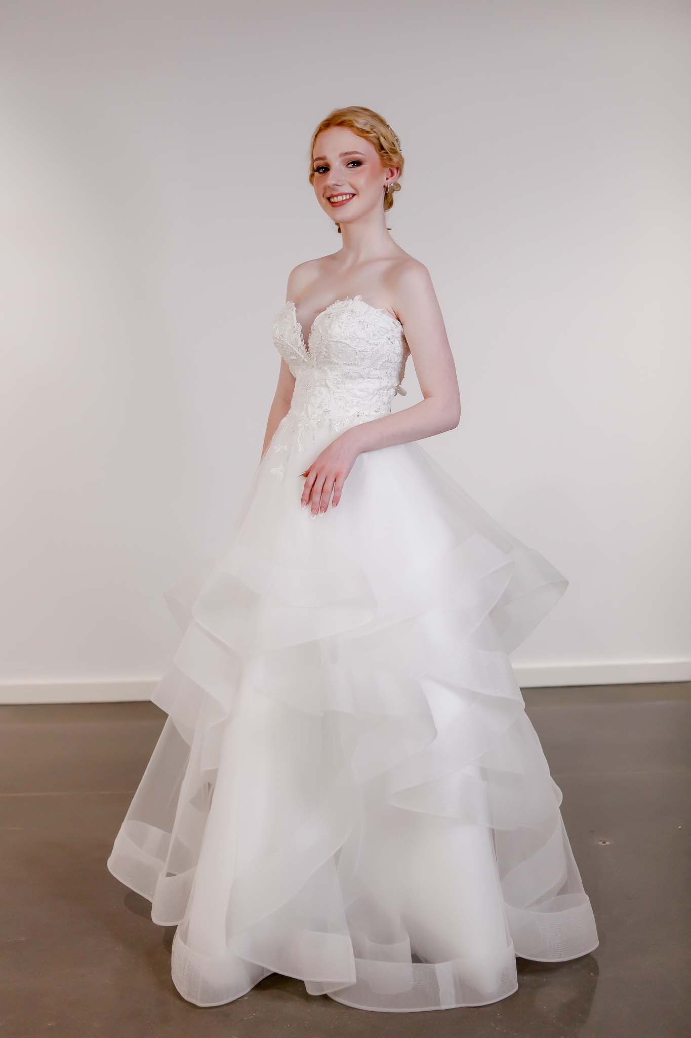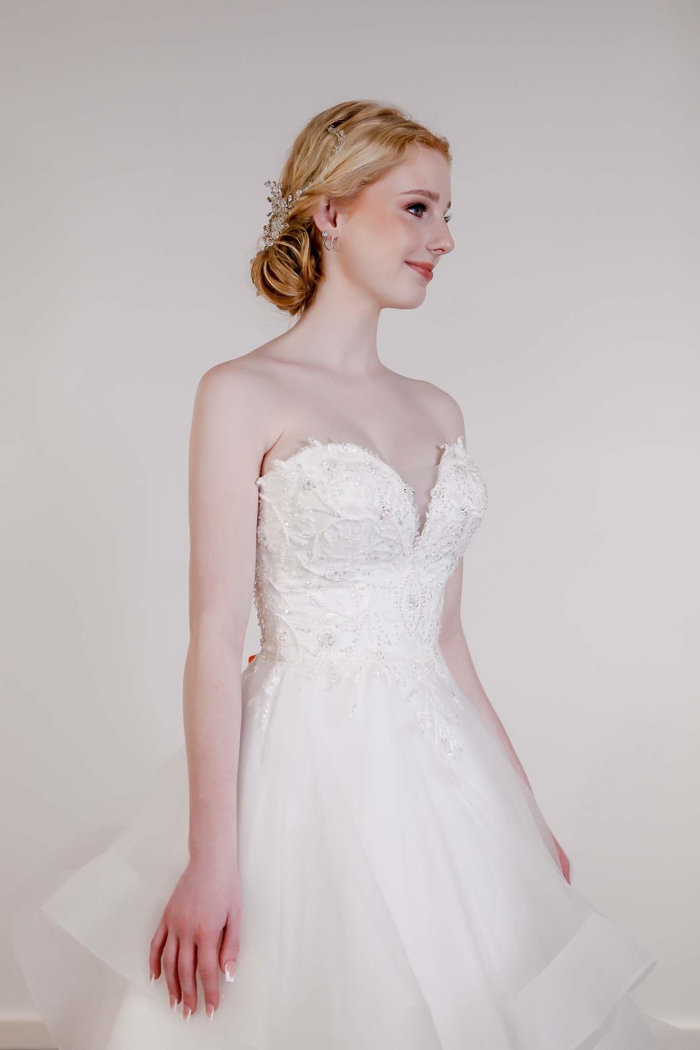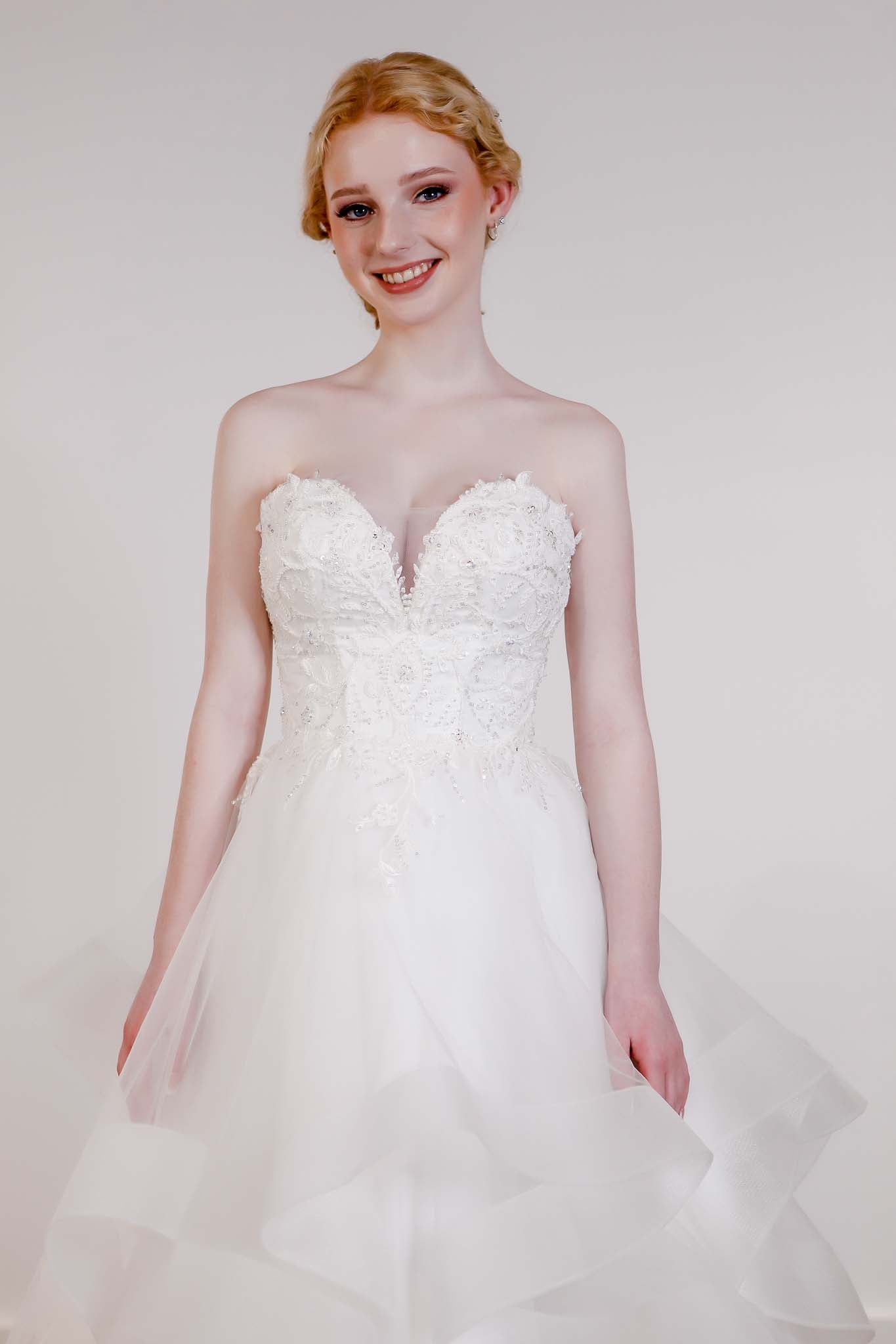 Designed for a truly magical entrance, the Alexia gown features a plunge V sweetheart neckline and a bodice adorned with beaded floral lace appliqués that gracefully extend past the waist. The full ruffle skirt brings volume and movement, while the corset back ensures a flawless, custom fit. A dreamy choice for debutantes who want to feel both elegant and enchanting.
