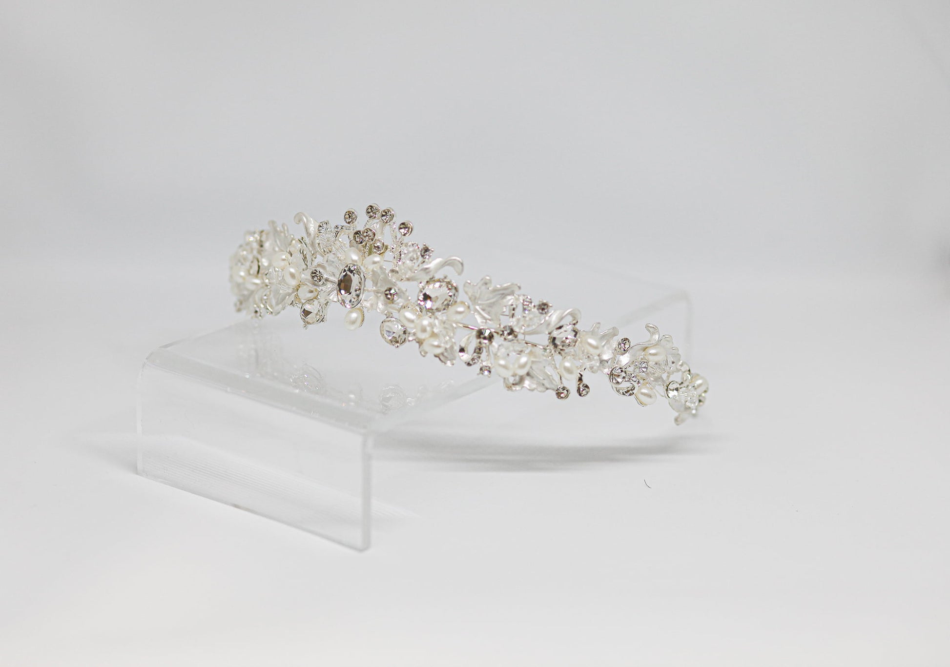 - Design: A floral-inspired headband with pearls, crystals, and intricate wirework.