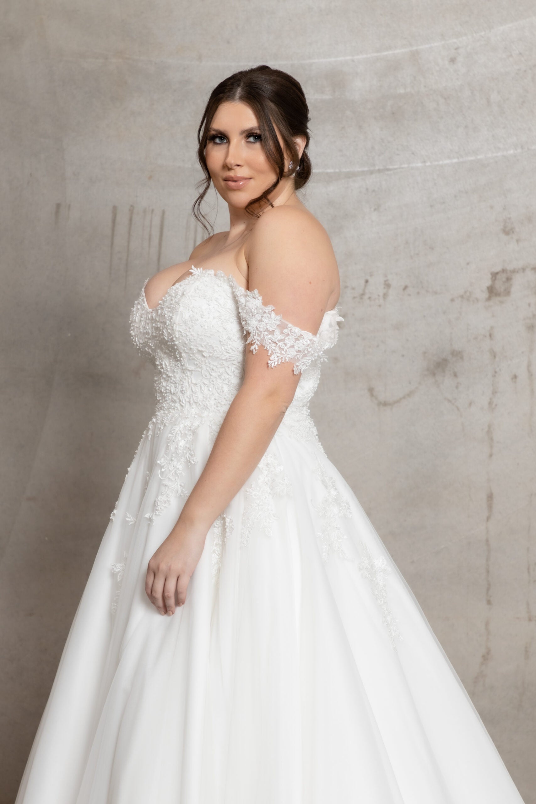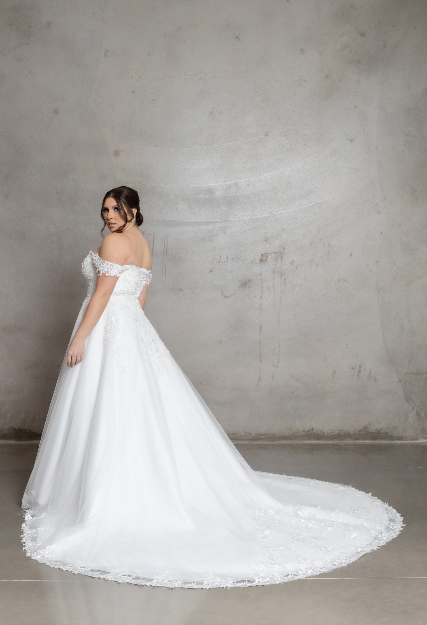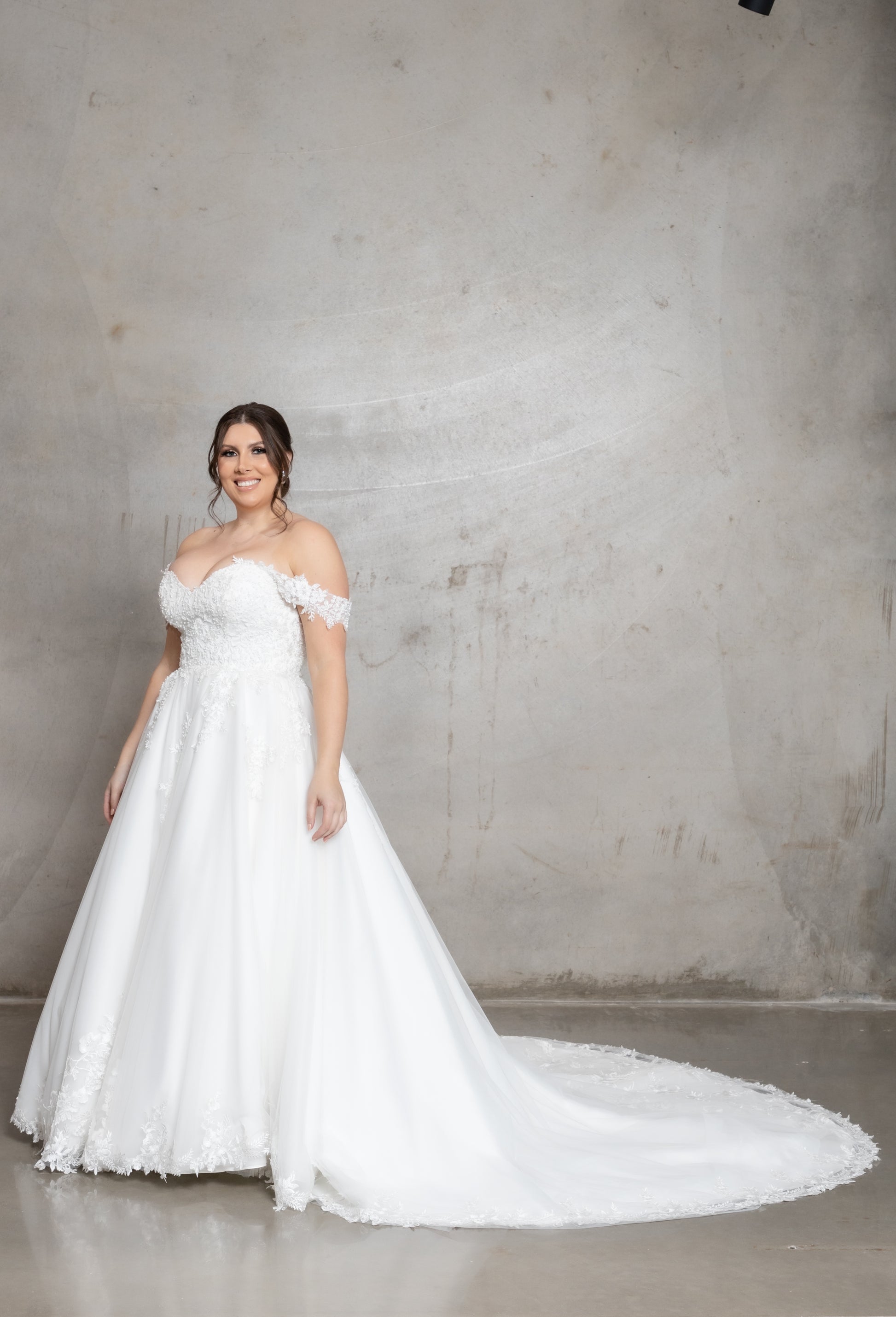 Introducing 'Allison' by Jullia Bridal, an exquisite A-line wedding dress that epitomizes classic elegance with modern touches. Designed for brides seeking timeless sophistication, this gown features an off-the-shoulder neckline adorned with delicate lace appliqués, embodying romance and refinement. Crafted from luxurious fabrics, 'Allison' highlights a flattering silhouette that elegantly flows from a cinched waist to a sweeping train, perfect for a grand entrance.