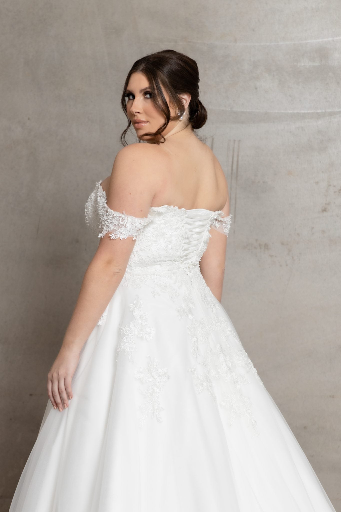- NECKLINE: Off-the-shoulder neckline with delicate lace appliqués