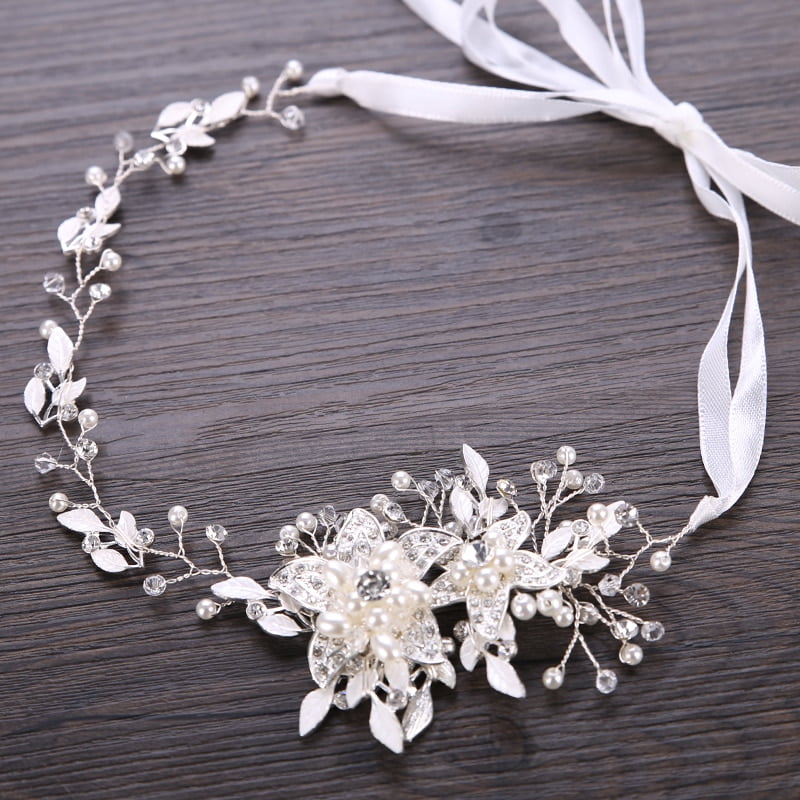 A romantic and delicate Alyssa rhodium floral bridal hair vine that is made from metal hand painted flowers, pearls and rhinestones. A beautiful spring wedding headpiece for a bride. An exclusive bridal headpiece to add that finishing touch to your bridal look. Available in rhodium colour with shimmering quality rhinestones and pearls. Comes with white ribbon ties.