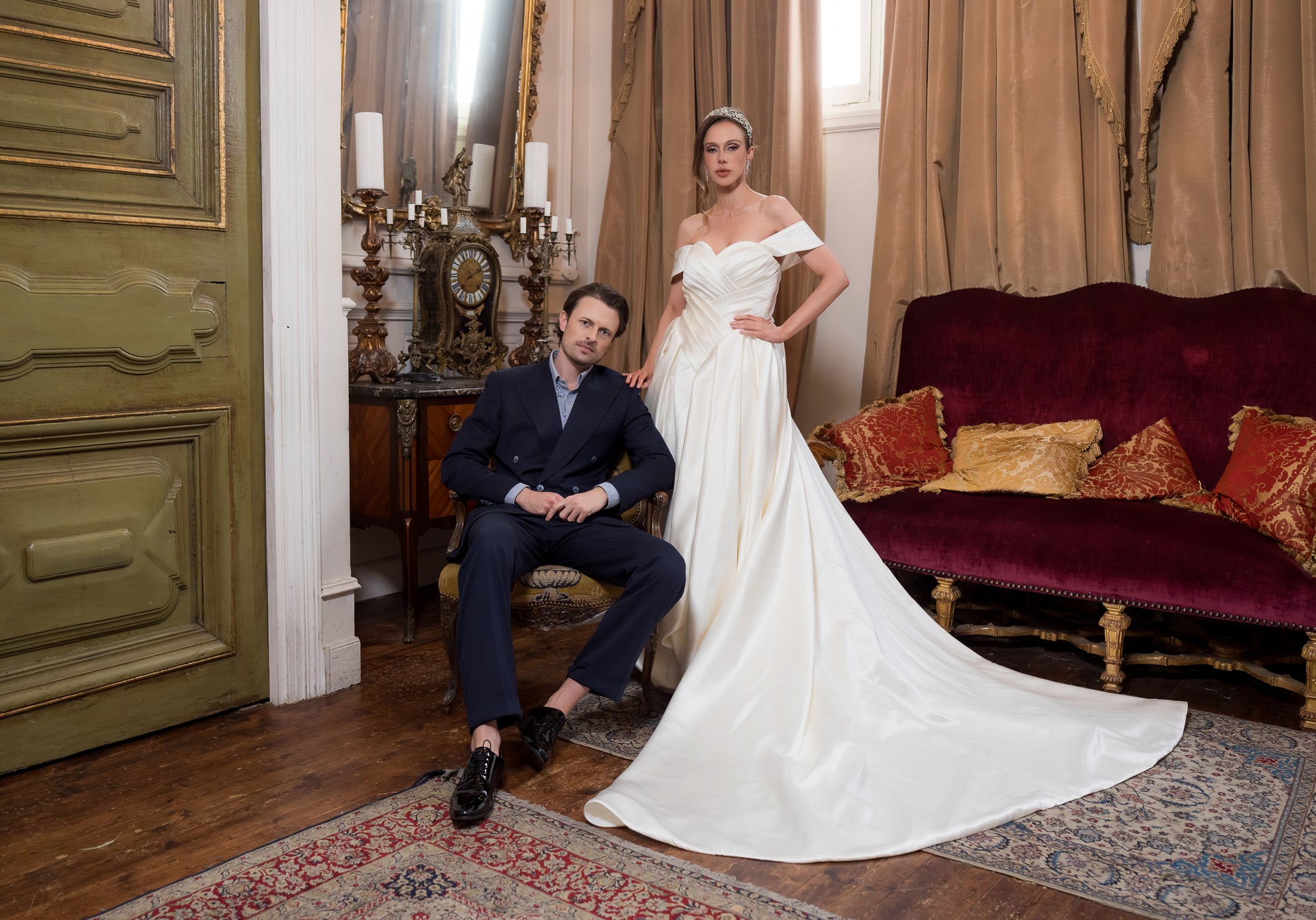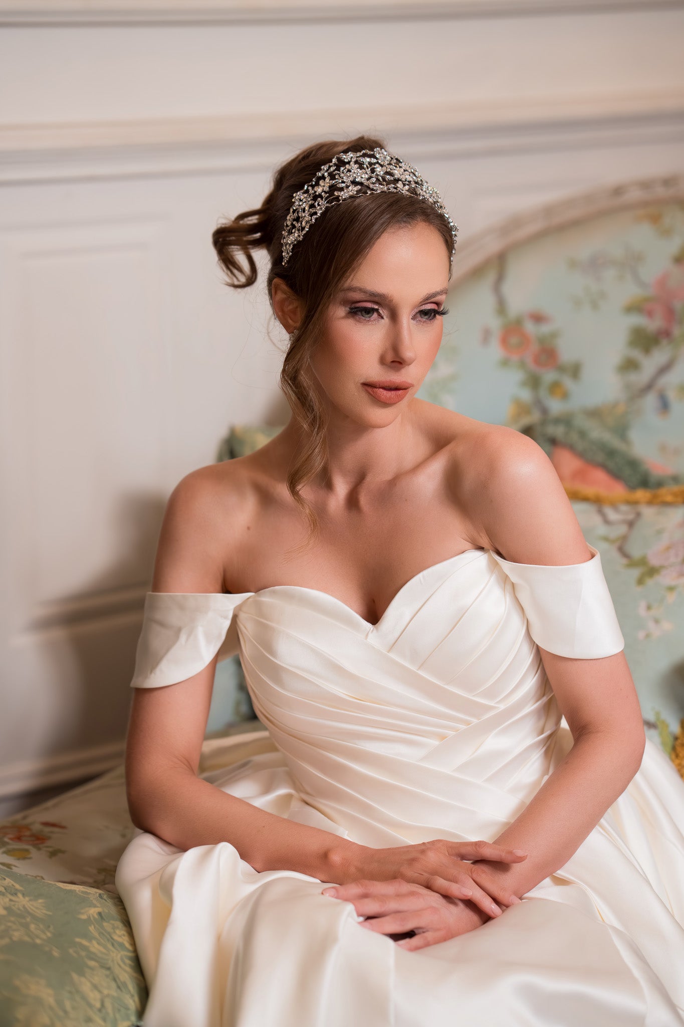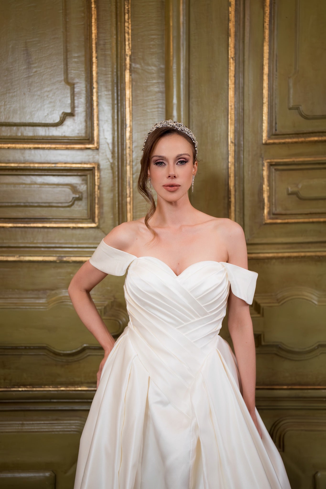 Radiate timeless romance with our Amoria wedding dress — a vision of grace, sophistication, and bridal elegance. Designed with an off-the-shoulder neckline and a beautifully structured bodice, Amoria accentuates the feminine silhouette while exuding effortless charm. The luxurious satin fabric drapes into a dramatic full skirt and flowing train, creating a truly regal presence as you walk down the aisle. Perfect for brides seeking a classic yet modern fairytale look, this gown blends luxury and romance in perfect harmony. If you’re dreaming of a dress that makes you feel like the leading lady of your own love story, Amoria is the one to try — its timeless beauty is even more breathtaking in person.