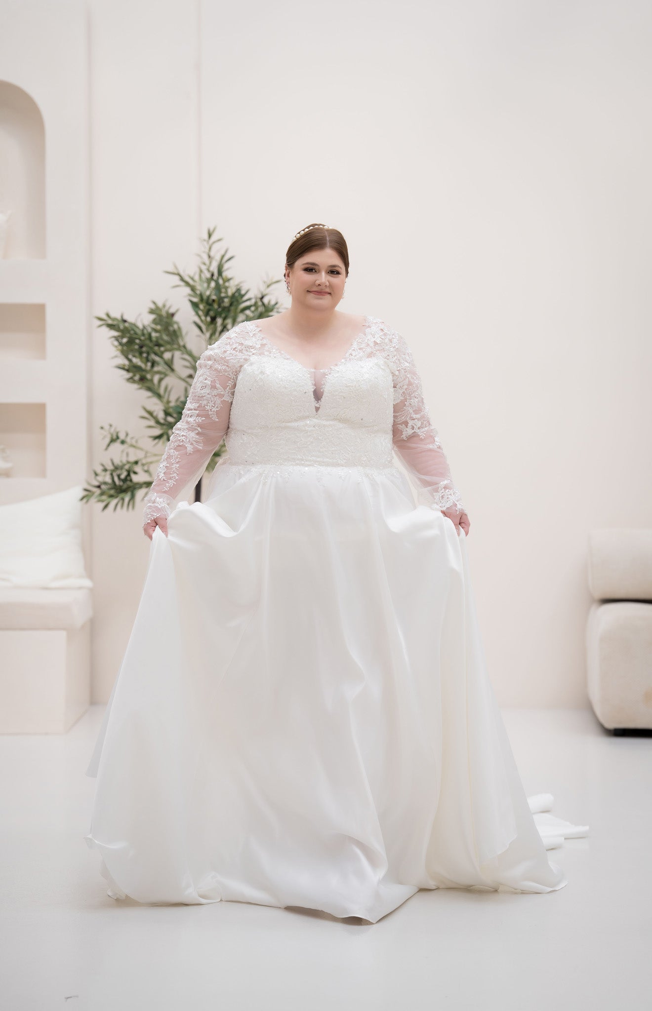 Embrace your inner royalty with ANNICA, a stunning A-line wedding dress masterfully designed to celebrate the plus-size bride. This gown features an exquisite illusion V-neckline that leads into intricate, long lace sleeves, offering both sophisticated coverage and timeless romance. The bodice is richly adorned with floral embroidery, tapering into a flattering cinched waist that flows into a voluminous, heavy-weight satin skirt.