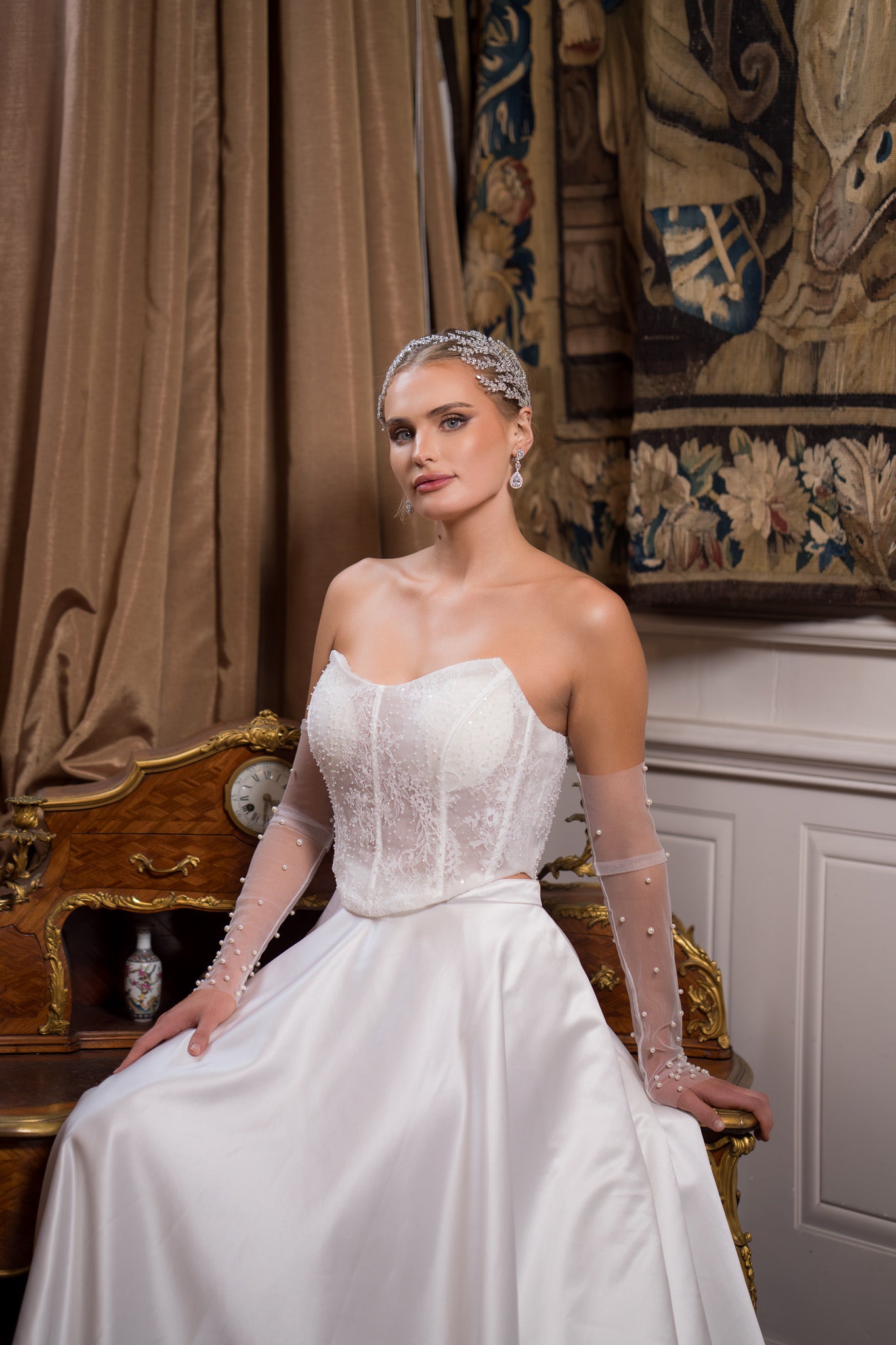 Step into effortless elegance with our Arabella wedding gown — a stunning three-piece bridal ensemble designed for the modern romantic bride. The Arabella features a flowing A-line satin skirt paired with a delicate corset top, showcasing a sheer scooped neckline adorned with fine floral lace detailing. Brides can personalize their look with matching lace detachable long sleeves or a graceful high-neck lace bolero for a more timeless touch. This versatile design offers both sophistication and softness, perfect for brides seeking a balance of classic beauty and modern charm. If you’re dreaming of a wedding dress that feels uniquely yours, Arabella is the perfect choice to try — its delicate craftsmanship and feminine silhouette will make you fall in love the moment you put it on.