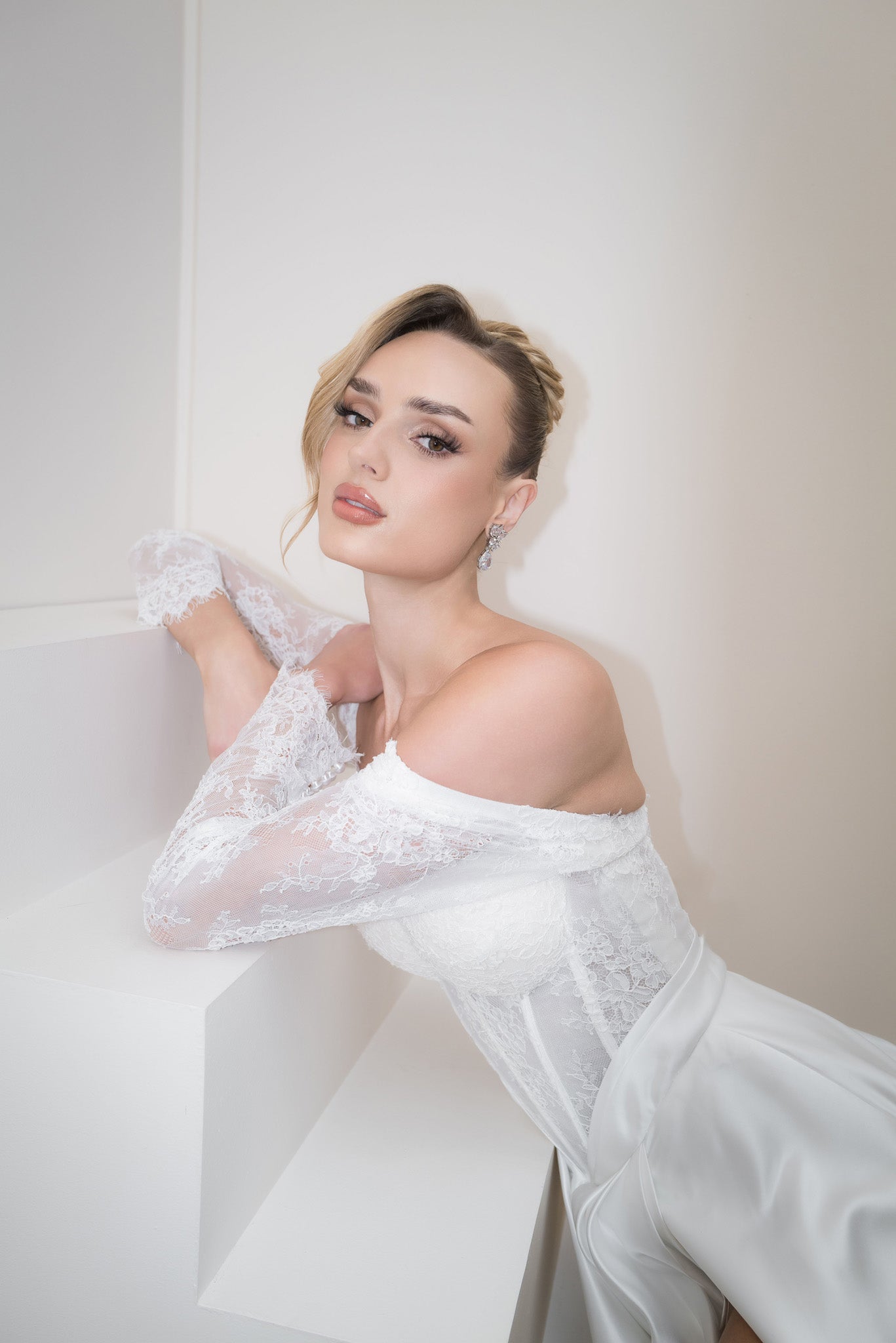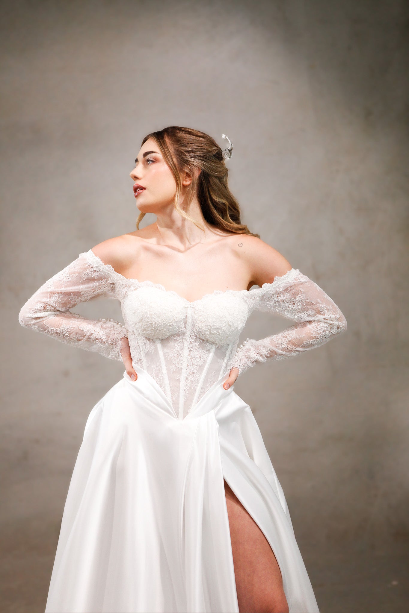 Meet Scottie A masterfully crafted ballgown that exemplifies the pinnacle of bridal couture design. This enchanting piece features a romantically designed off-the-shoulder bodice with dreamy full-length illusion lace sleeves, showcasing delicate lacework that whispers pure elegance with every detail. The flattering sweetheart neckline with precision-fitted boning lovingly enhances your silhouette while ensuring you feel beautifully supported and confident. The luxurious satin skirt creates a stunning A-line silhouette that flows like poetry in motion, while the graceful front slit adds a touch of modern allure without losing its timeless charm. Scottie features a breathtaking cathedral train that captures hearts and creates those magical processional moments you've always dreamed of. The beautiful harmony of classic bridal romance with contemporary sophistication makes this gown perfect for the bride who desires both elegance and relevance on her special day.