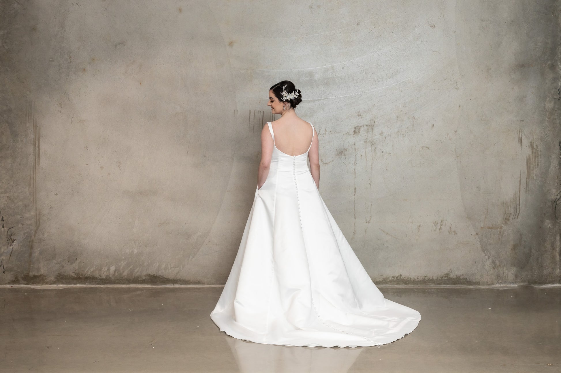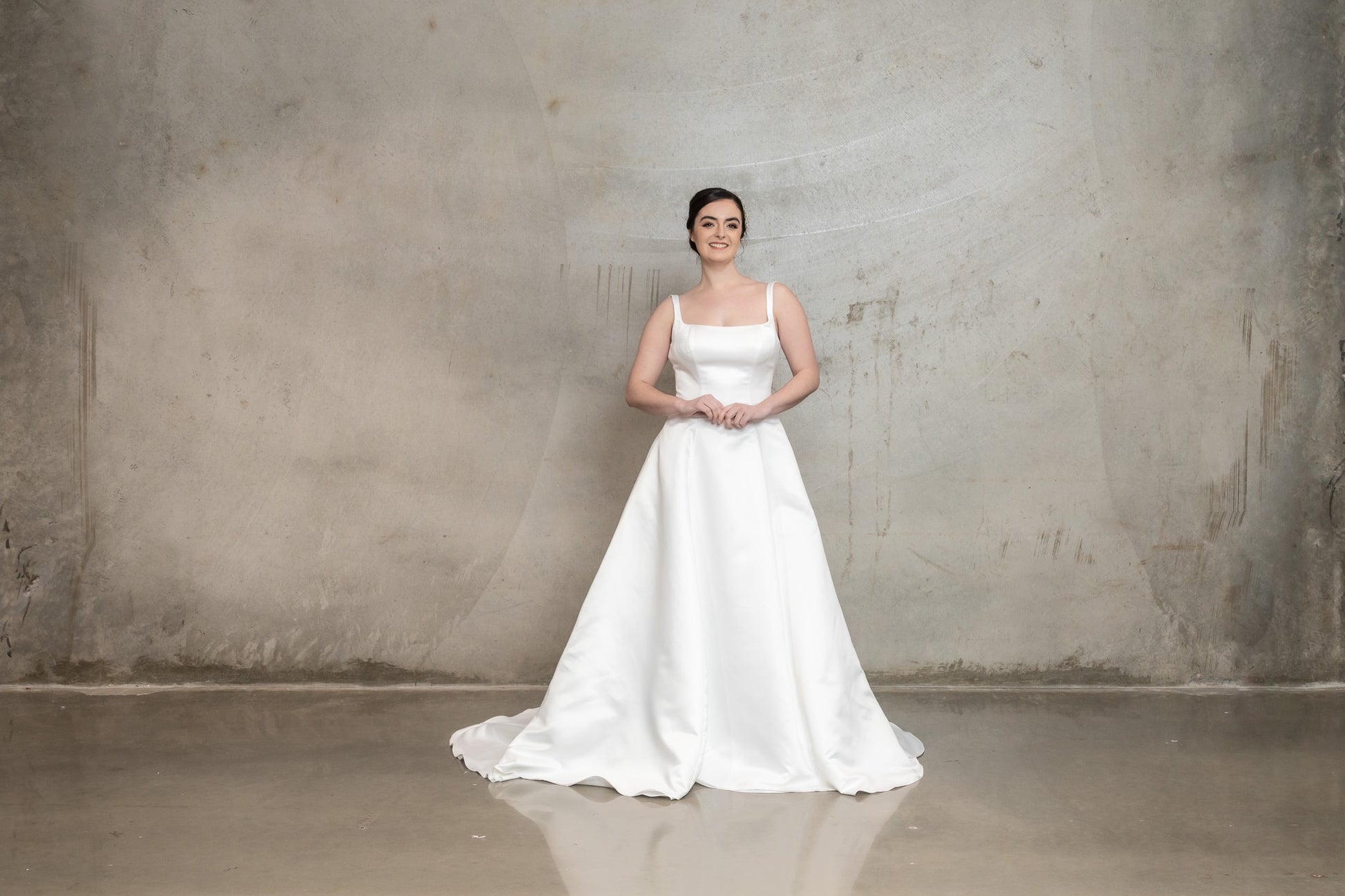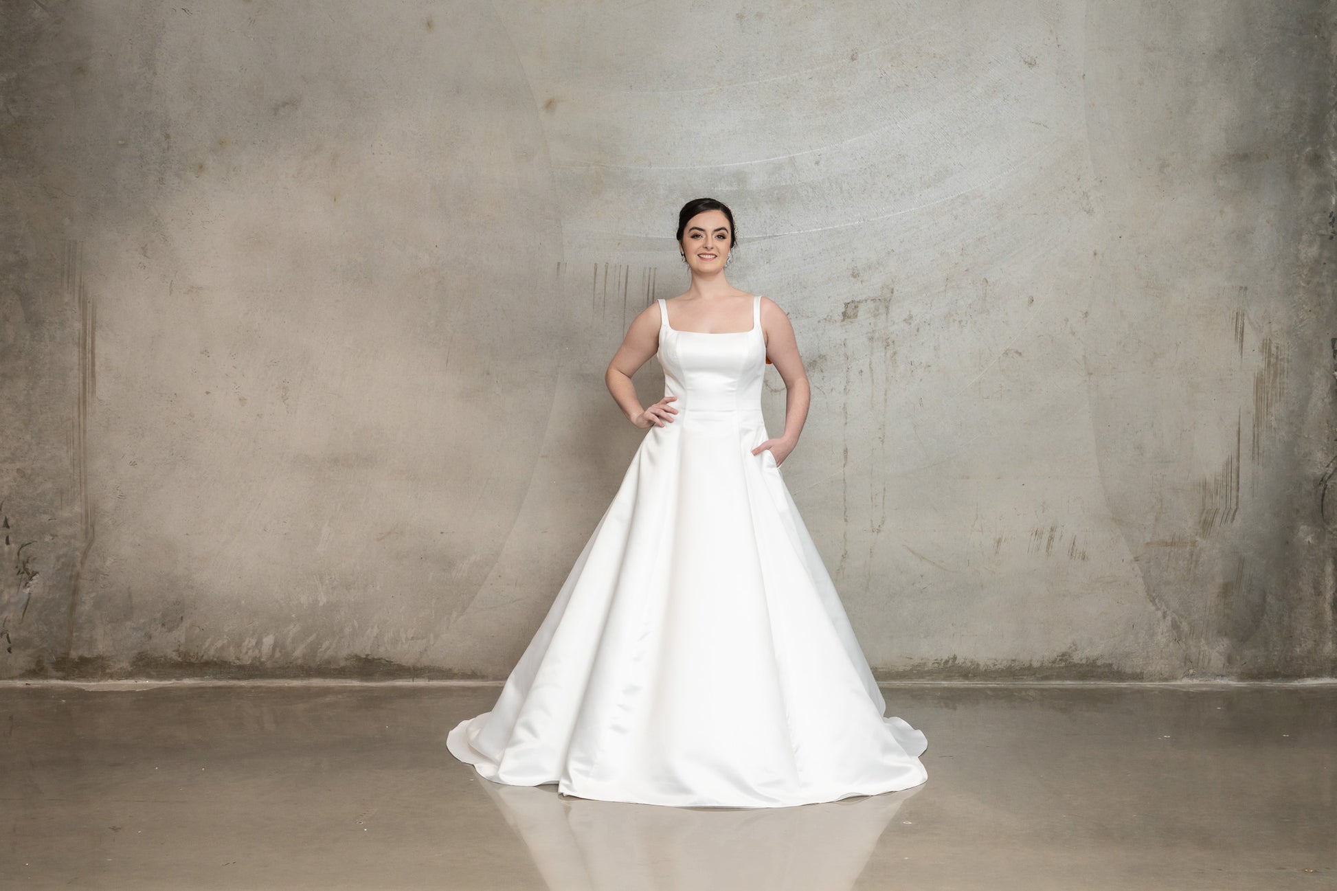"Karine" showcases a chic square neckline and a matching square back, adding a modern edge to the traditional style. This neckline beautifully frames the collarbones and lends a structured look to the gown. Additionally, invisible side pockets are seamlessly integrated, providing convenience without compromising style.