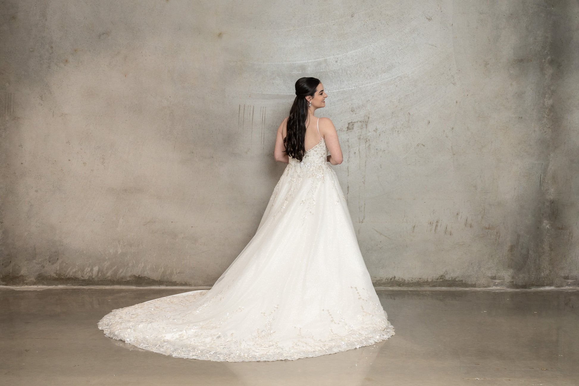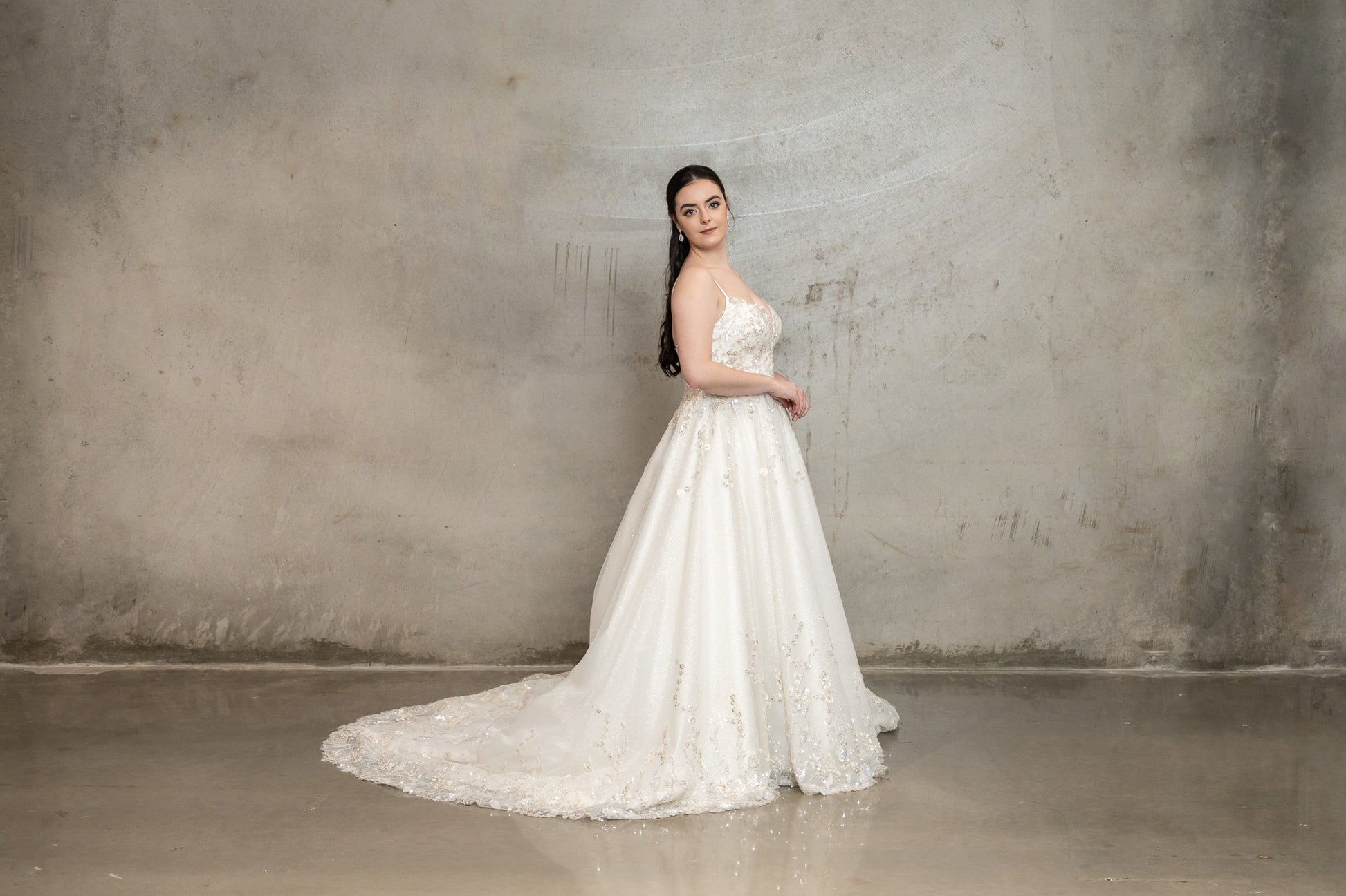 Introducing "Avelyn," a sublime bridal gown that epitomizes timeless elegance with its classic A-line silhouette. Designed for brides who adore classic style, this dress features a bodice richly adorned with ornate floral embroidery and sparkling sequins, enhancing the sweetheart neckline and highlighting the gown's femininity. The skirt flows gracefully from a cinched waist into layers of soft tulle, interspersed with delicate sequins that catch the light with every step, extending into a breathtaking train with cohesive detailing. A neatly concealed zip closure ensures a seamless fit, maintaining the gown’s elegant line while showcasing the intricate lace and sequins on the train. "Avelyn" combines traditional romance with modern sophistication, making it the perfect choice for brides seeking a gown that radiates beauty and grace on their special day.