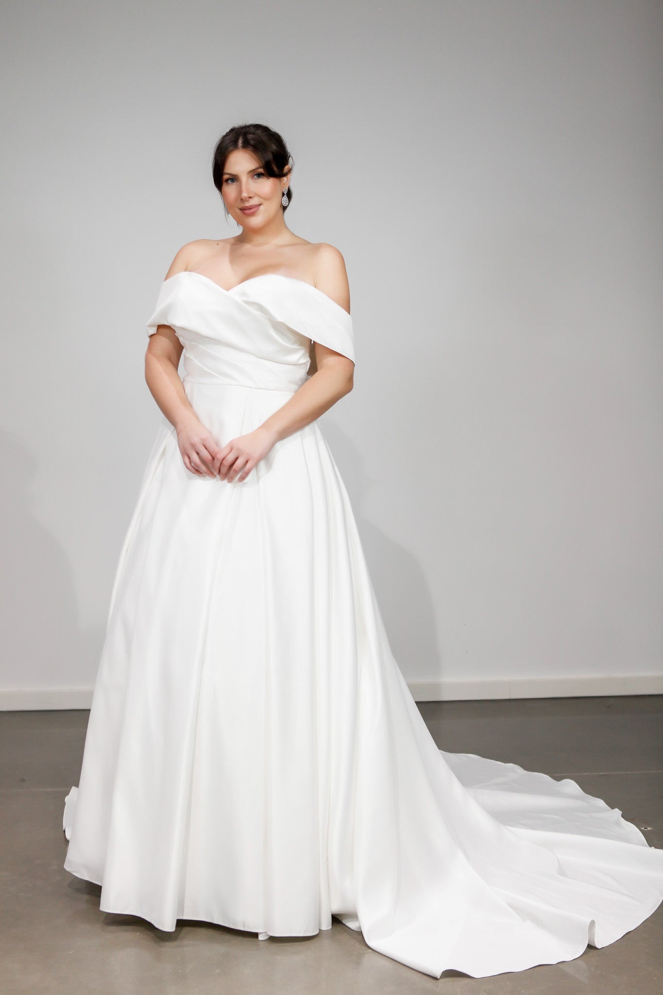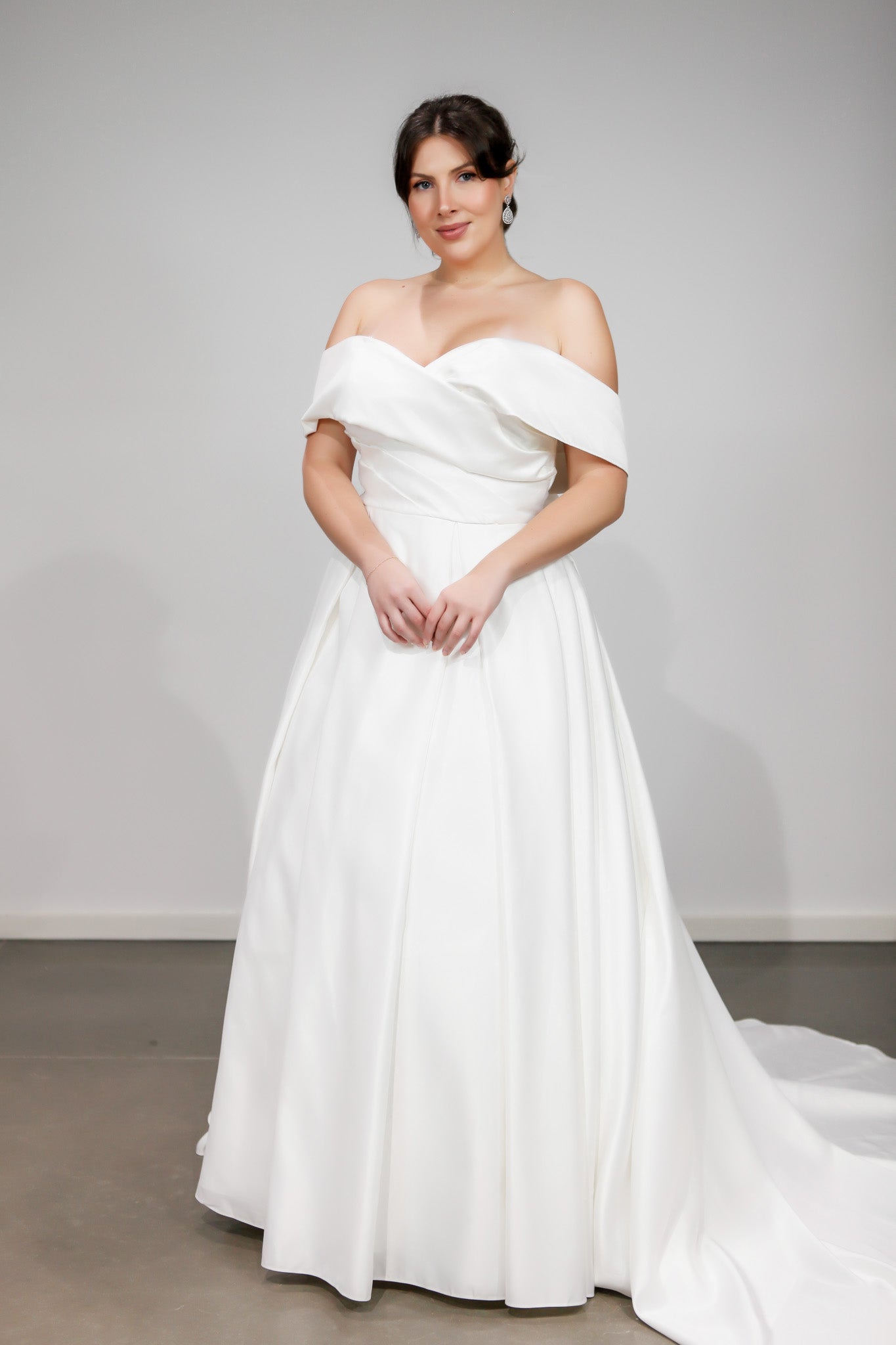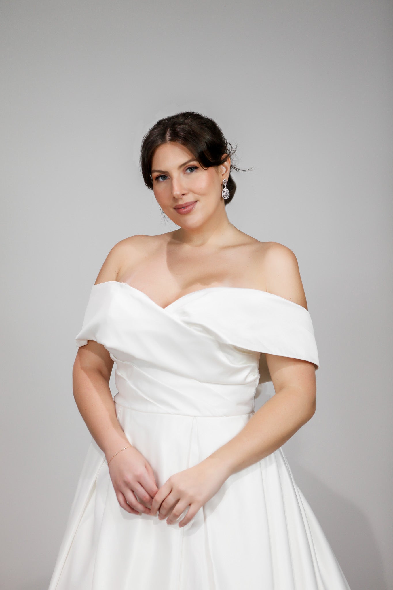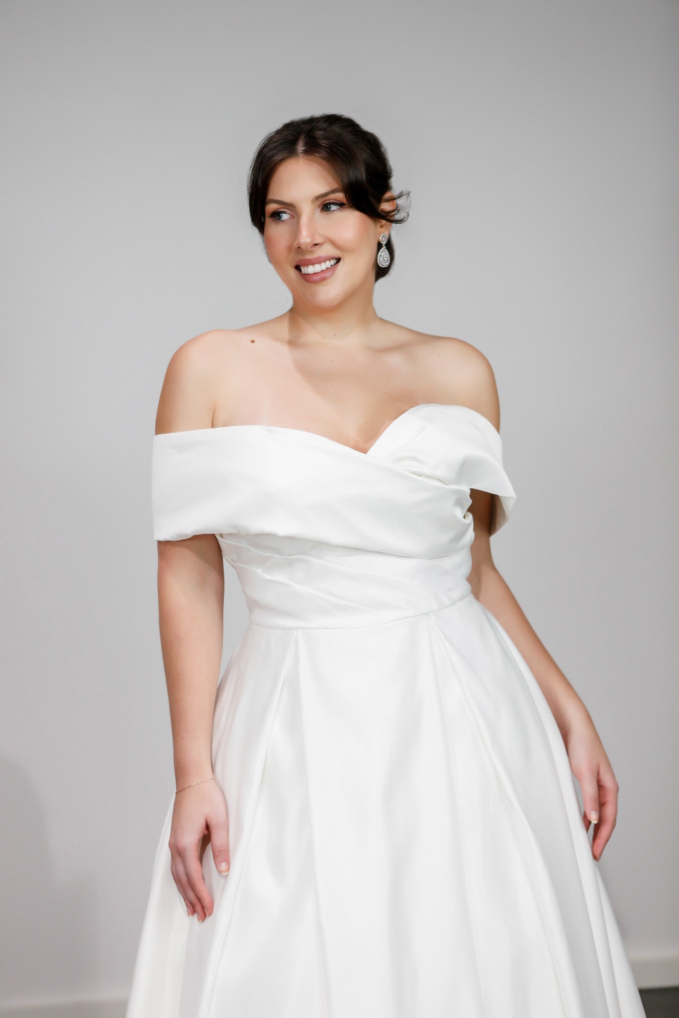 - NECKLINE: Off-the-shoulder wedding dress neckline