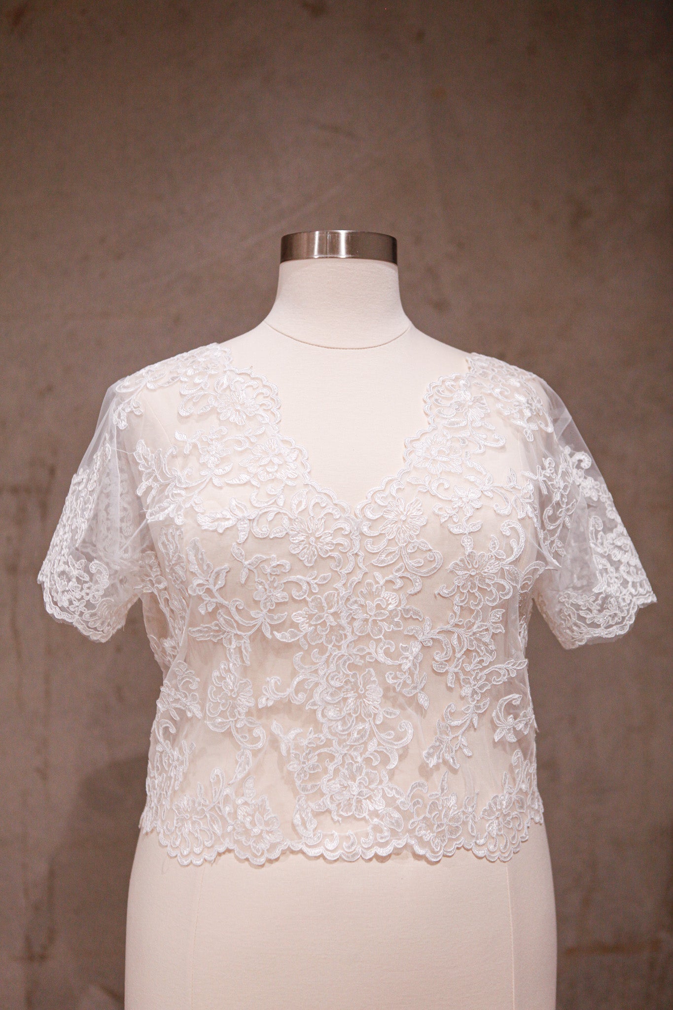 - Style: Short-sleeve lace bridal bolero