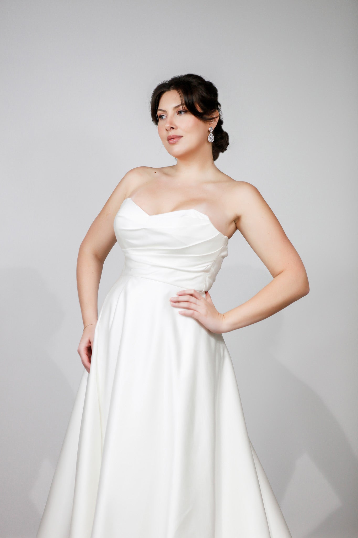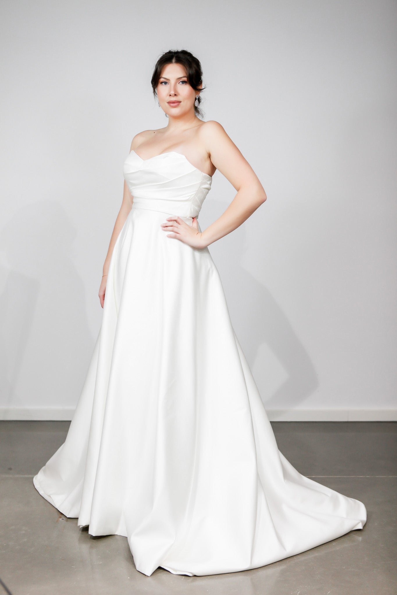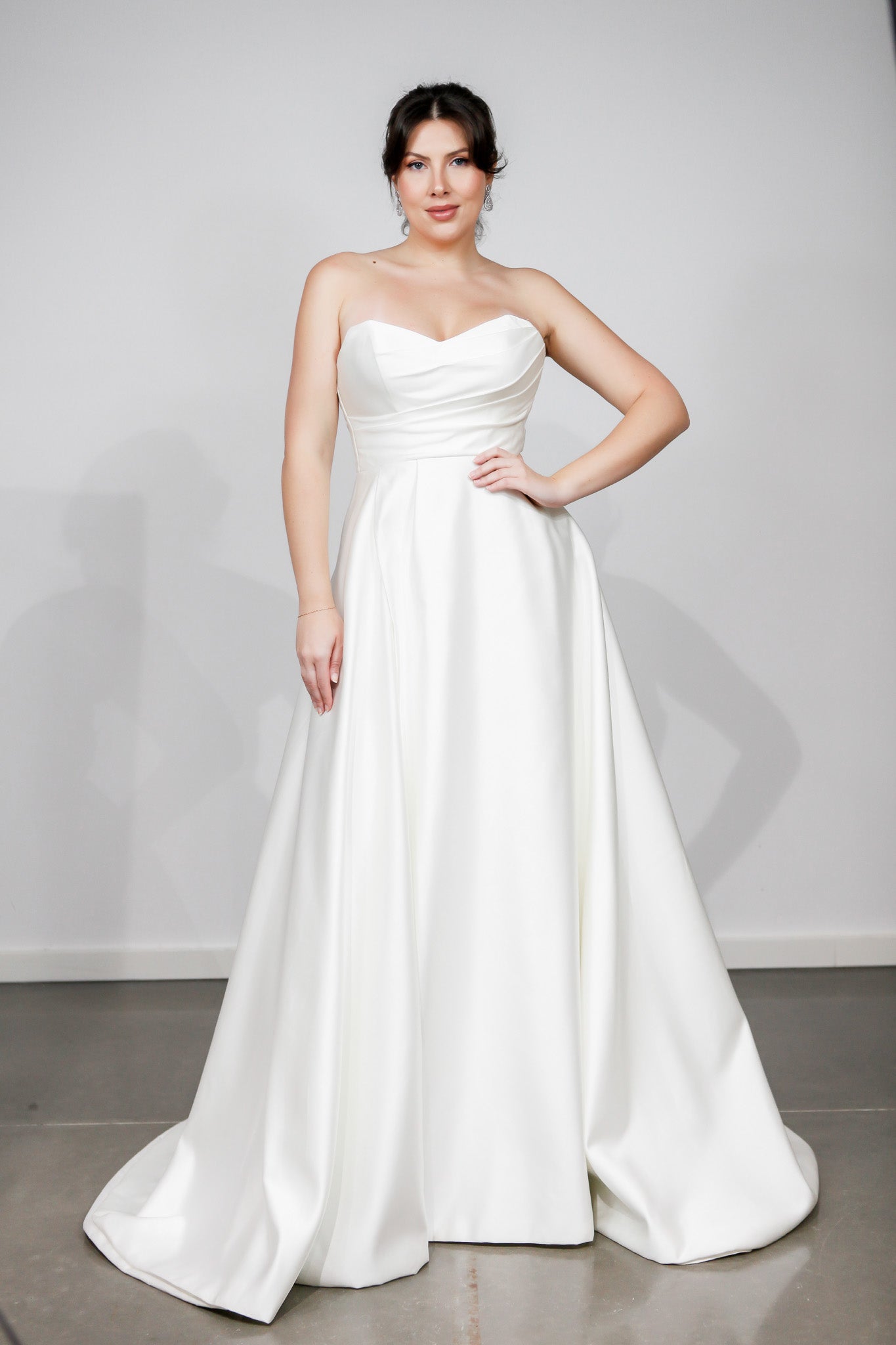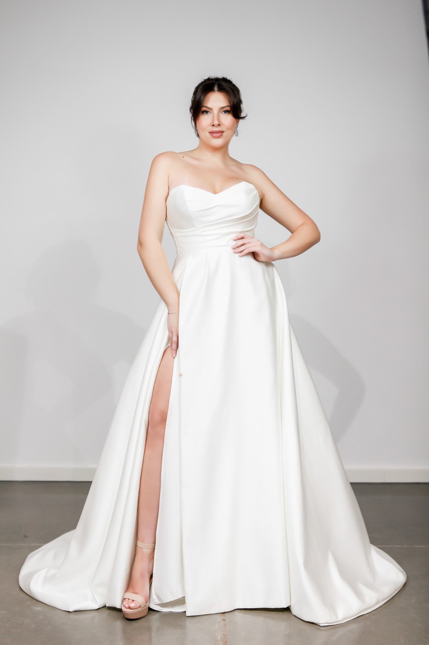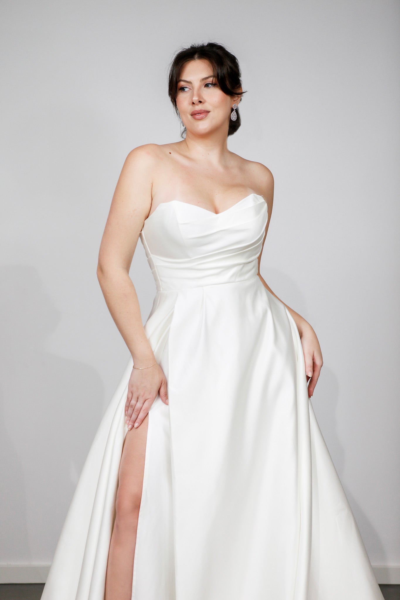 Introducing the stunning Casey wedding dress, a harmonious blend of classic elegance and modern luxury. Crafted from sumptuous satin, this A-line gown features a strapless sweetheart neckline that exudes femininity and grace. The bodice is adorned with pleated details, adding texture and sophistication, while a daring split in the skirt introduces a contemporary twist to the timeless silhouette, creating a striking visual appeal.