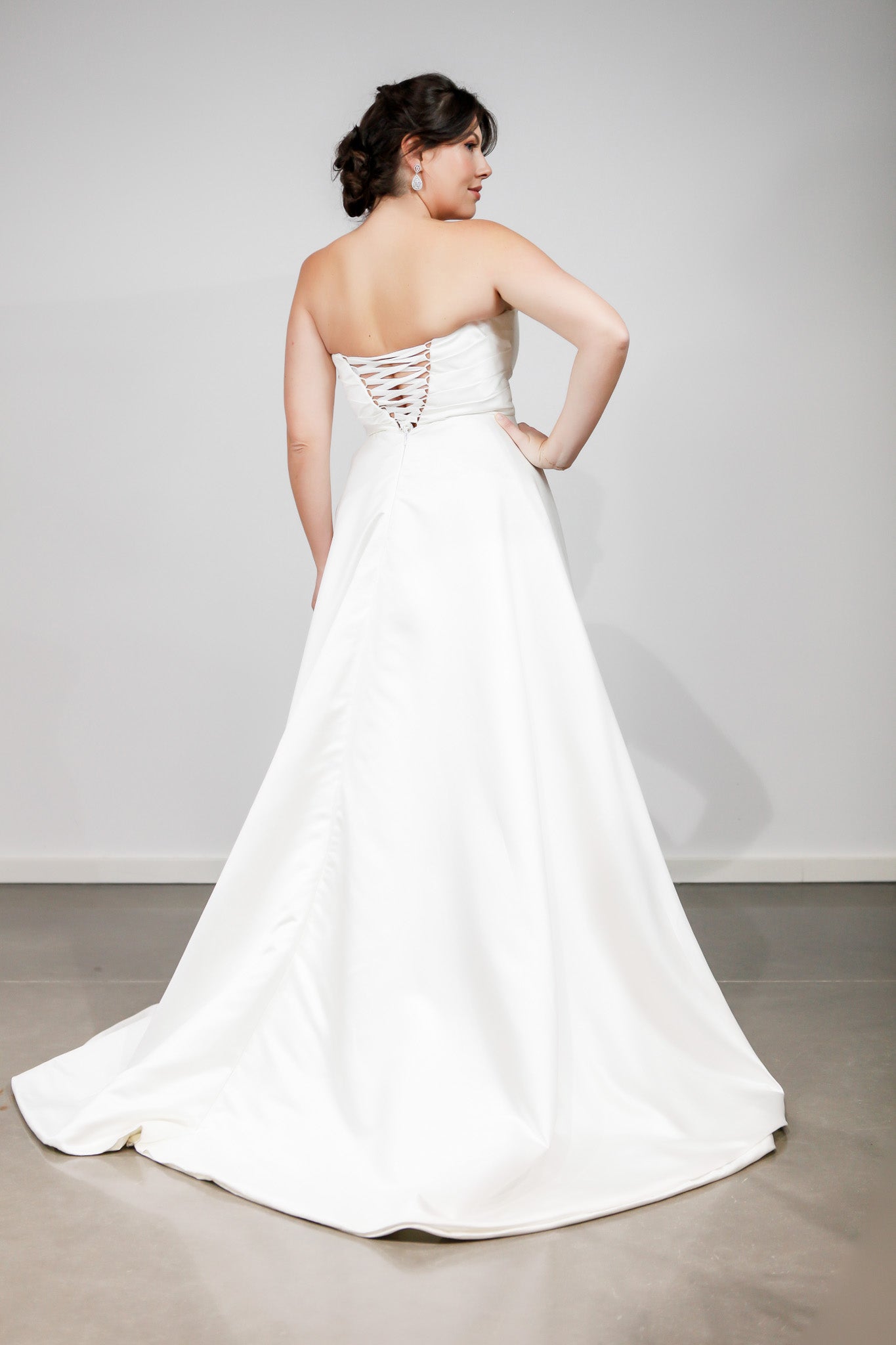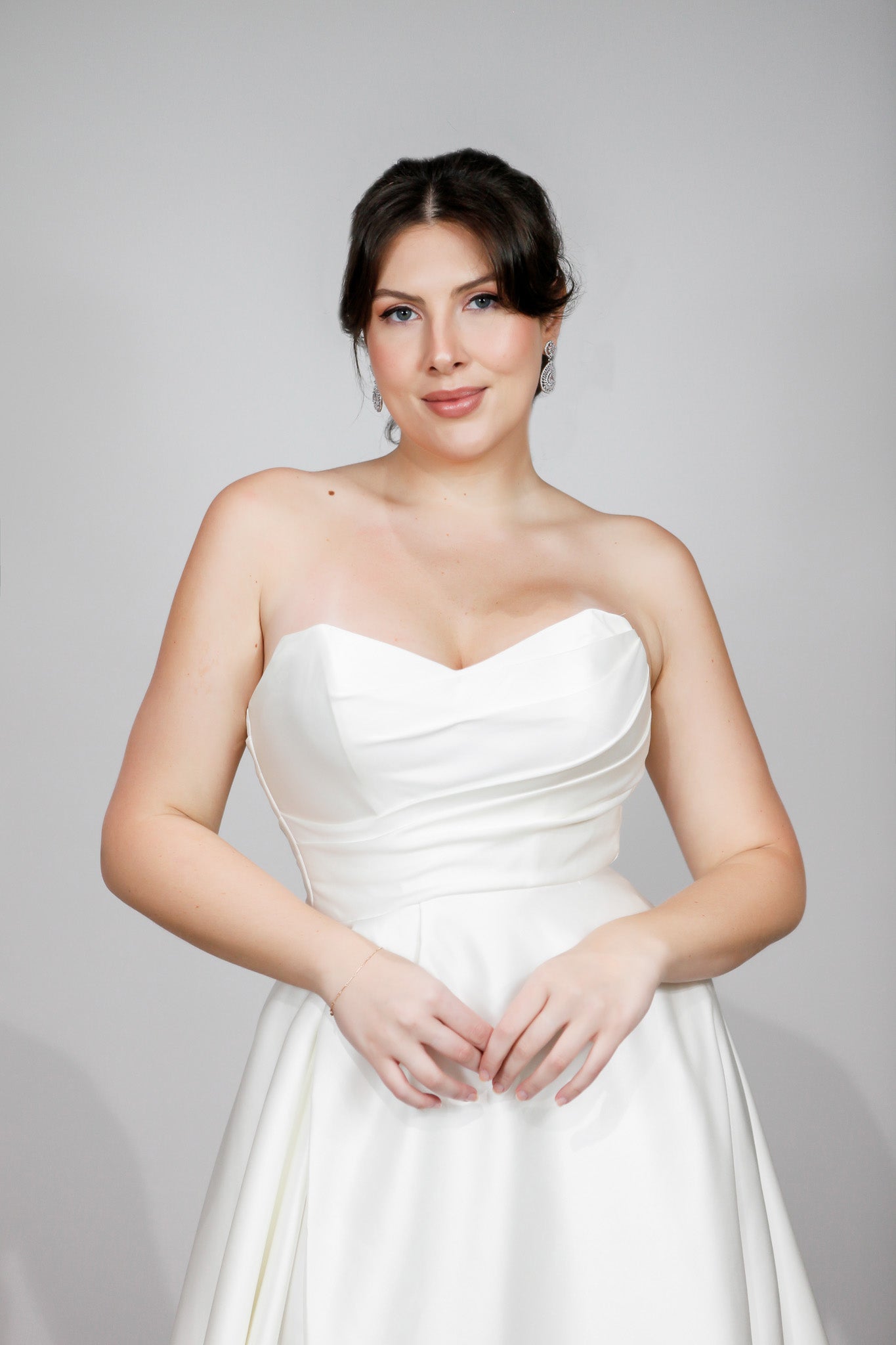 - FABRIC: Sumptuous satin with pleated bodice details