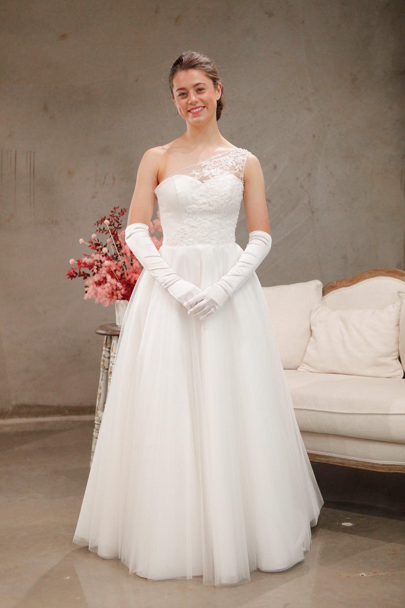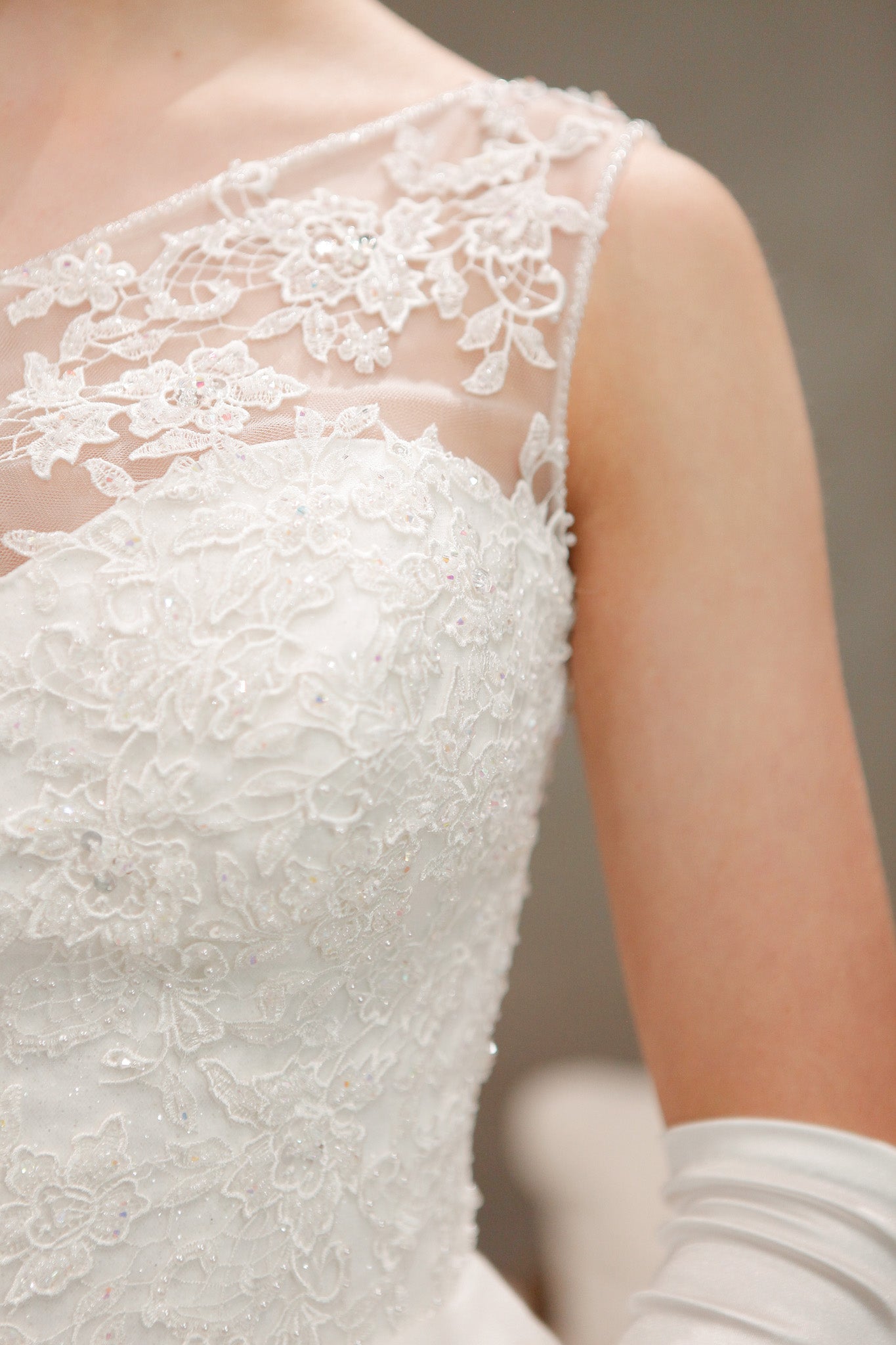 - BODICE: Floral lace continuing from the asymmetric strap