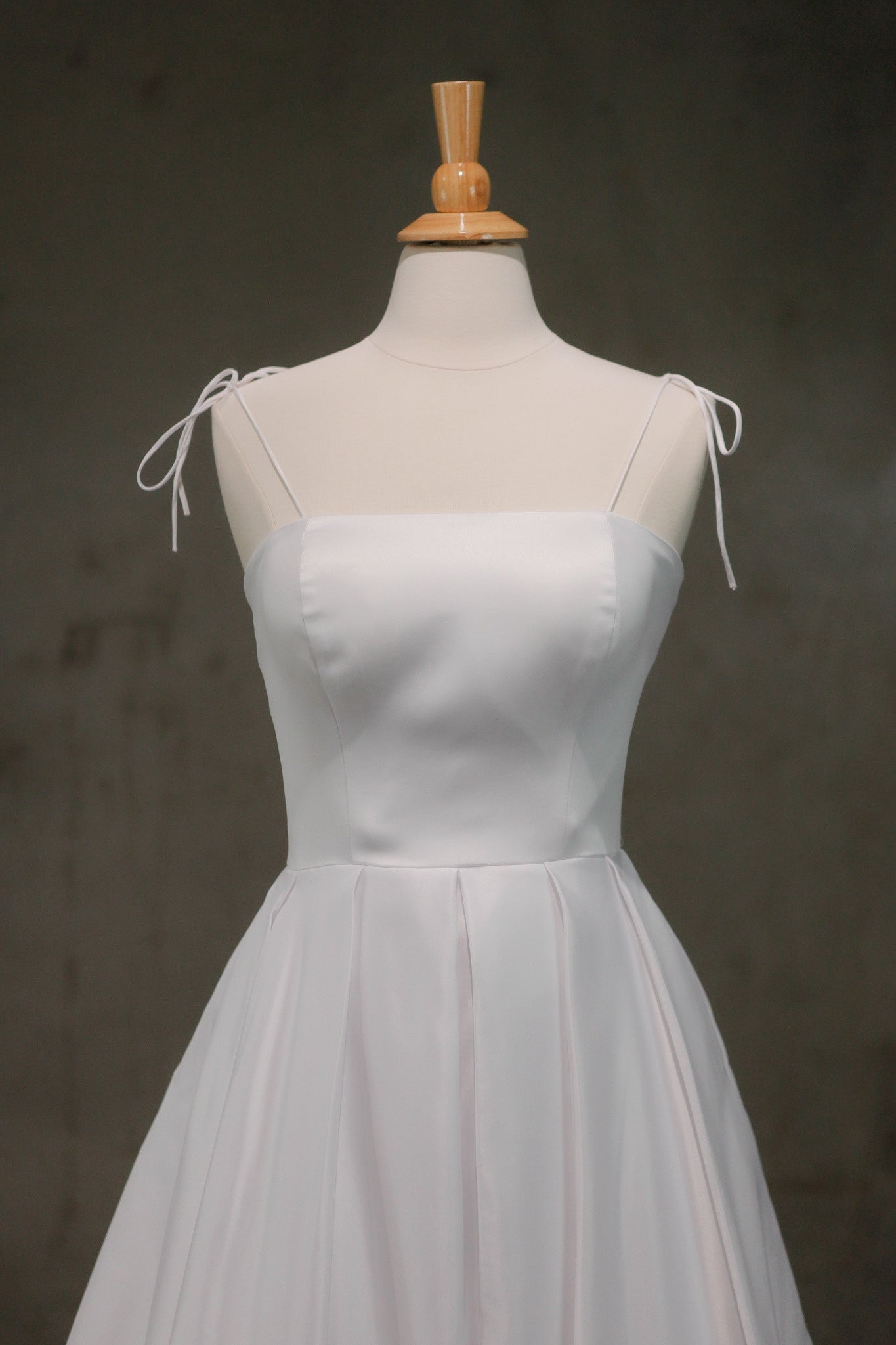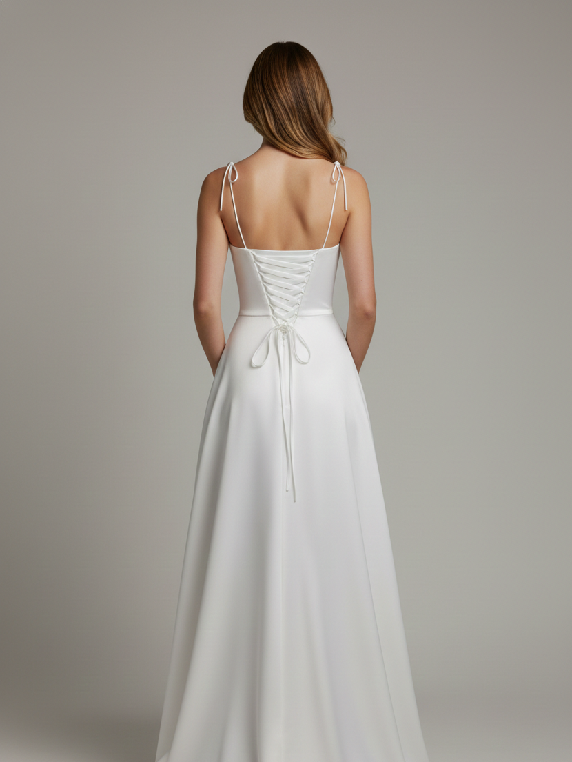 - BODICE: Straight across neckline with spaghetti straps to tie