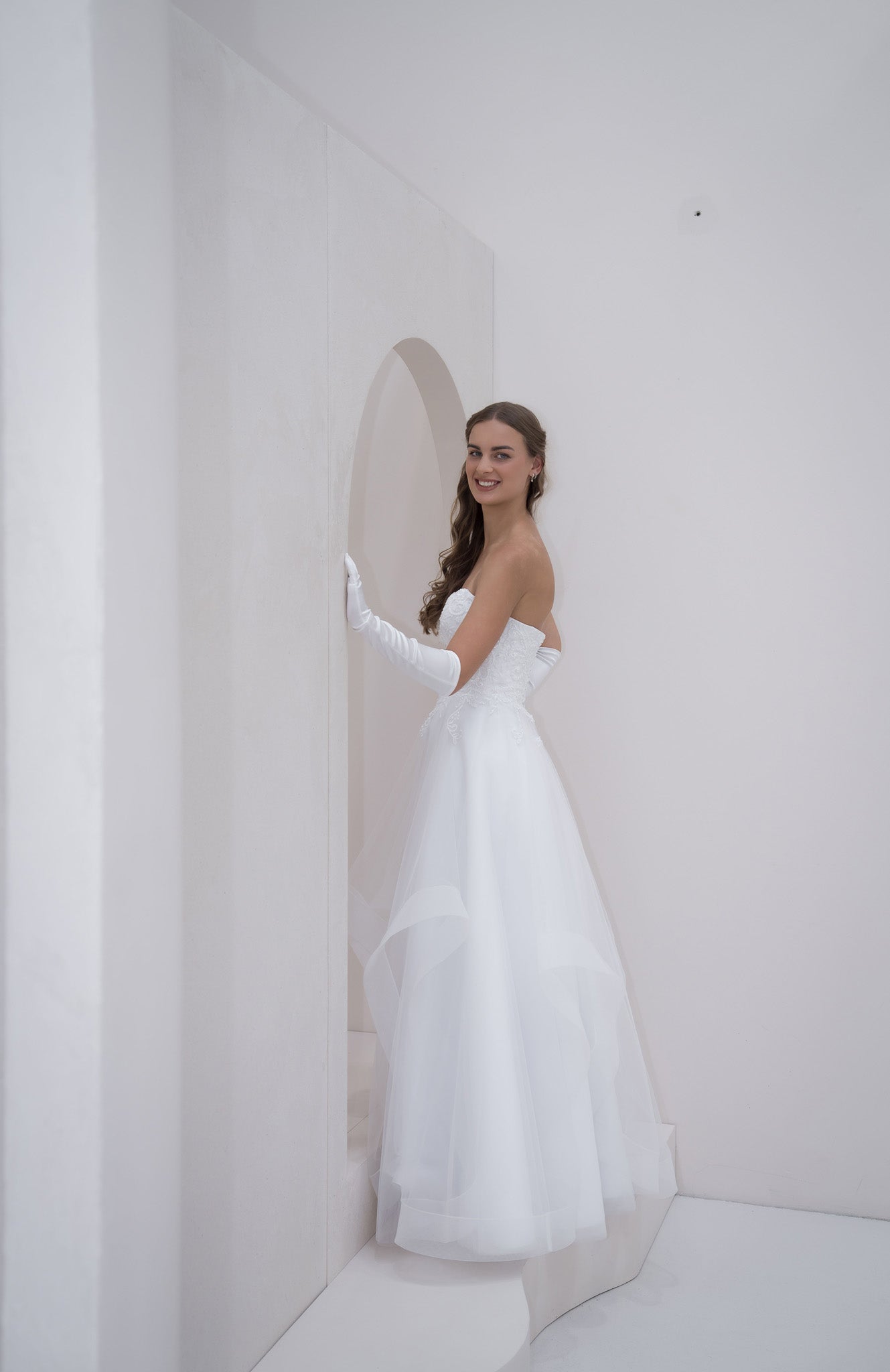 The Dovie debutante dress radiates timeless elegance with its soft sweetheart neckline and delicately embroidered corset bodice. Designed to flatter the silhouette, the structured bodice beautifully shapes the waist while offering comfortable support. The romantic layered tulle skirt flows gracefully from the waist, creating soft movement and an airy, ethereal feel with every step. Subtle embroidery adds texture and delicate detail, enhancing the gown’s refined look. Perfect for debutantes seeking a graceful and elegant style, Dovie blends traditional debutante beauty with modern sophistication. Its flattering structure and flowing skirt create a timeless silhouette for a truly memorable debutante evening.