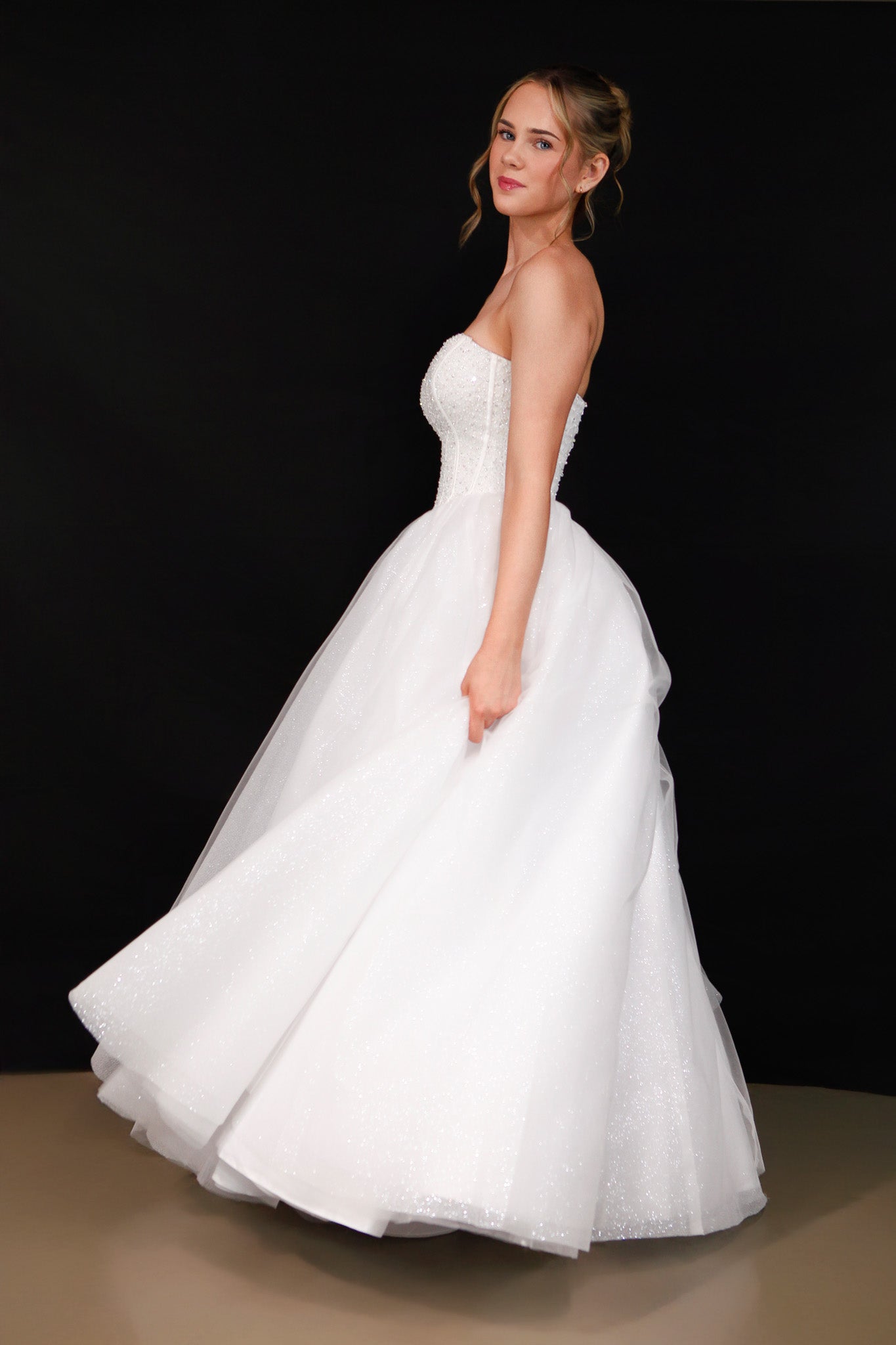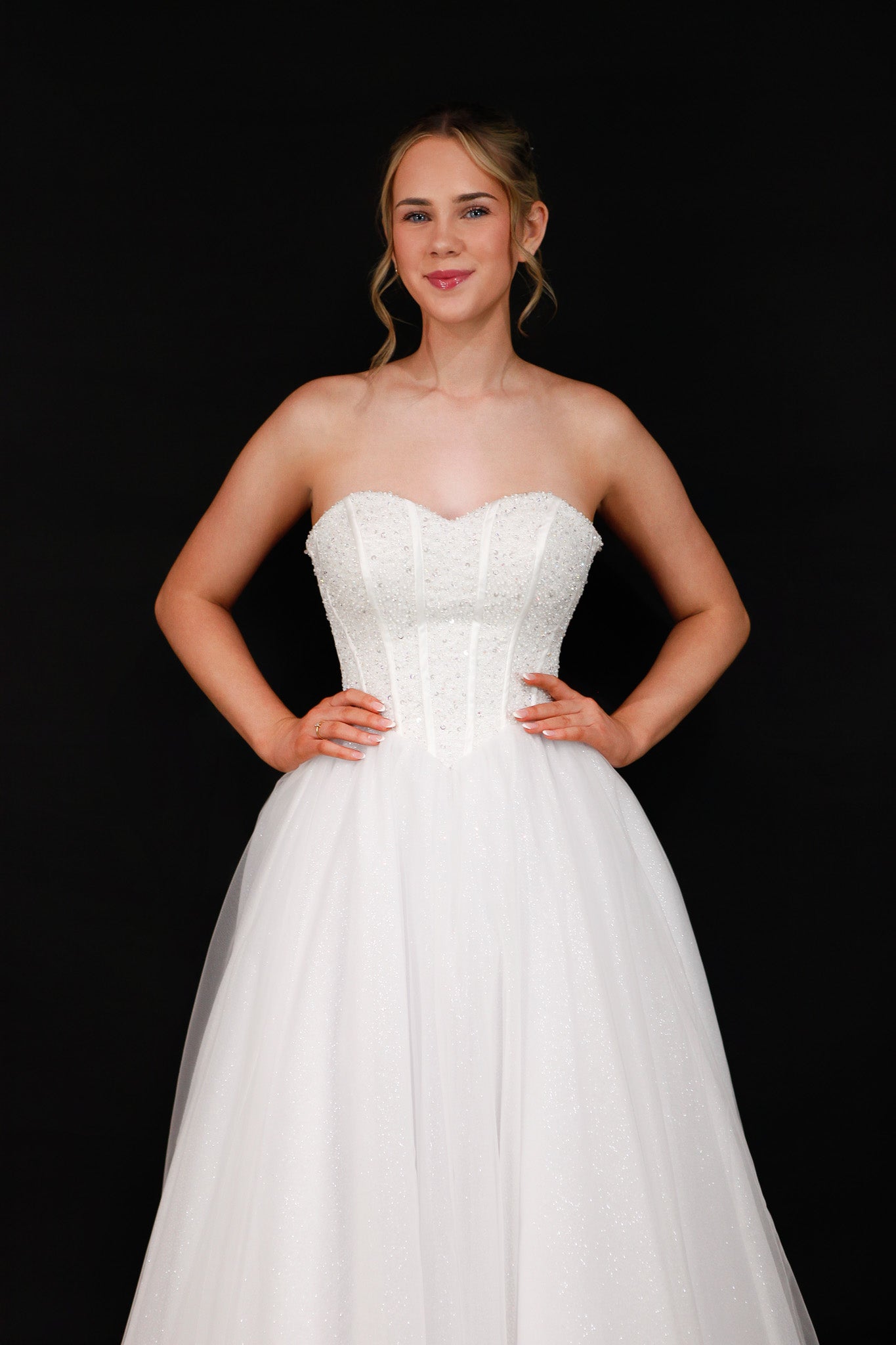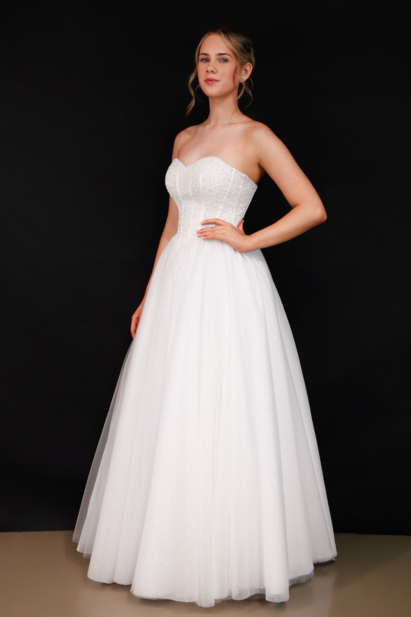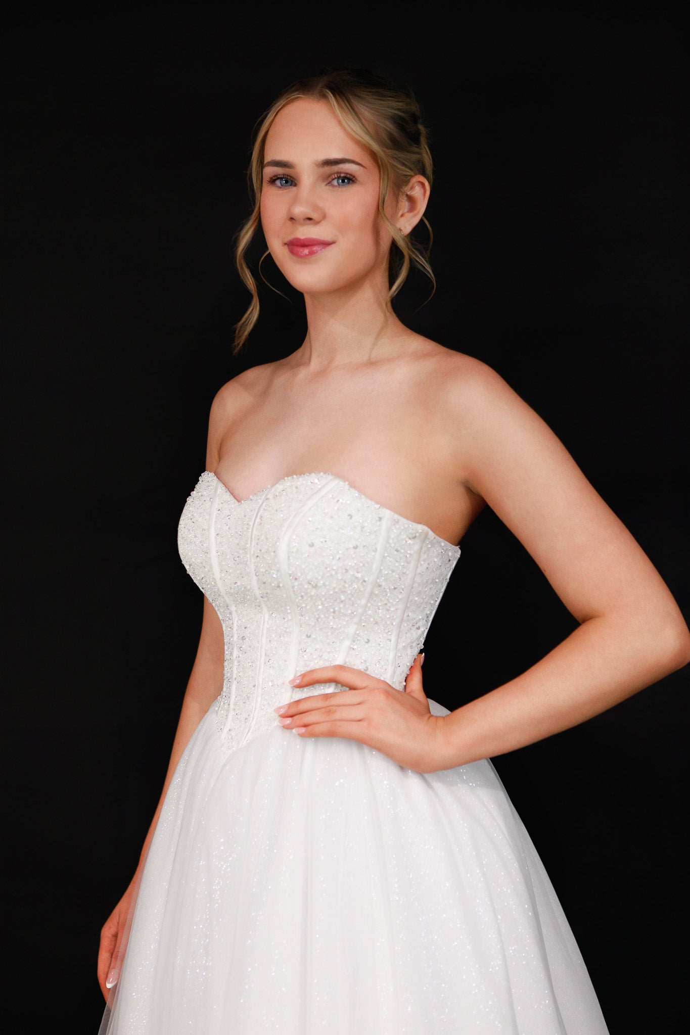 The Opal debutante dress exudes glamour and elegance with its romantic sweetheart neckline and intricately beaded corset bodice. Designed with a flattering V-waistline and crafted from tulle, the sparkle tulle skirt adds graceful movement and shimmer. The corset back ensures a perfect, custom fit. Ideal for debutantes looking to make a dazzling impression at formal events. Its structured bodice offers both support and style, highlighting the waist beautifully. Opal is the perfect blend of timeless charm and radiant sophistication.