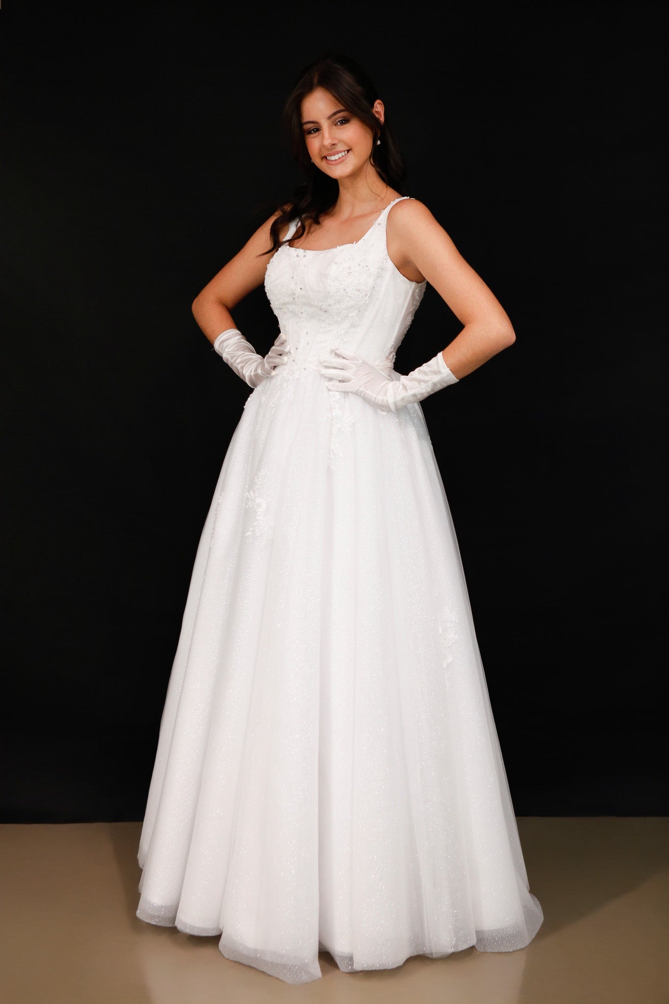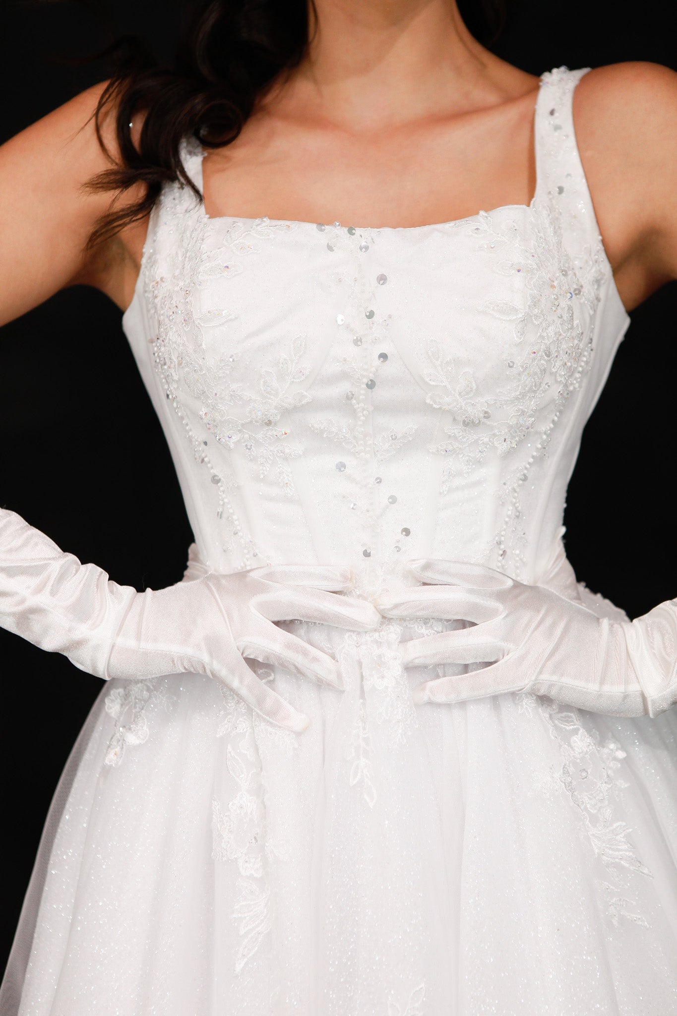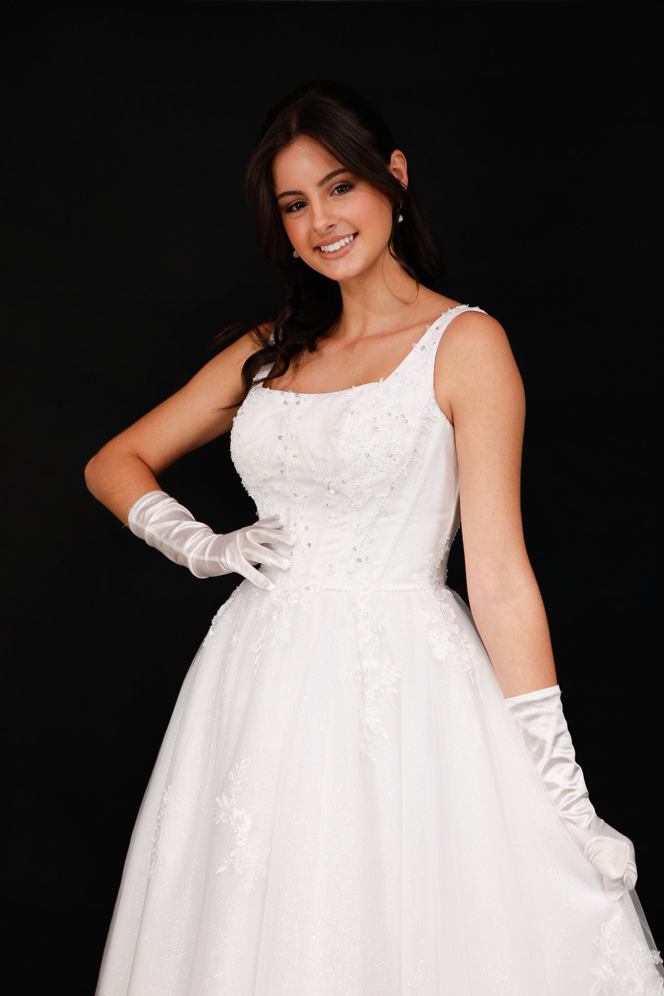 The Gianna debutante dress is a timeless vision of elegance and grace, perfect for a young woman’s grand entrance. Crafted in a luminous white fabric, it features a structured bodice adorned with delicate beadwork and subtle floral embroidery that enhances its regal charm. The square neckline and wide straps offer a classic silhouette, beautifully complemented by the full A-line skirt that flows effortlessly to the floor. Accentuated with a gentle shimmer, the gown catches the light with every movement, making it ideal for a formal ball or debutante presentation. Finished with matching white gloves, Gianna embodies sophistication, poise, and youthful refinement.