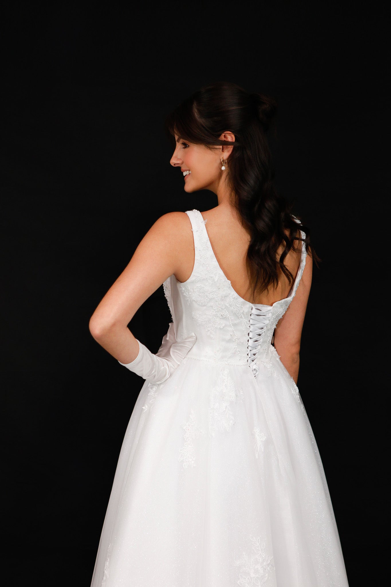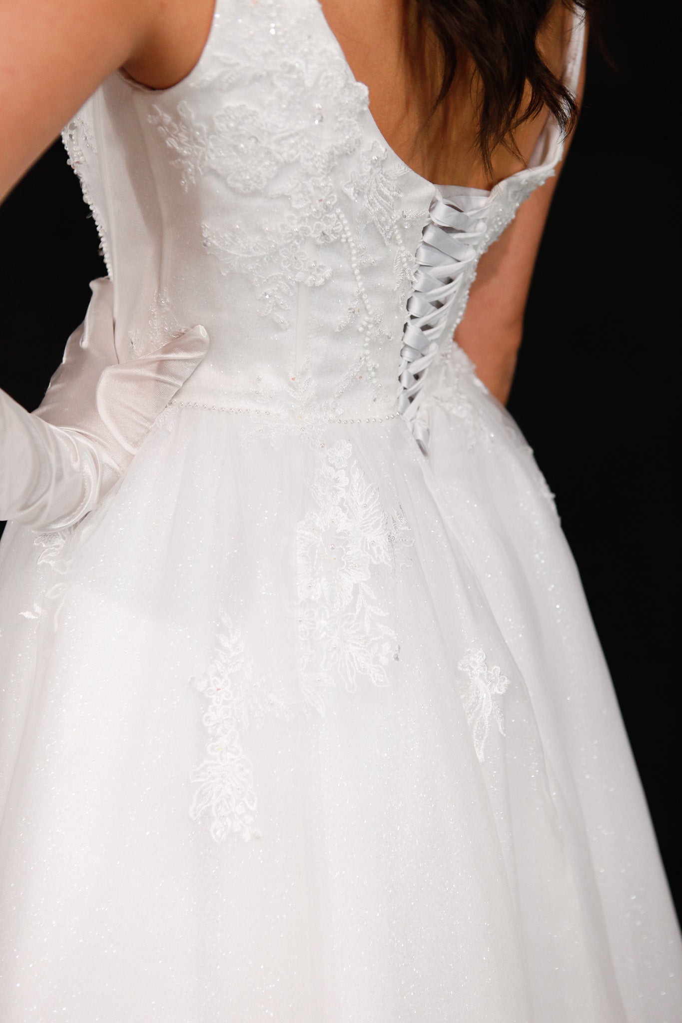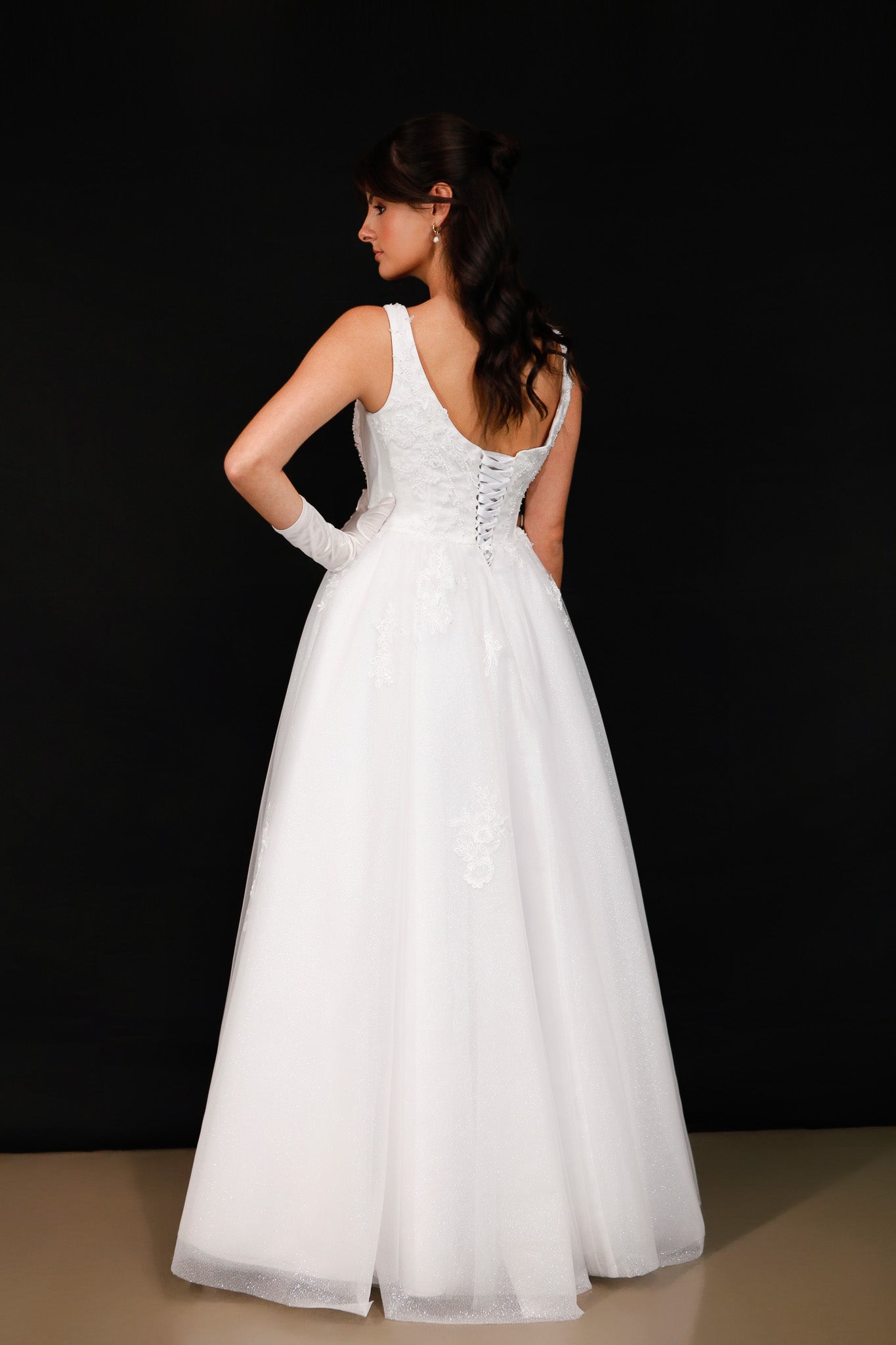 The Gianna debutante dress is a timeless vision of elegance and grace, perfect for a young woman’s grand entrance. Crafted in a luminous white fabric, it features a structured bodice adorned with delicate beadwork and subtle floral embroidery that enhances its regal charm. The square neckline and wide straps offer a classic silhouette, beautifully complemented by the full A-line skirt that flows effortlessly to the floor. Accentuated with a gentle shimmer, the gown catches the light with every movement, making it ideal for a formal ball or debutante presentation. Finished with matching white gloves, Gianna embodies sophistication, poise, and youthful refinement.