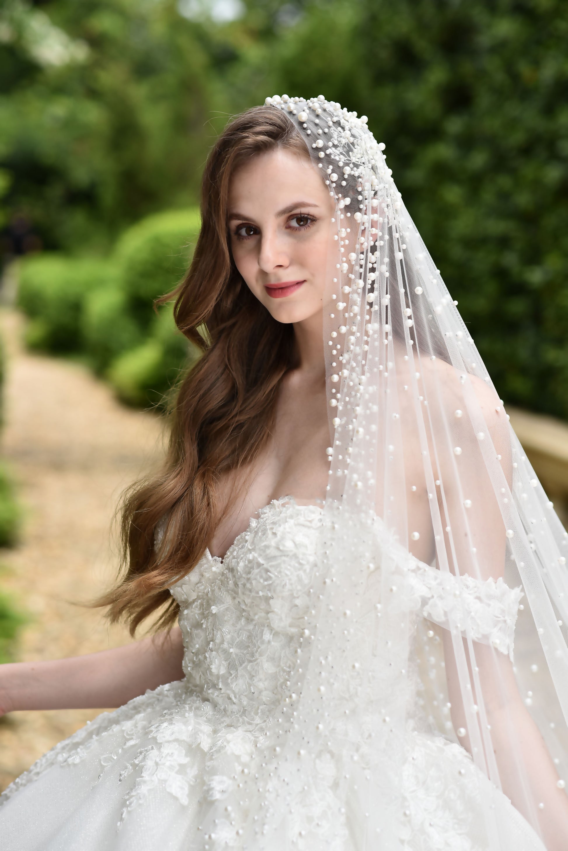- STYLE:Soft tulle adorned with the finest quality pearlsMeticulously hand-beaded pearls throughout the entire length for a mesmerizing effect