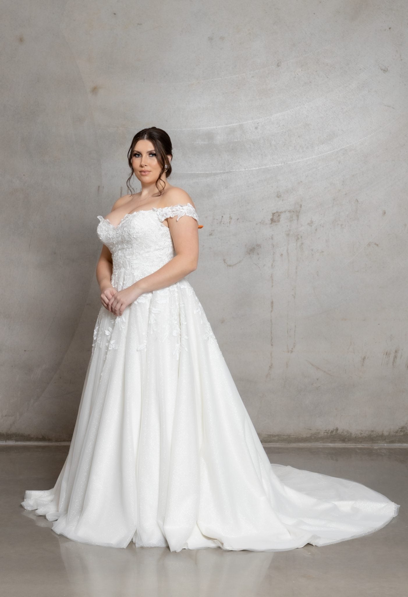 The bodice is adorned with exquisite floral lace that extends over the waist, seamlessly transitioning into the flowing A-line skirt. This lace is imbued with subtle sparkles, catching the light and ensuring the bride shines throughout her special day.