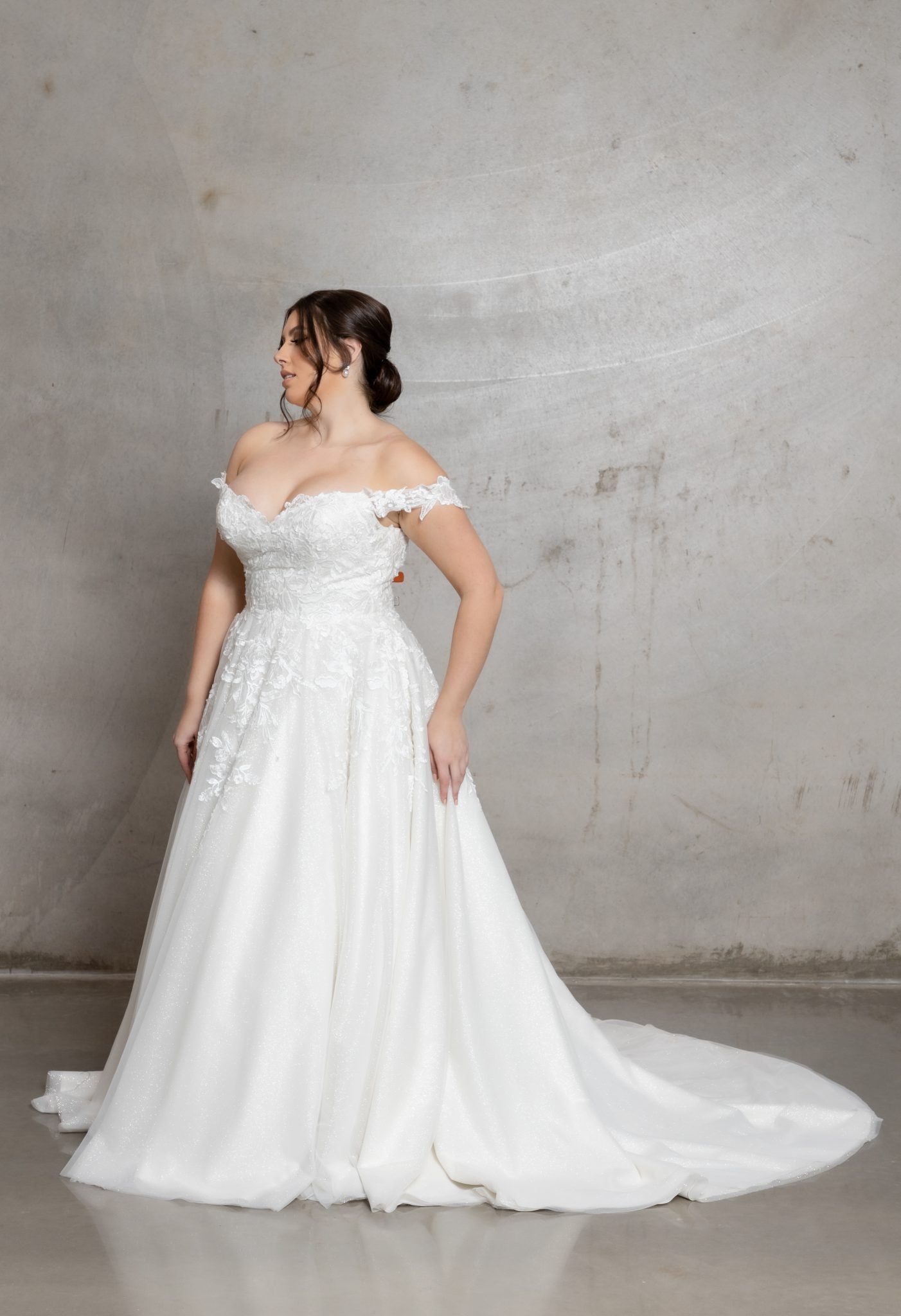 Jullia Bridal proudly introduces "Helene," a graceful A-line wedding dress that merges classic romance with a hint of sparkle. Perfect for brides who value timeless elegance, "Helene" features a sweetheart neckline complemented by off-the-shoulder sleeves, enhancing femininity and offering a romantic, timeless look. The neckline and sleeve silhouette beautifully frame the upper body, adding sophistication.