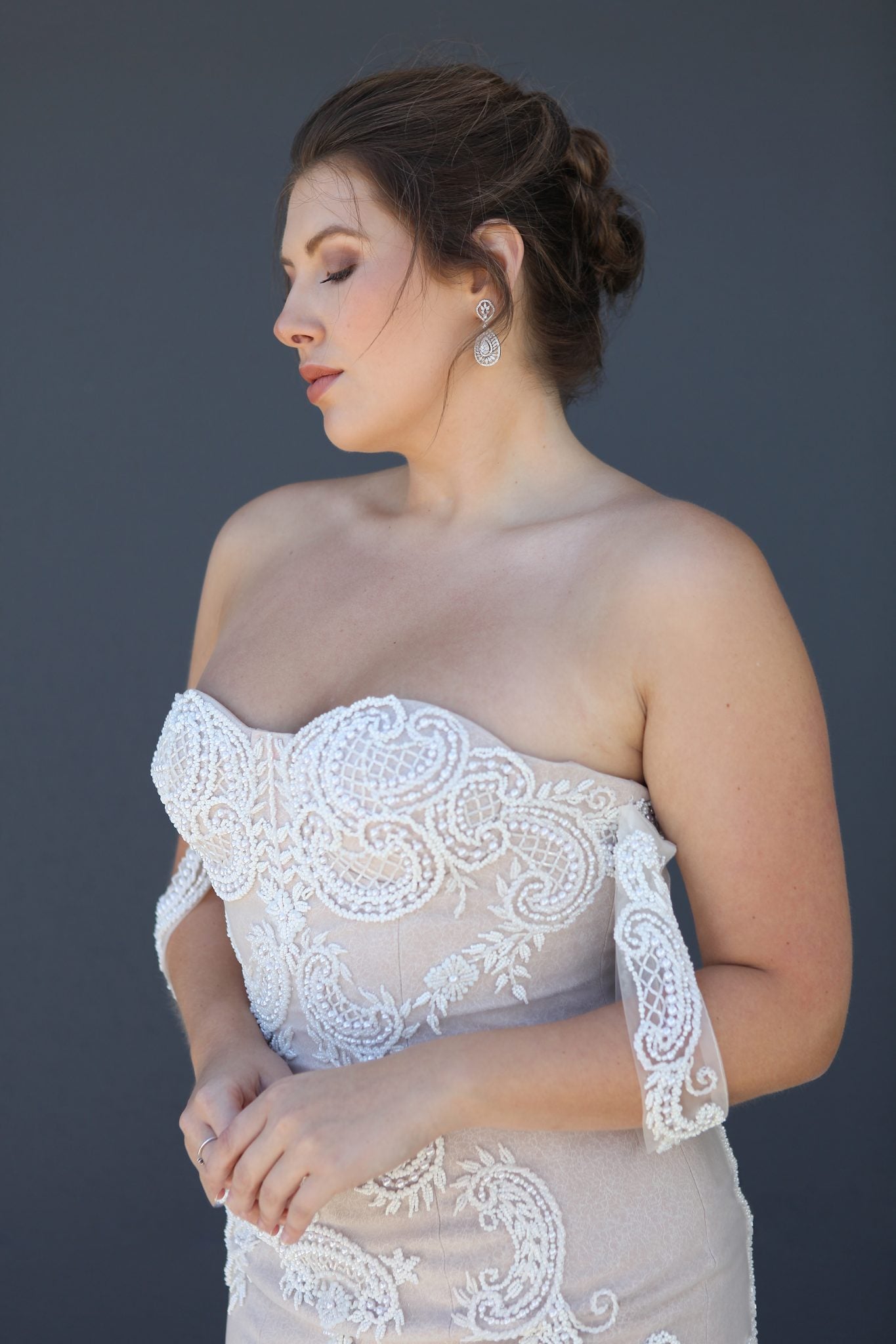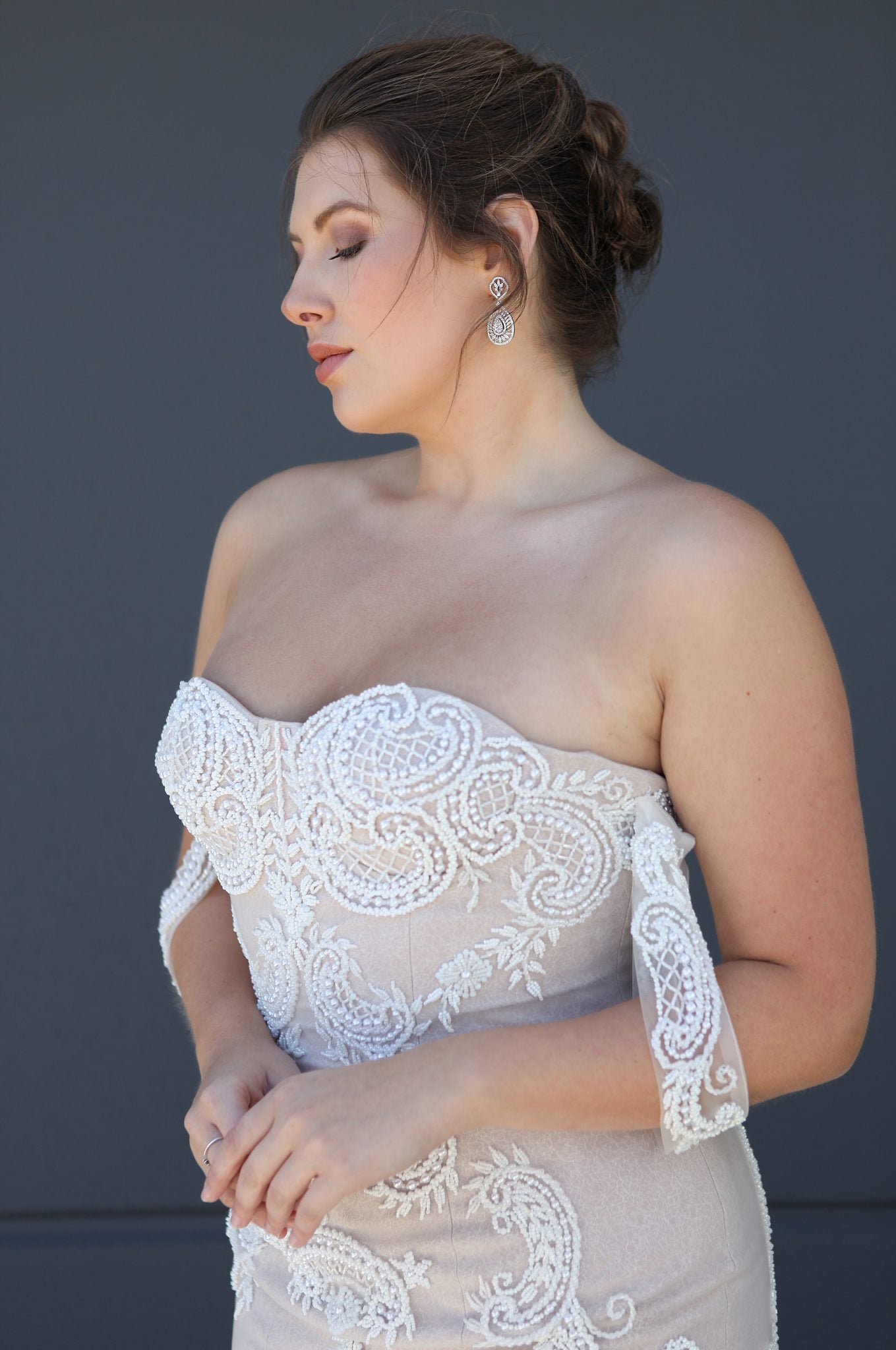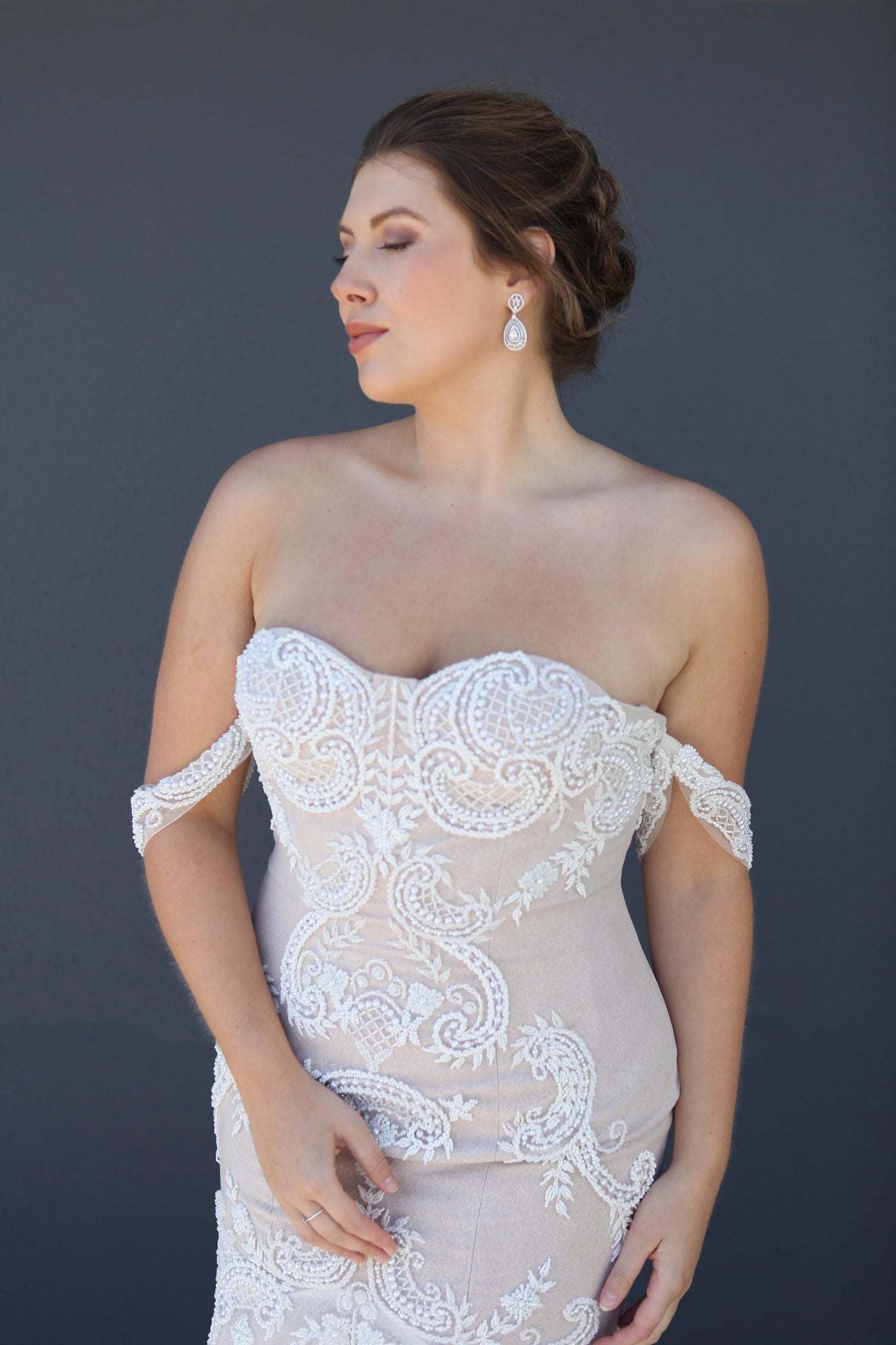 SPECIAL FEATURES: Negative Space Pearl and Bead Detailing, Soft Blush and Neutral Palette