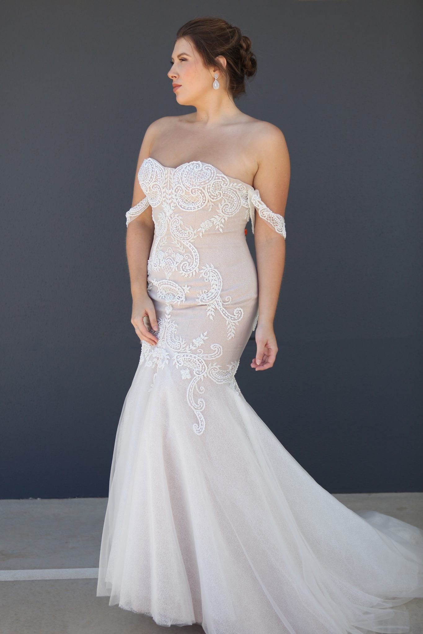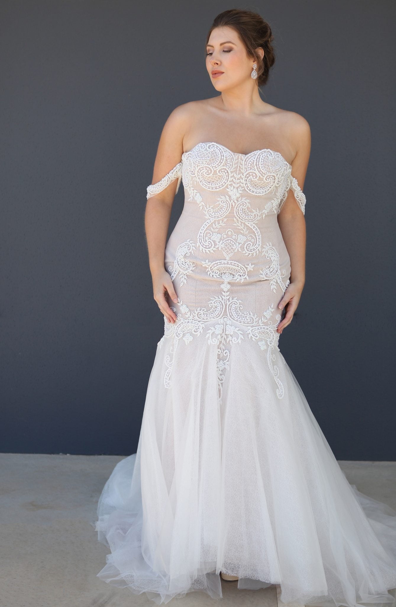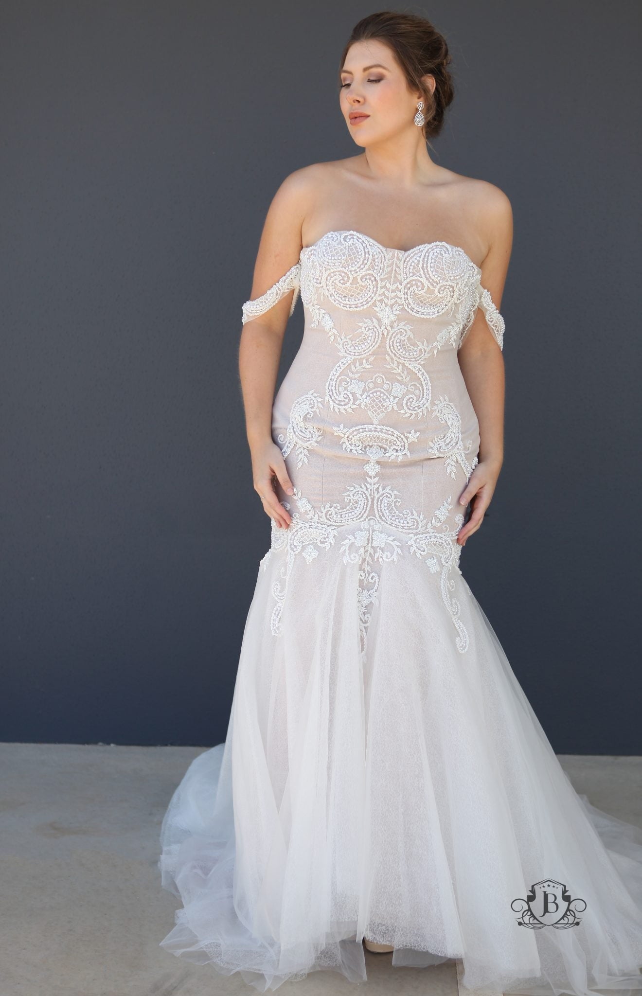 Jullia Bridal introduces the "Irene" wedding gown, a masterpiece of romantic elegance and modern allure. This lace creation exudes timeless beauty, with off-the-shoulder straps that frame the shoulders in ethereal grace. The slightly sweetheart neckline adds a contemporary twist to the classic design, extending seamlessly from the hips for a sleek silhouette.