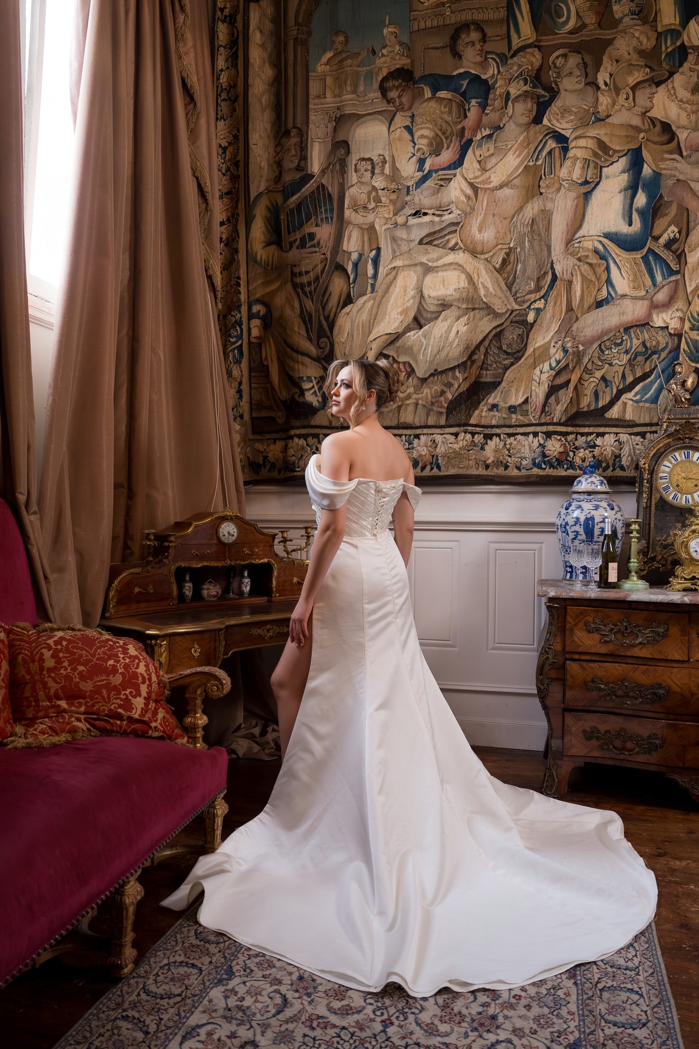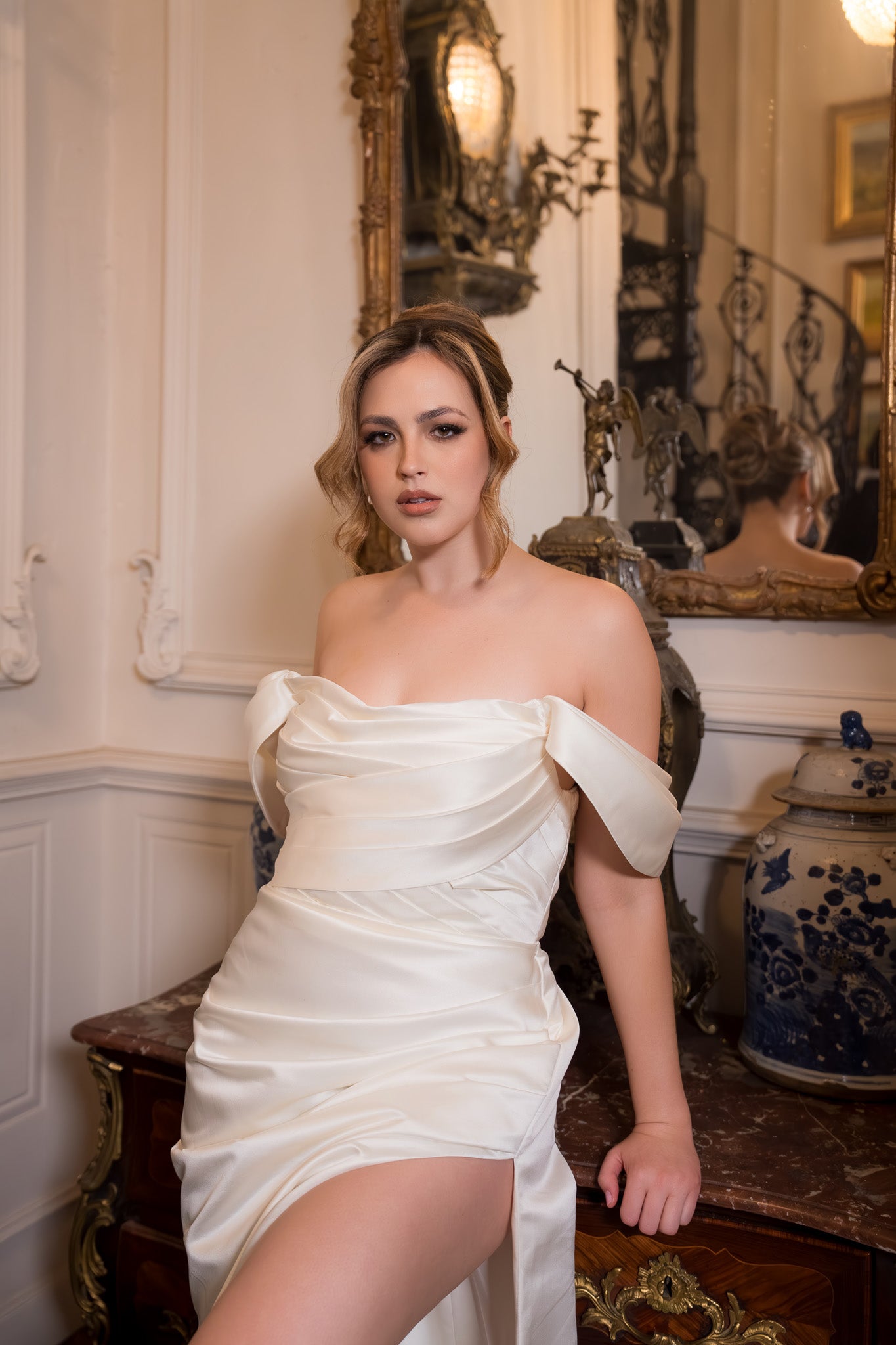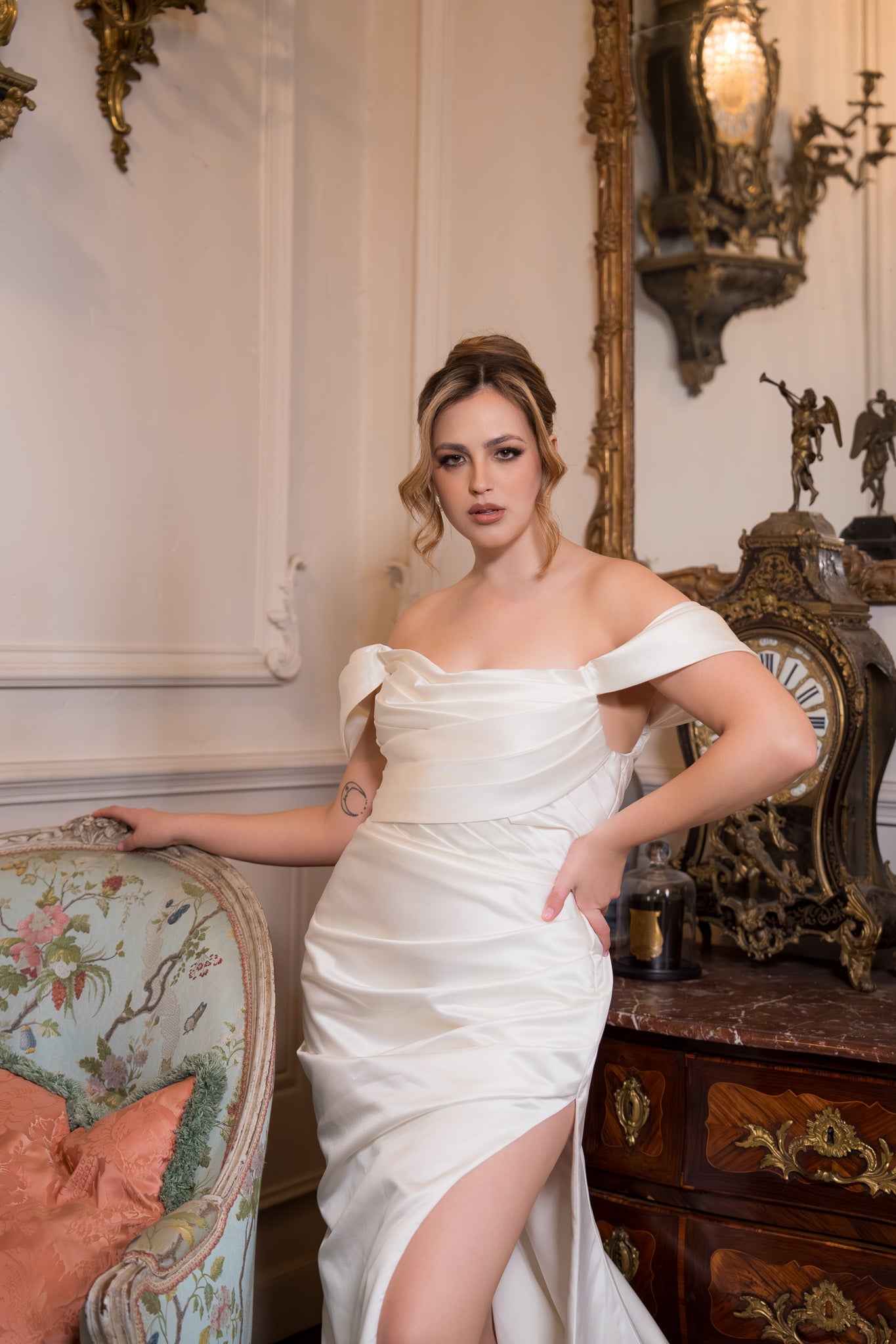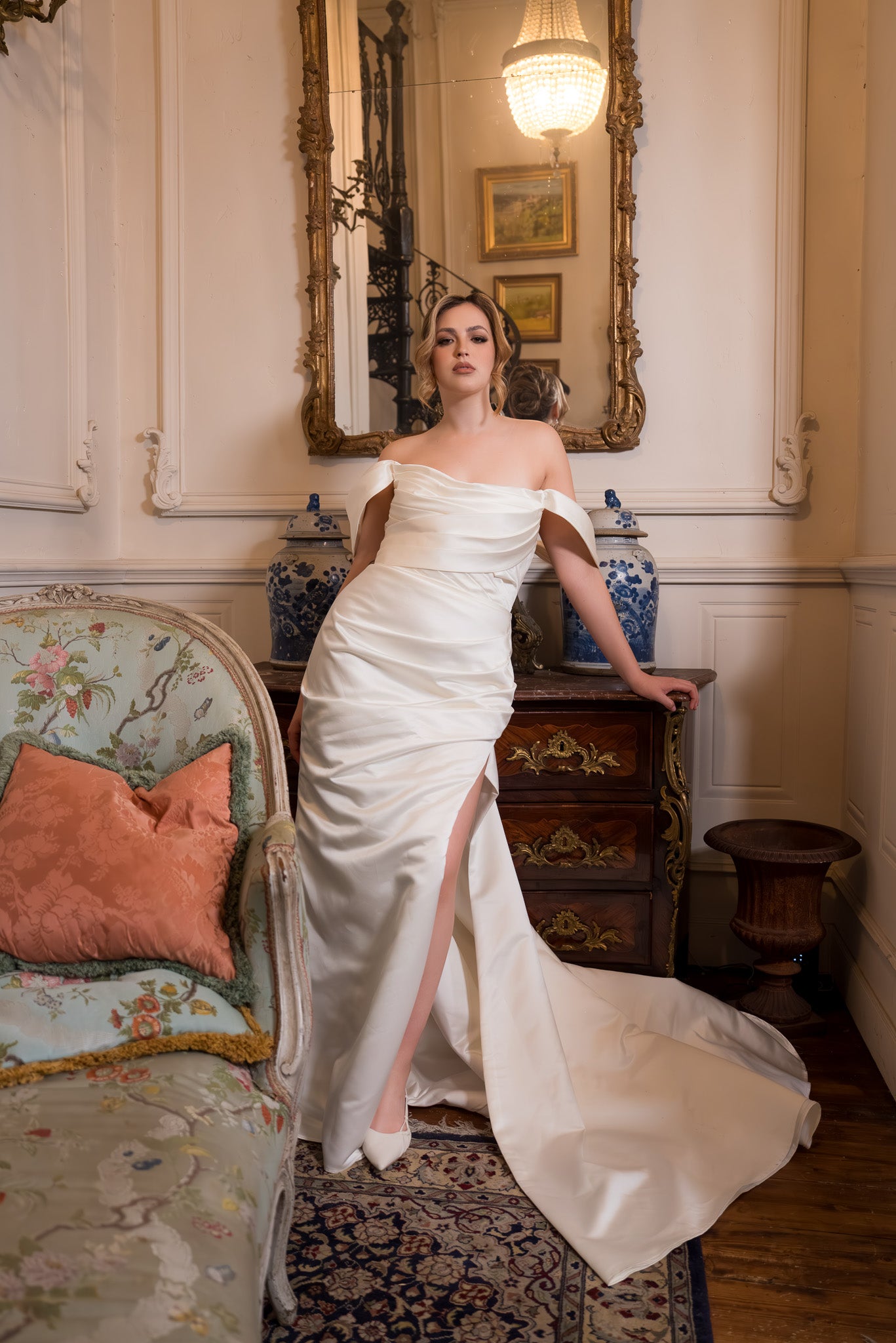 Make a statement in our Julissa wedding dress — a sophisticated trumpet silhouette crafted from luxurious satin. The structured bodice features elegant draped detailing that flows seamlessly into the skirt, enhancing the bride’s natural curves with timeless grace. A straight-across neckline paired with sleek off-the-shoulder satin straps adds a modern, refined touch. The left-side thigh split introduces a hint of allure, while the soft swept train completes the look with effortless elegance. Perfect for brides who adore a blend of classic romance and contemporary sophistication, Julissa is a gown that celebrates confidence and beauty — and it’s even more breathtaking when you try it on in person.