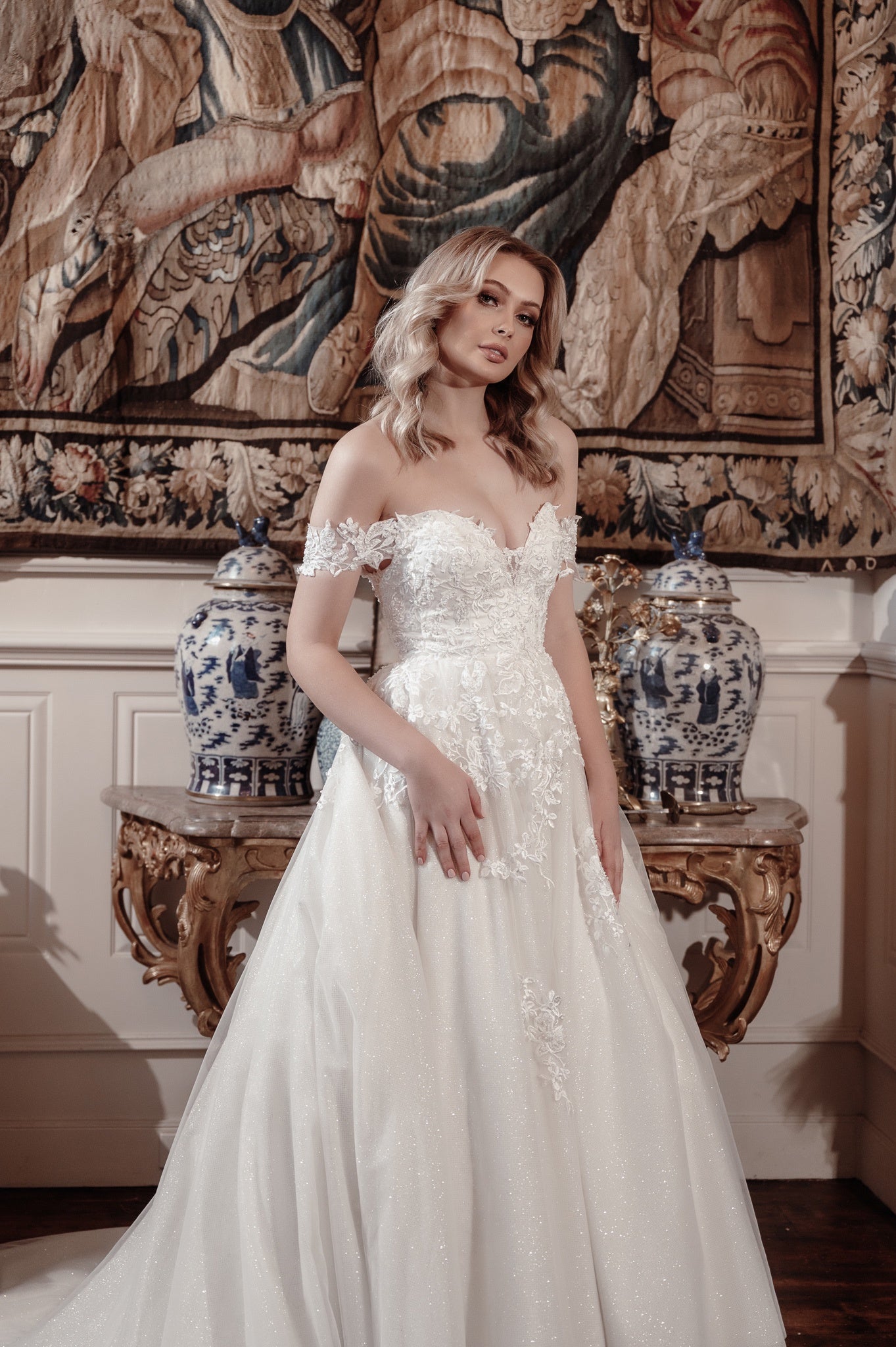 Featuring a deep sweetheart neckline, this gown enhances the bride's natural beauty while off-the-shoulder sleeves add a touch of regal elegance. The bodice is adorned with exquisite floral lace that extends over the waist, enriching the classic princess silhouette and making the bride feel like royalty.