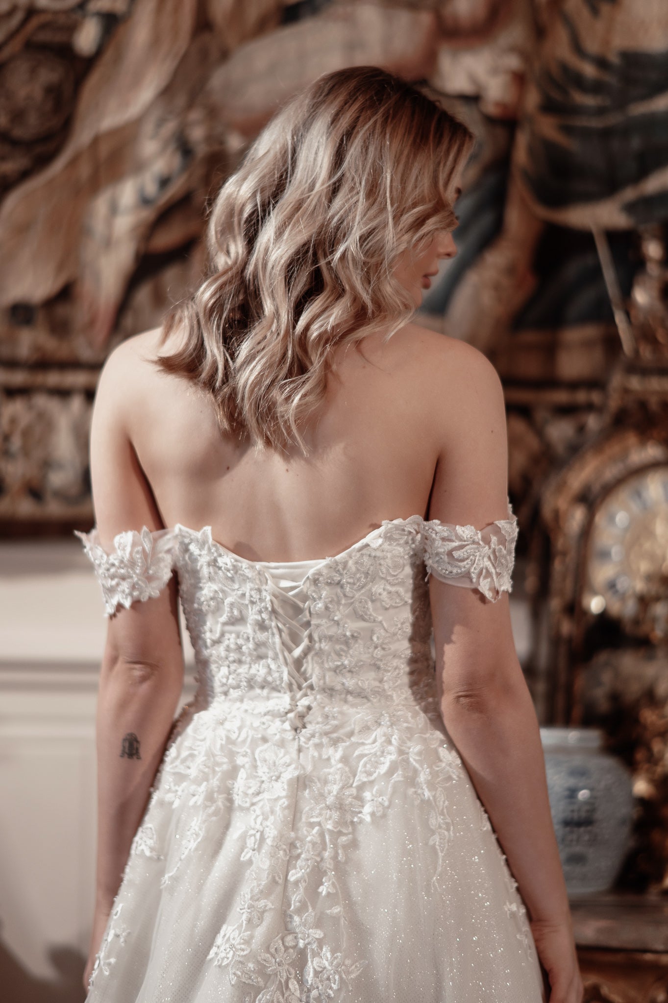 Subtle sparkles woven throughout the gown capture and reflect light beautifully, ensuring the bride shines on her special day. The gown is completed with a corset back, providing an adjustable fit and adding vintage charm.