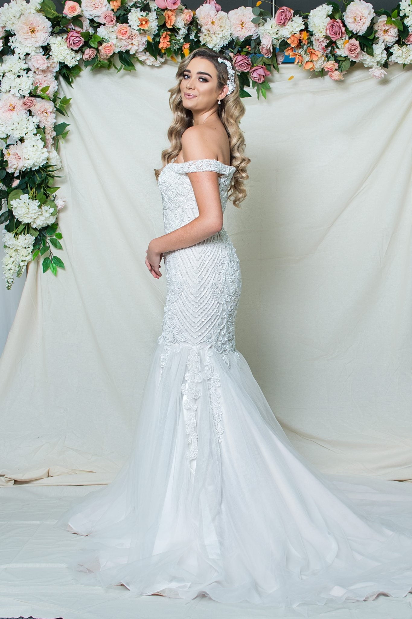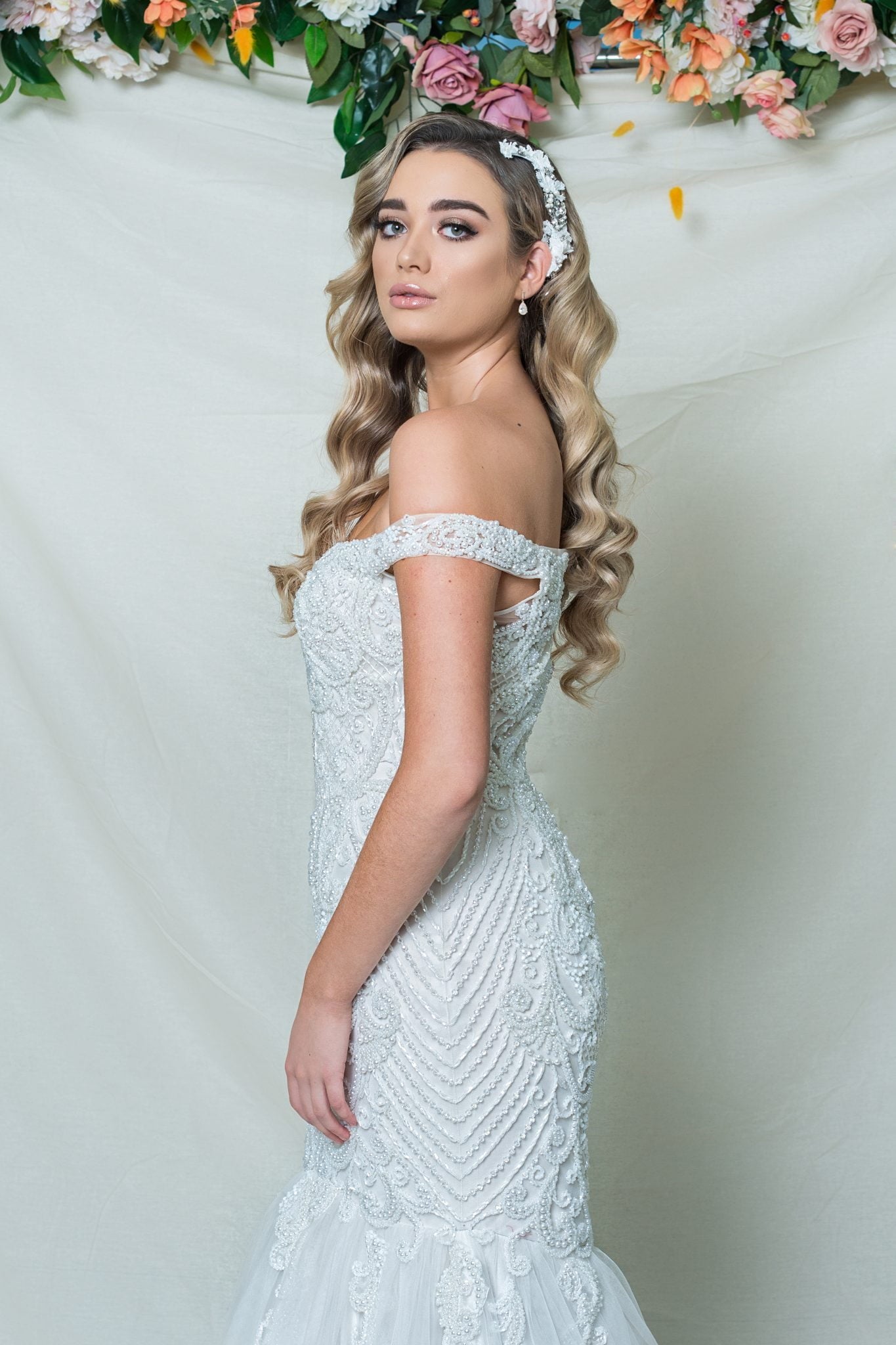 Jullia Bridal presents the glamorous and enchanting "Megan" wedding gown, perfect for brides seeking elegance and romance. The off-the-shoulder neckline with short sleeves adds a touch of classic charm, while exquisite beaded lace appliqués adorn the bodice for a romantic, refined look. Designed in a flattering mermaid silhouette, the gown gracefully flows into a full-length hem, making it an unforgettable choice for your special day.