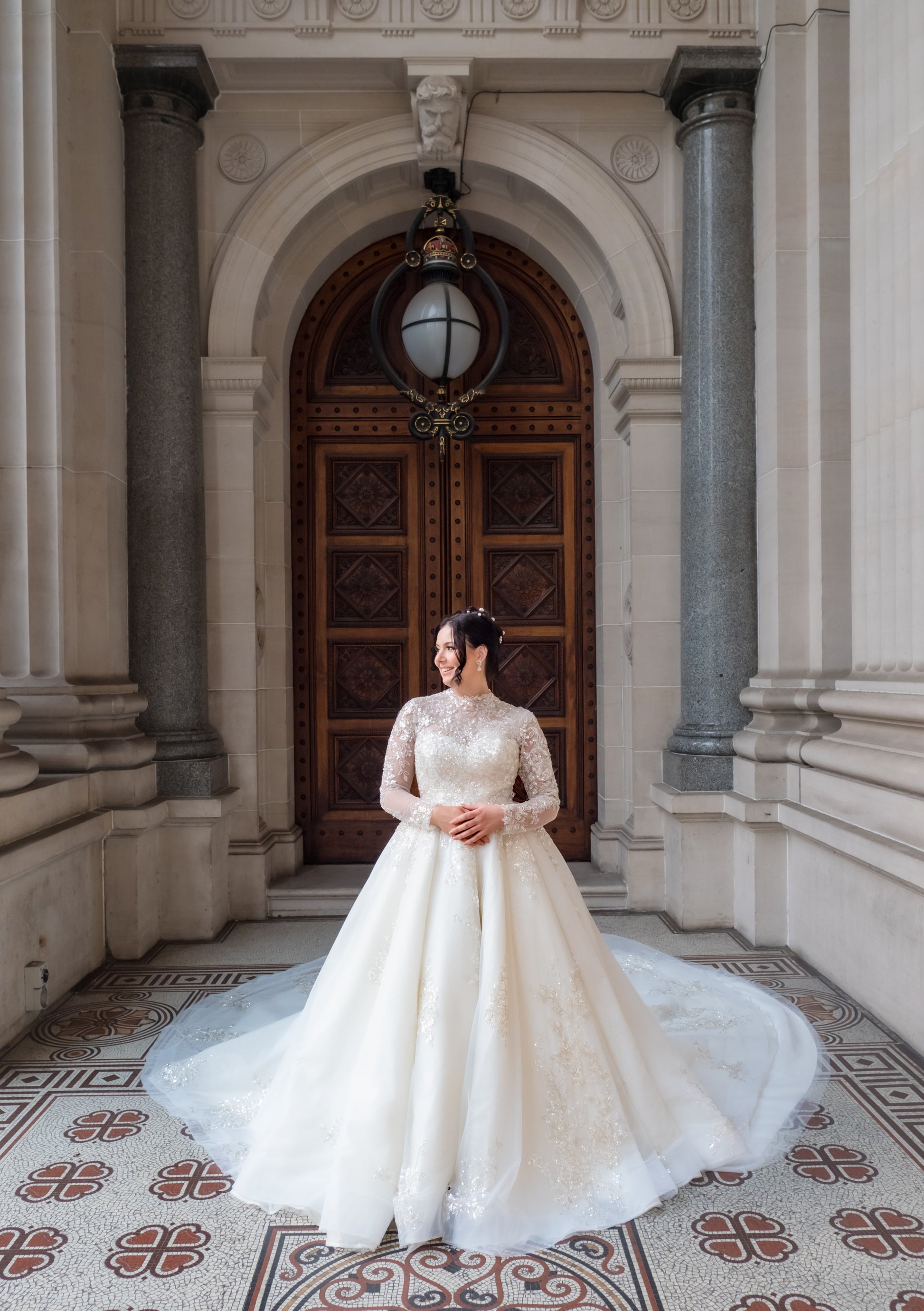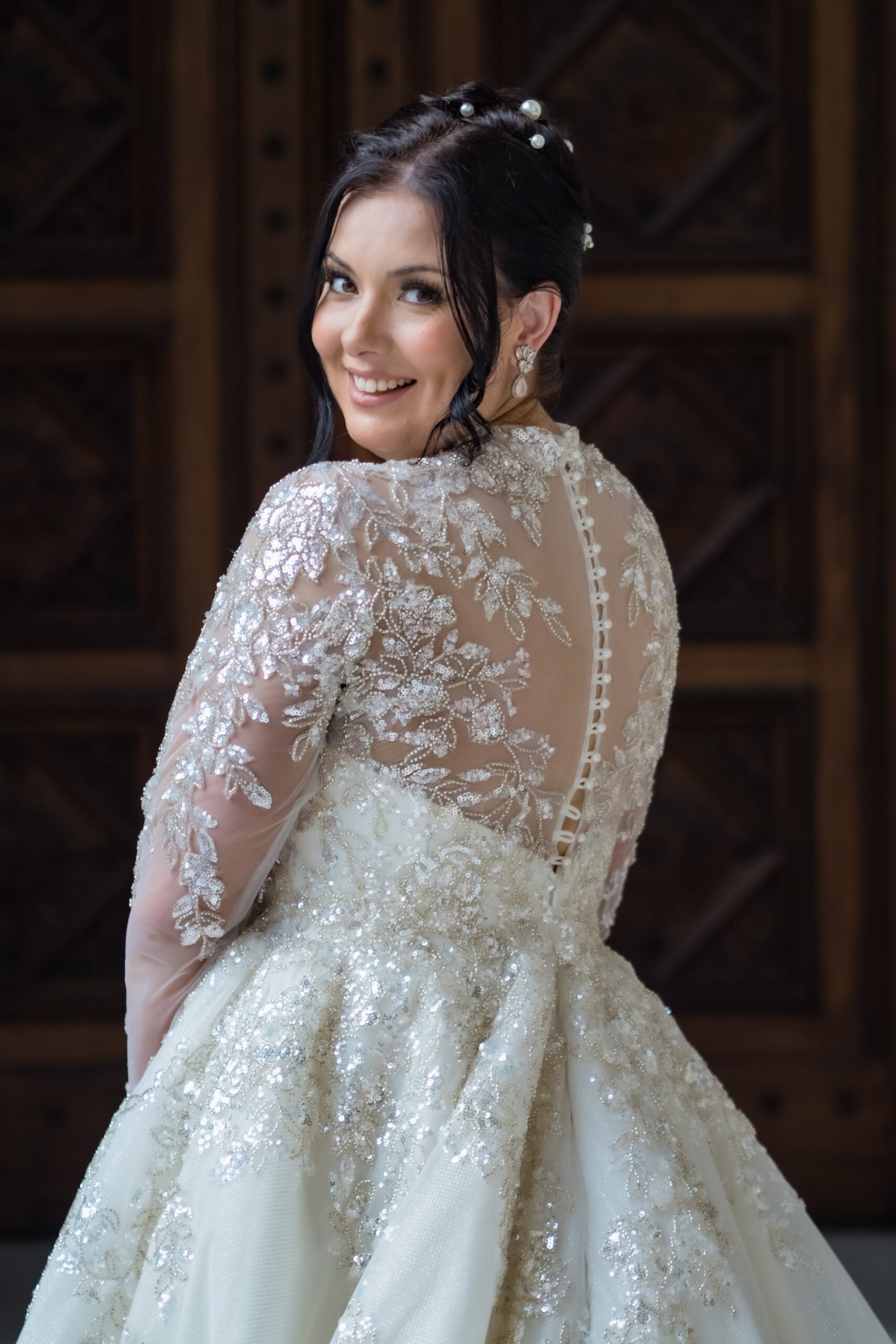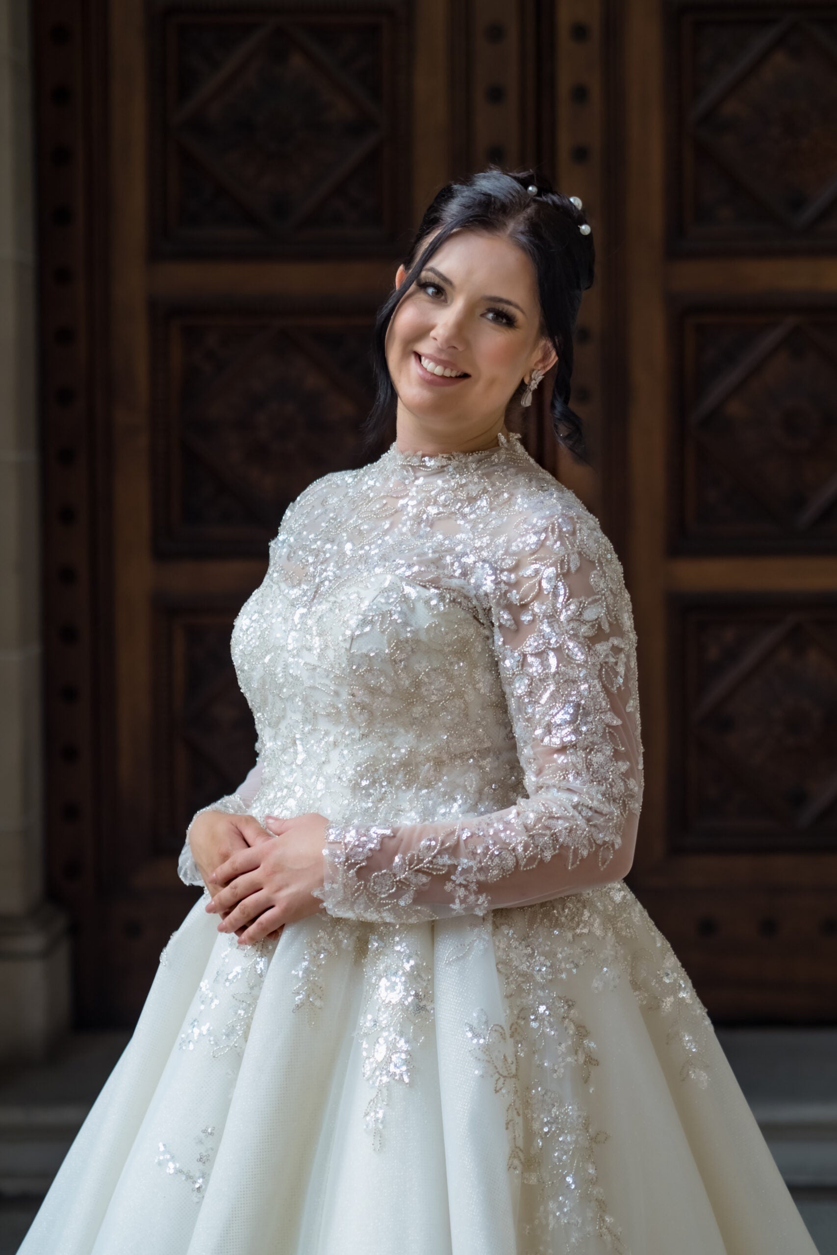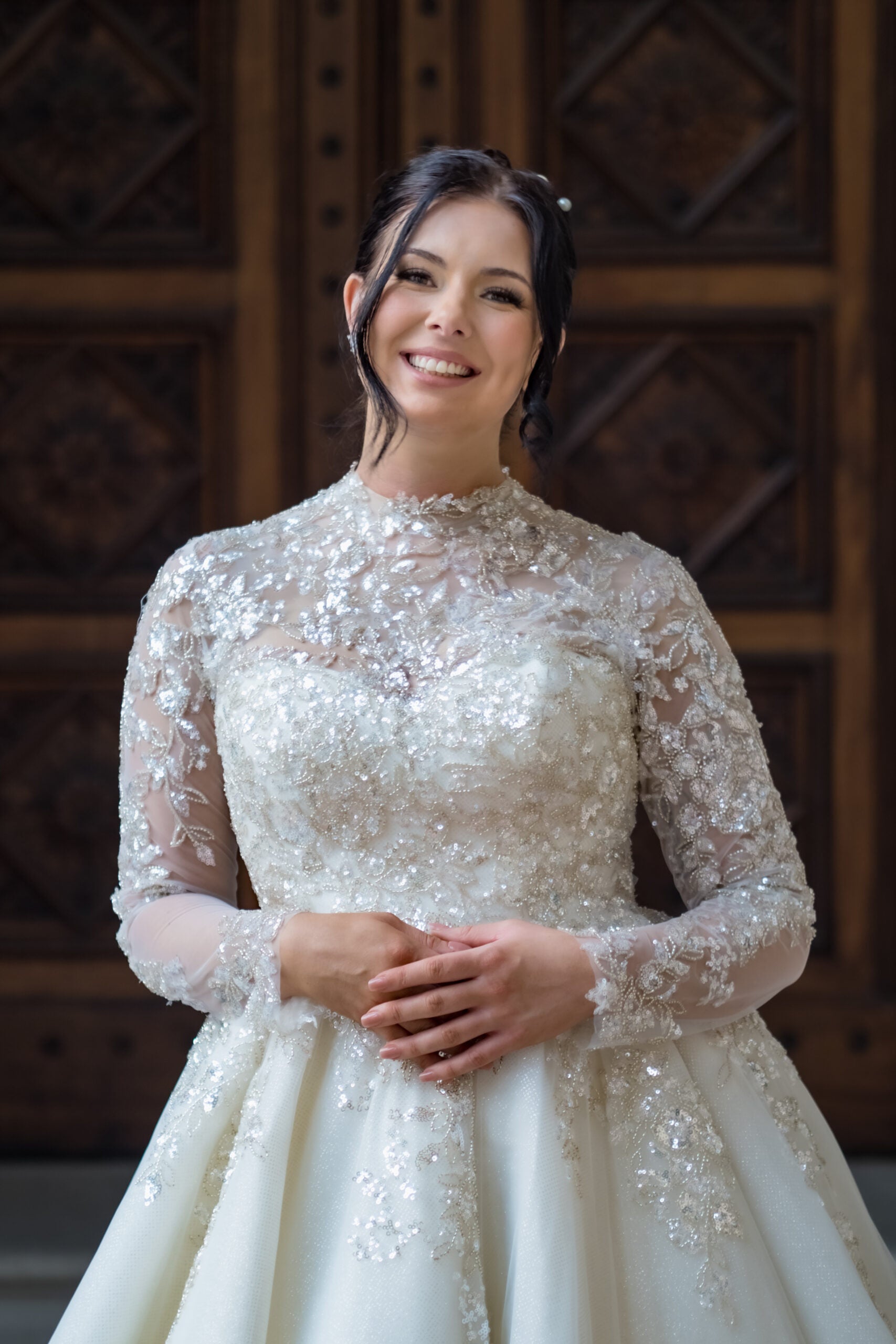 A vision of royal elegance, the Morgan Wedding Gown is designed for the bride who desires opulence with a timeless touch. The high illusion neckline and long sheer sleeves are adorned with intricate beaded lace appliqués, creating a shimmering masterpiece that captures light with every movement.