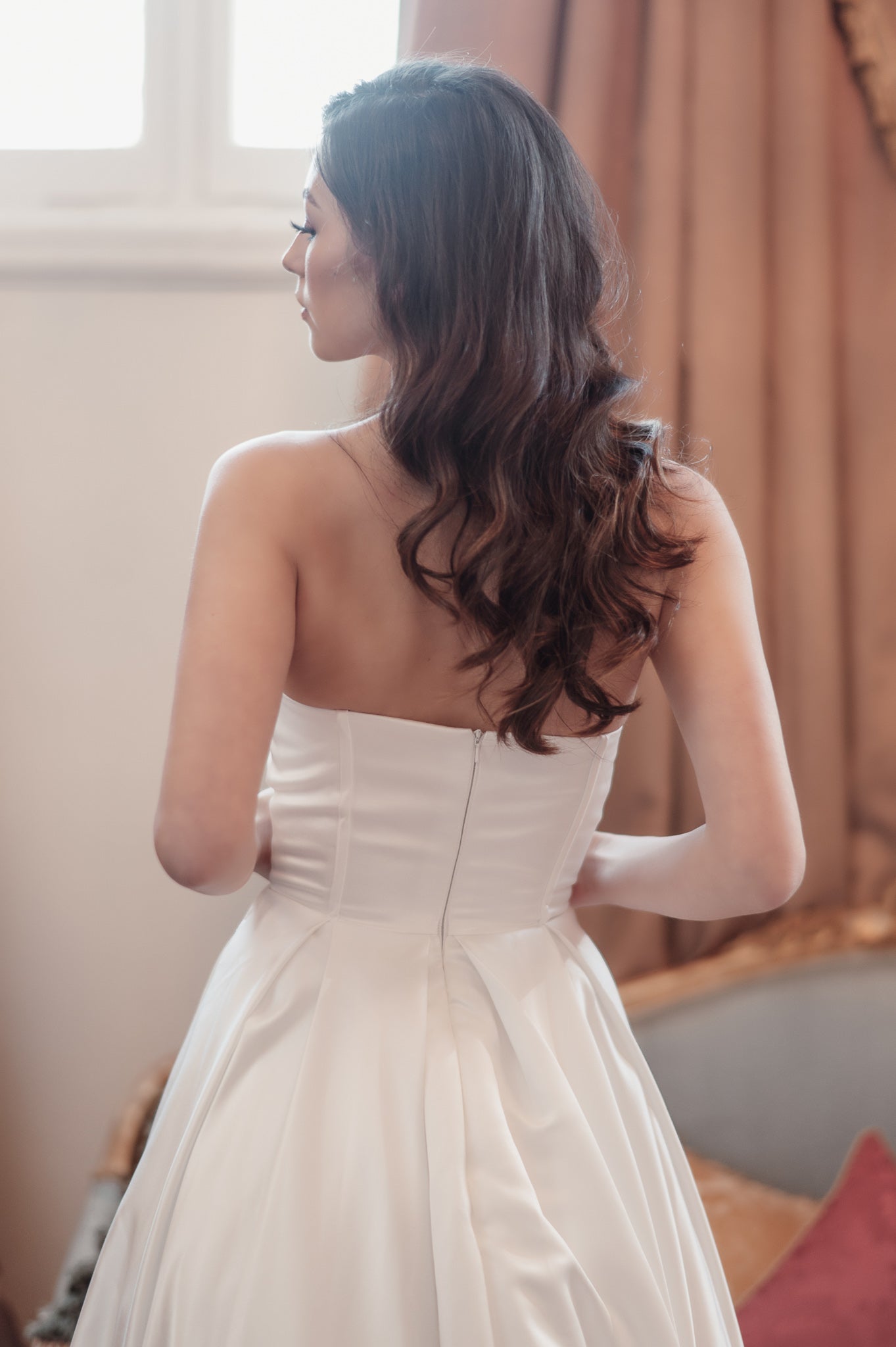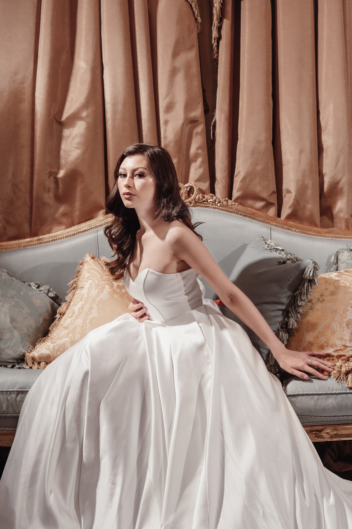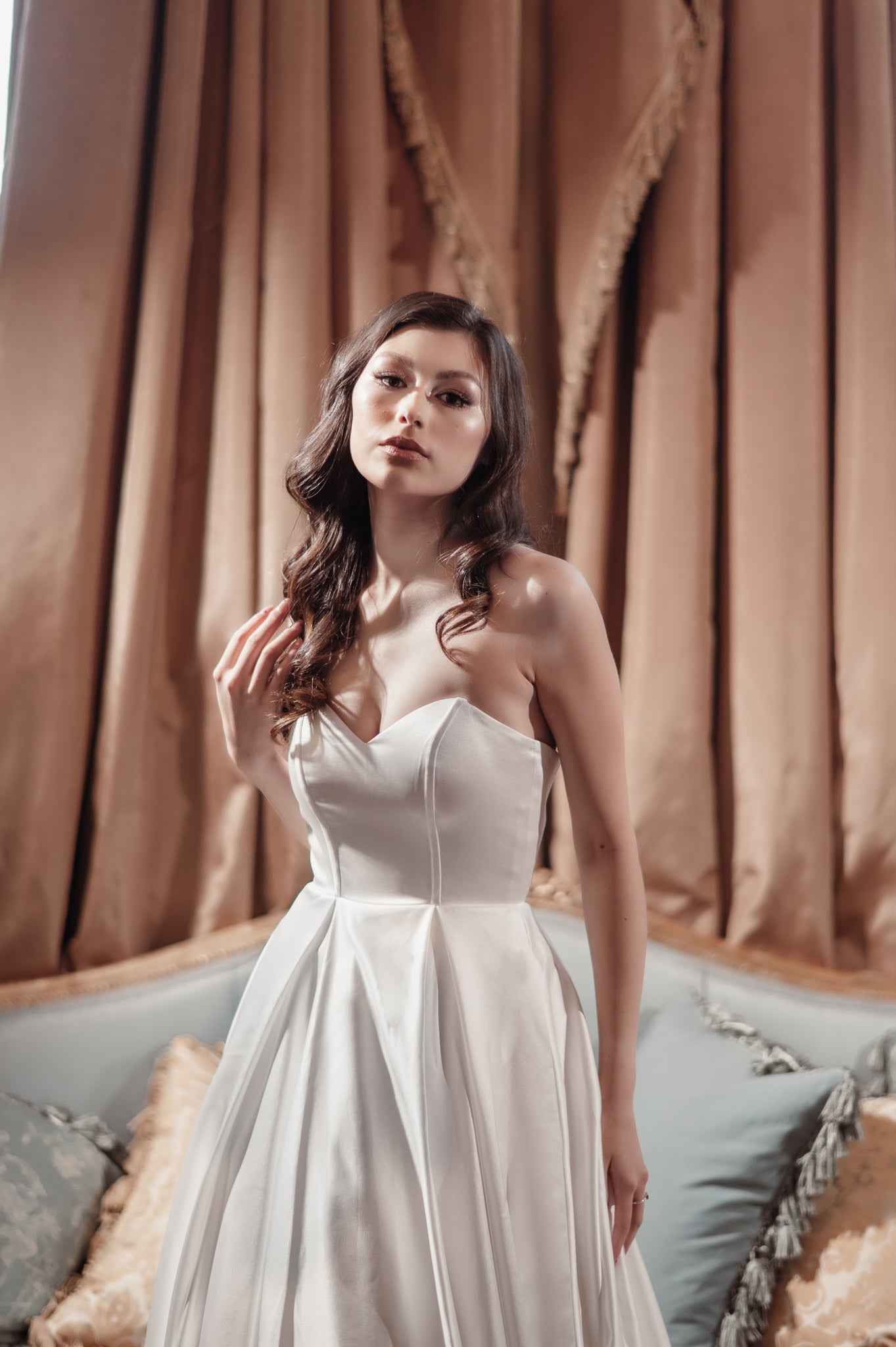 Jullia Bridal is proud to unveil "Paris," a breathtaking A-line wedding dress that epitomizes classic elegance with a contemporary twist. This stunning gown is designed for the bride seeking a timeless yet modern bridal look. "Paris" features a sleek, strapless bodice, providing a clean and sophisticated canvas that beautifully accentuates the neckline and shoulders. Expertly crafted from luxurious satin, the gown boasts a luminous sheen and smooth texture, enhancing its graceful A-line silhouette. The dress's flowing skirt, complete with practical side pockets, offers both style and functionality, ensuring the bride moves effortlessly and comfortably. The design is finished with a subtle back zip closure that maintains the gown's seamless allure. Perfect for a range of wedding venues, "Paris" combines traditional bridal beauty with modern refinement, making it an ideal choice for brides aiming for an elegant, unforgettable wedding day look.