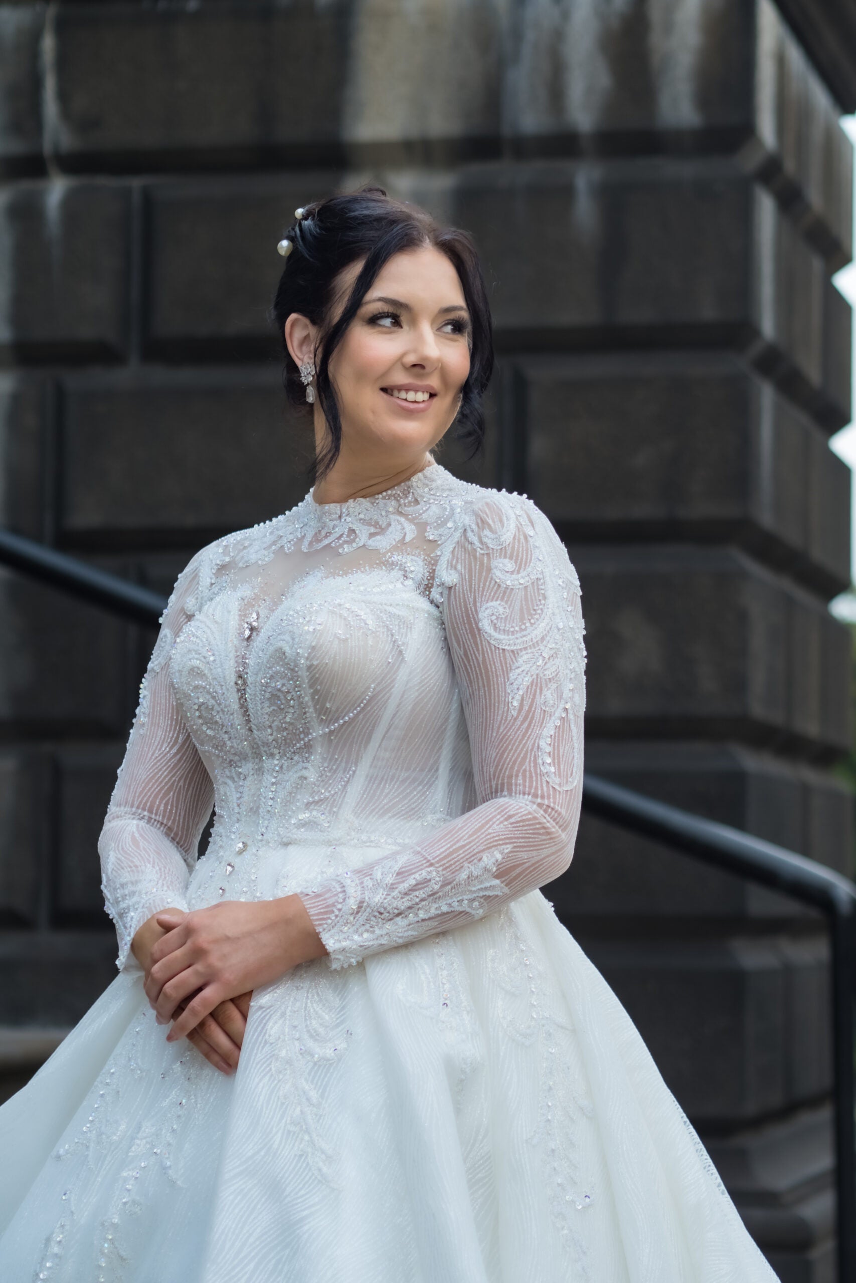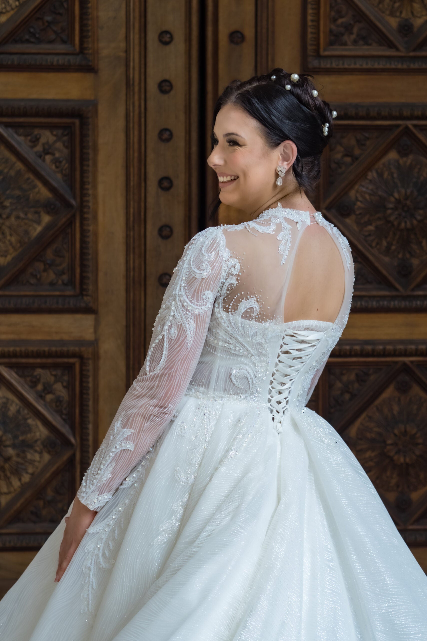 Exuding grace and regal charm, the Rosemarie Wedding Gown is a dream come true for the bride who adores classic romance. Featuring a delicate high illusion neckline with intricate lace appliqués, this gown embodies sophistication and refinement. The long sheer sleeves adorned with floral lace details enhance its ethereal elegance, while the structured bodice with corset support ensures a flattering fit.