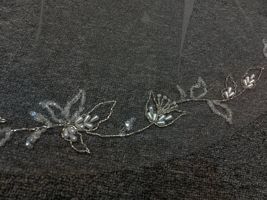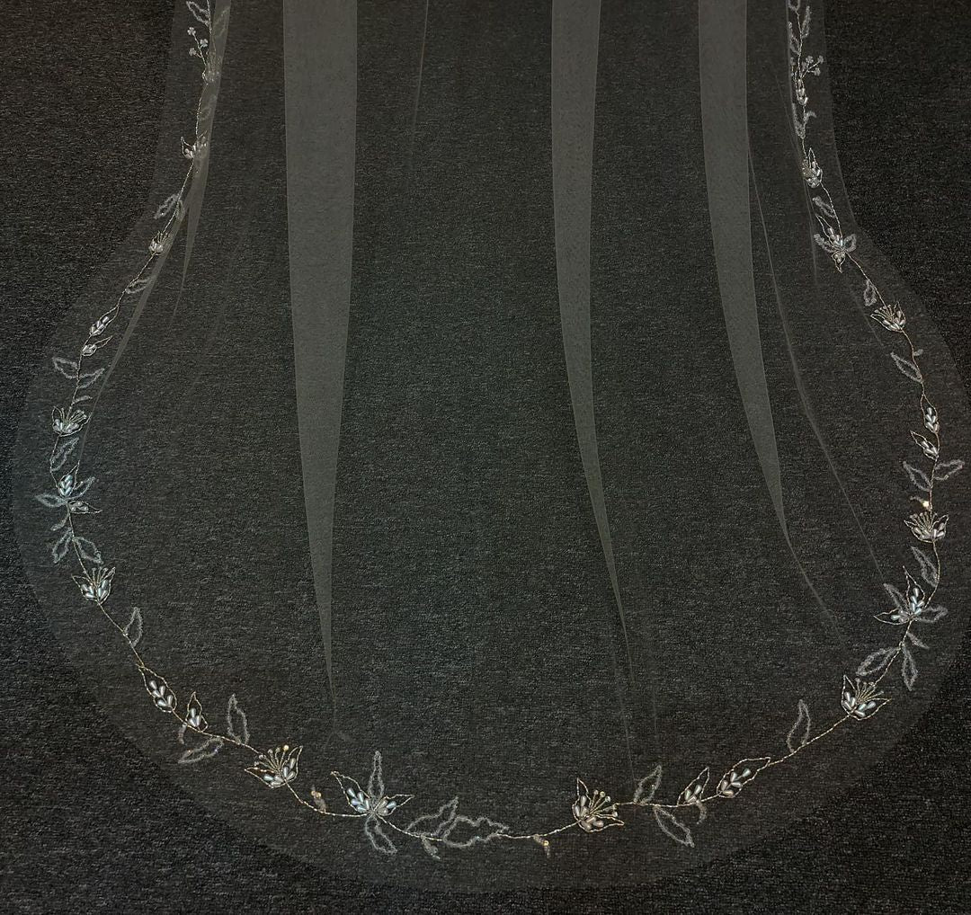 Elevate your bridal style with our Phoebe Floral Beaded Veil, featuring hand-beaded floral edging that graces the lower third of the veil. Crafted from soft tulle, this exquisite accessory is exclusively available through our online store, providing you with a unique and convenient option for your special day.