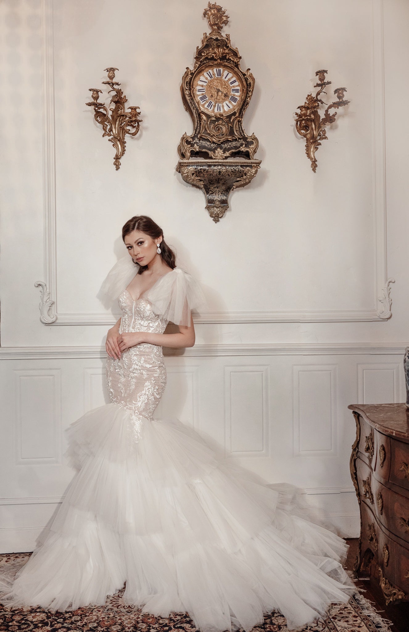 The bodice is adorned with sequined floral lace, creating a corset-like appearance that cinches the waist and enhances the mermaid silhouette's curve-hugging allure. This intricate detailing transitions into three tiers of dramatic gathered tulle, adding volume and emphasizing the bride’s figure.
