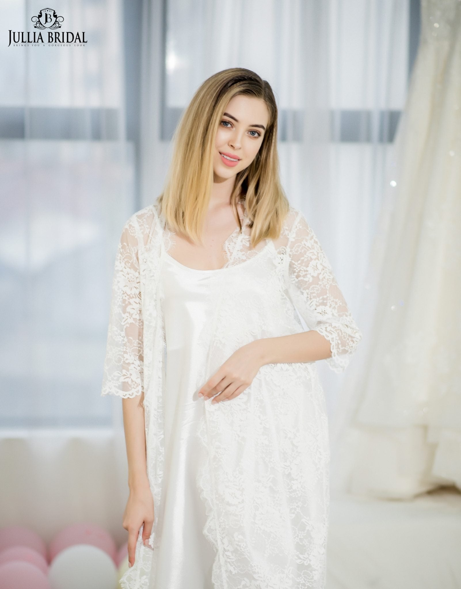 Our Stardust lace robe is delicate and dainty. This pretty robe complete with full lace and finish with a satin ribbon belt. Behold the inner “Beautiful lady”, this glamorous intimate is anything but ordinary. It's perfect for a pre-wedding robe, or perhaps an everyday gown to make each day special. Available in long version too.