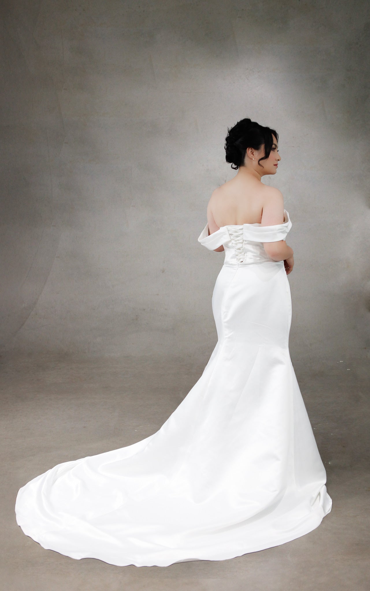 Step into timeless elegance with the Lucina wedding dress, a stunning trumpet-style gown that beautifully hugs your curves and flows gracefully into a long, dramatic train. Featuring a flattering sweetheart neckline and delicate off-the-shoulder straps, this dress combines classic charm with modern sophistication. Crafted from luxurious full satin, Lucina offers a smooth, sleek finish that feels as exquisite as it looks. The unique front closure and subtle V-shaped waistline enhance your silhouette, while the lace-up back ensures a perfect, customized fit. Perfect for brides dreaming of a gown that’s both elegant and unforgettable—Lucina is ready to make your special day truly magical.