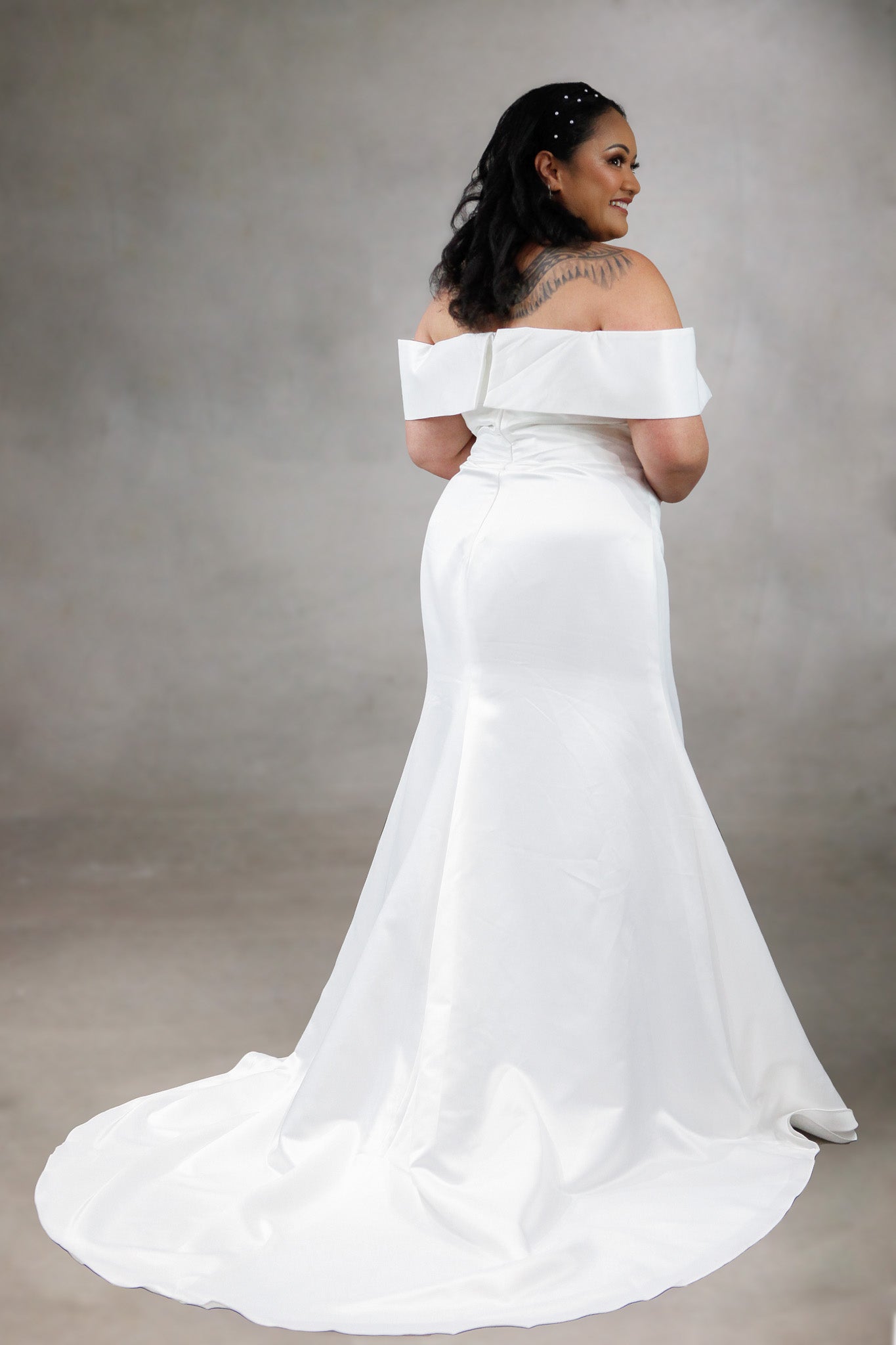 Florine is the epitome of timeless elegance, designed for the bride who dreams of making a graceful yet unforgettable entrance. Crafted from luxurious full satin, this trumpet-style gown beautifully contours the body before flaring into a sophisticated sweep train. The flattering sweetheart neckline and delicate off-shoulder straps add a romantic charm, while the graceful folding details at the waist sculpt the figure with refined artistry. Minimalist in design yet rich in sophistication, Florine is the perfect blend of classic beauty and modern refinement—sure to make you feel radiant from the first step down the aisle to the last dance of the night.