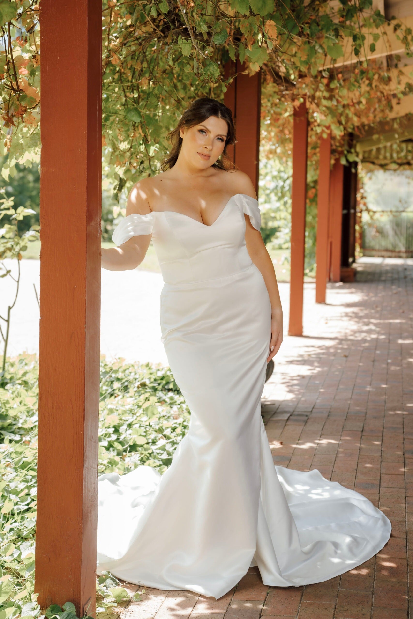 "Serena" is crafted from luxurious satin, boasting a smooth and lustrous finish that contours the body's natural curves and flows into a flared trumpet skirt. This design adds just the right amount of drama to the bride's movements, while the fabric's elegant sheen ensures she looks radiant from every angle.