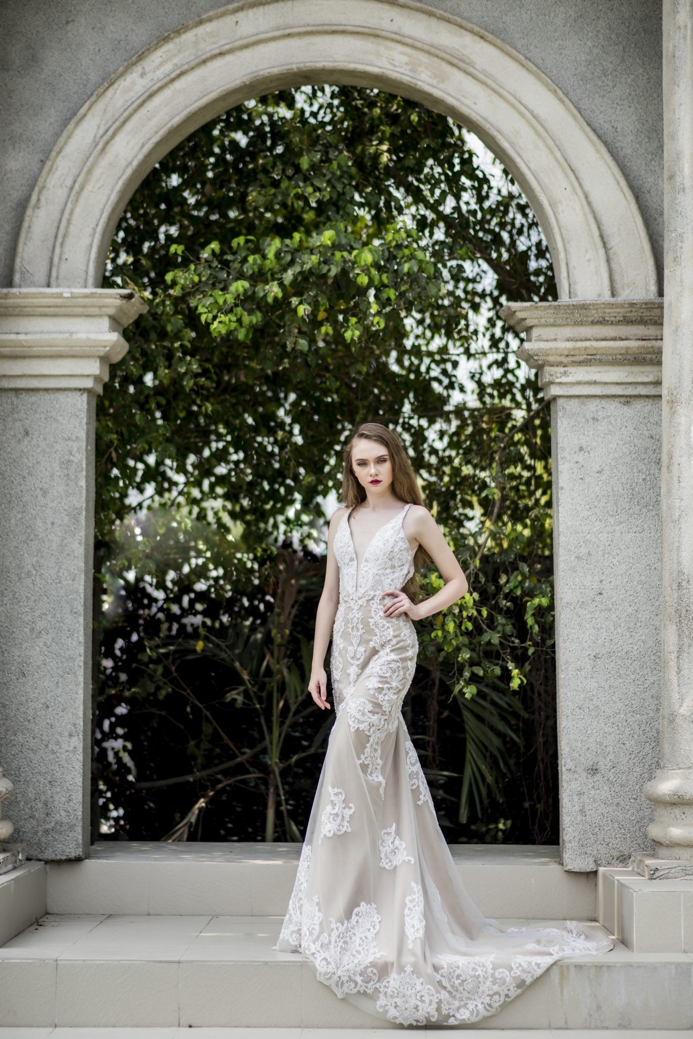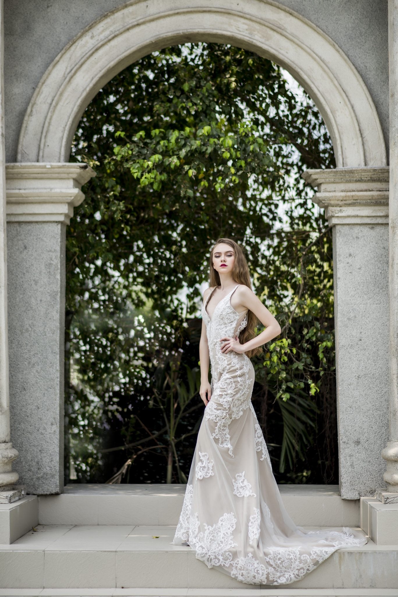Jullia Bridal presents a luxurious mermaid gown adorned with beaded and sequined Venice lace, offering a sleek and sexy silhouette. The plunging V-neckline and daring low back add alluring sophistication, perfectly showcasing your figure. This gown is designed to make a bold and glamorous statement on your special day.